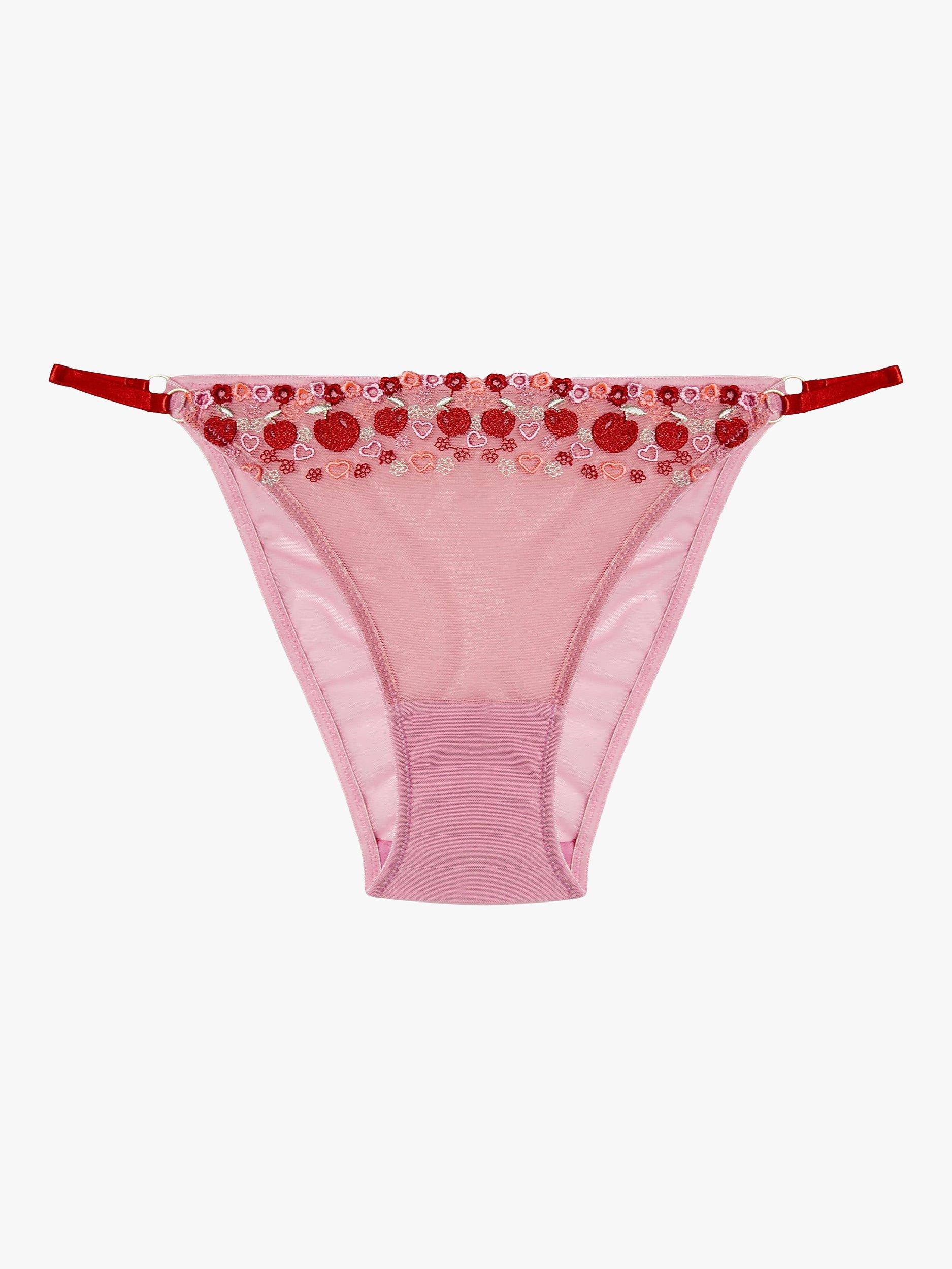 The Charli bikini knickers give off flirty floral vibes. Constructed from candyfloss pink sheer mesh with red accents and cherry floral embroidery wear it with the matching Charli bra and suspender belt to complete the set.