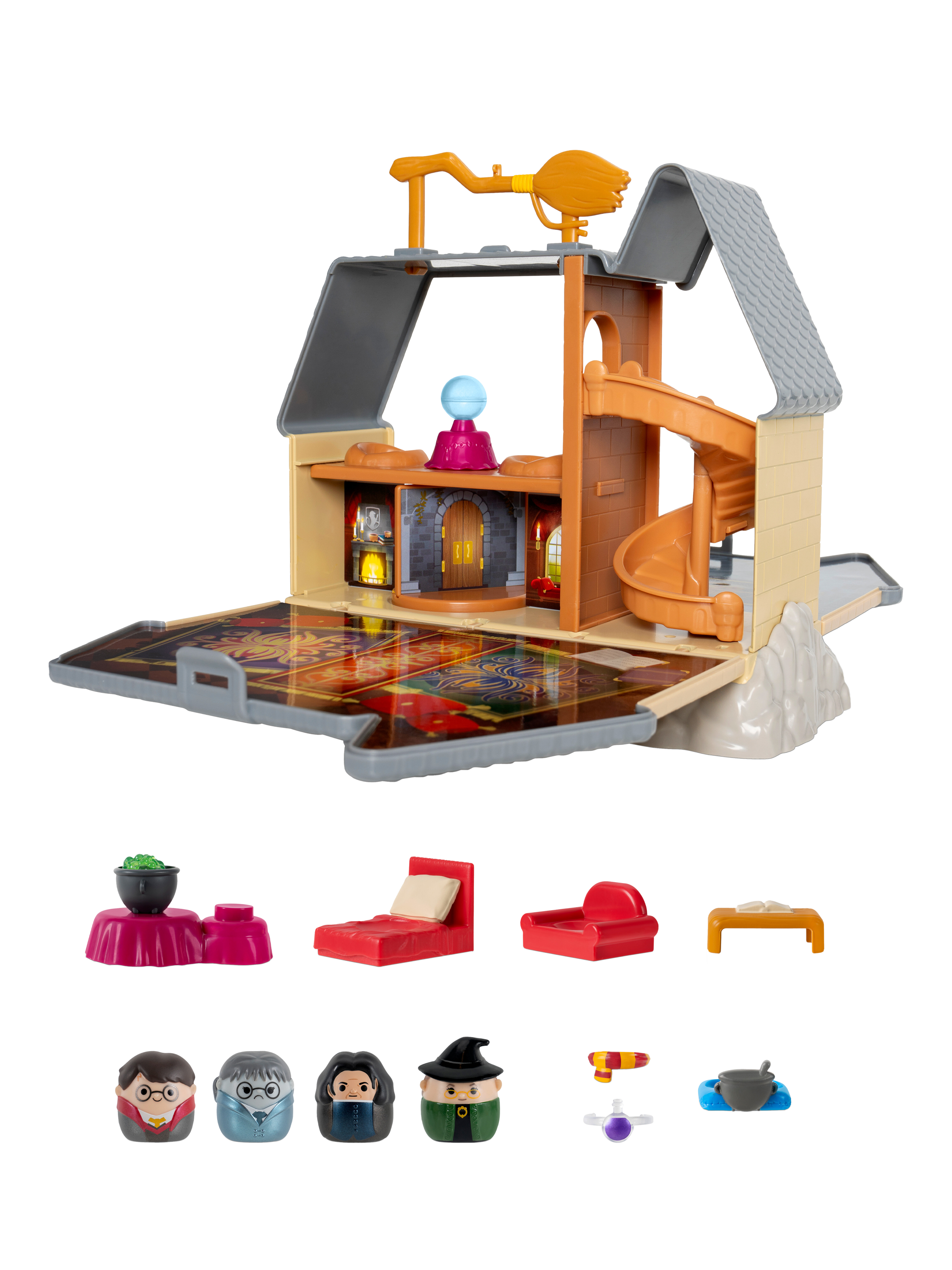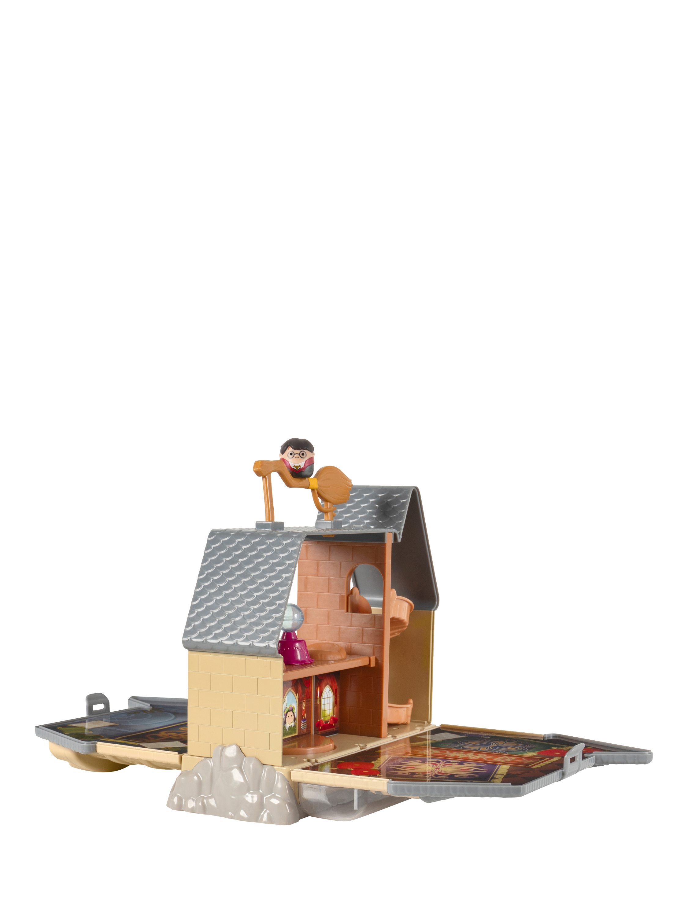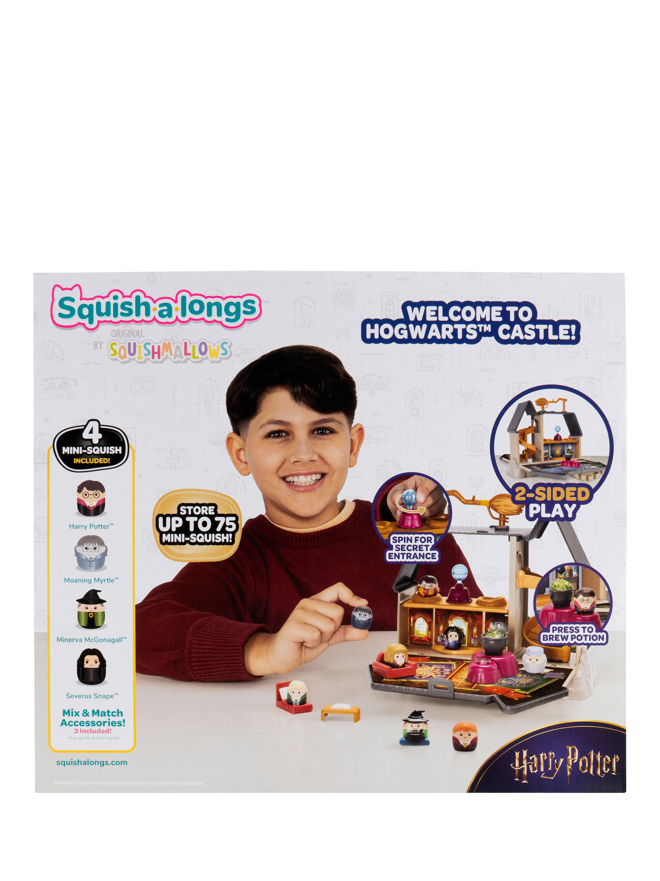 Inspired by the iconic Hogwarts Castle, this large, official Harry Potter Squish-a-longs playset includes four plastic Mini-Squish figures of Severus Snape, Harry Potter, Minerva McGonagall and Moaning Myrtle.