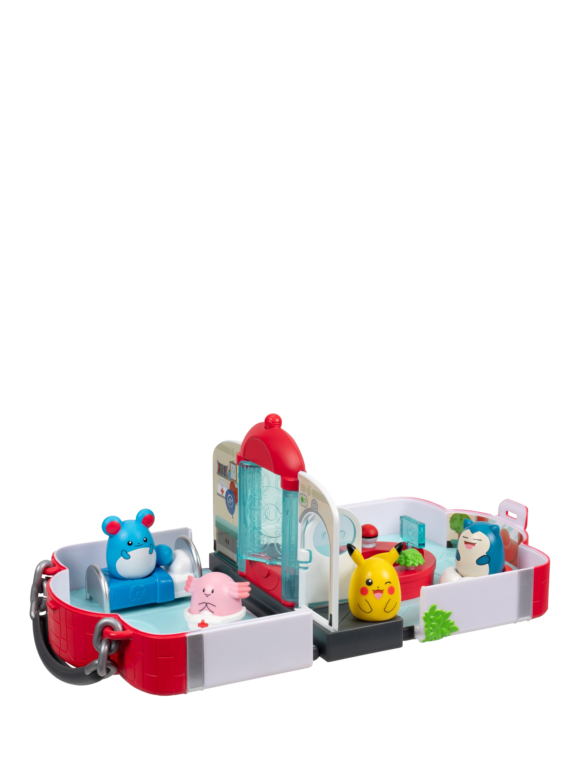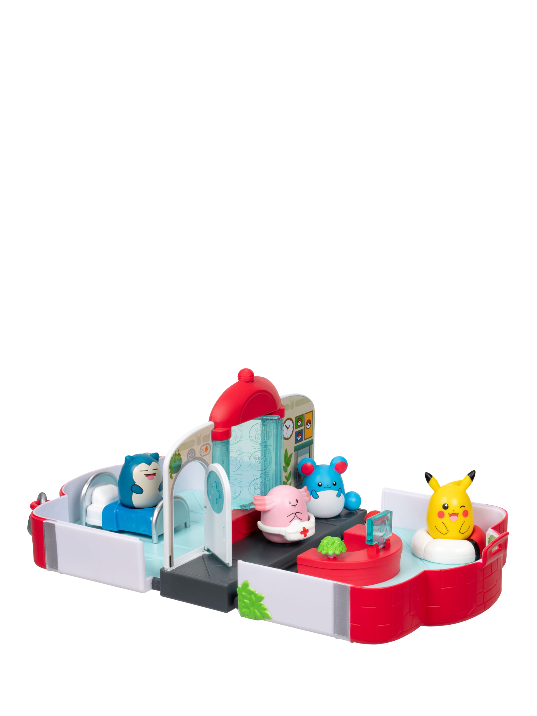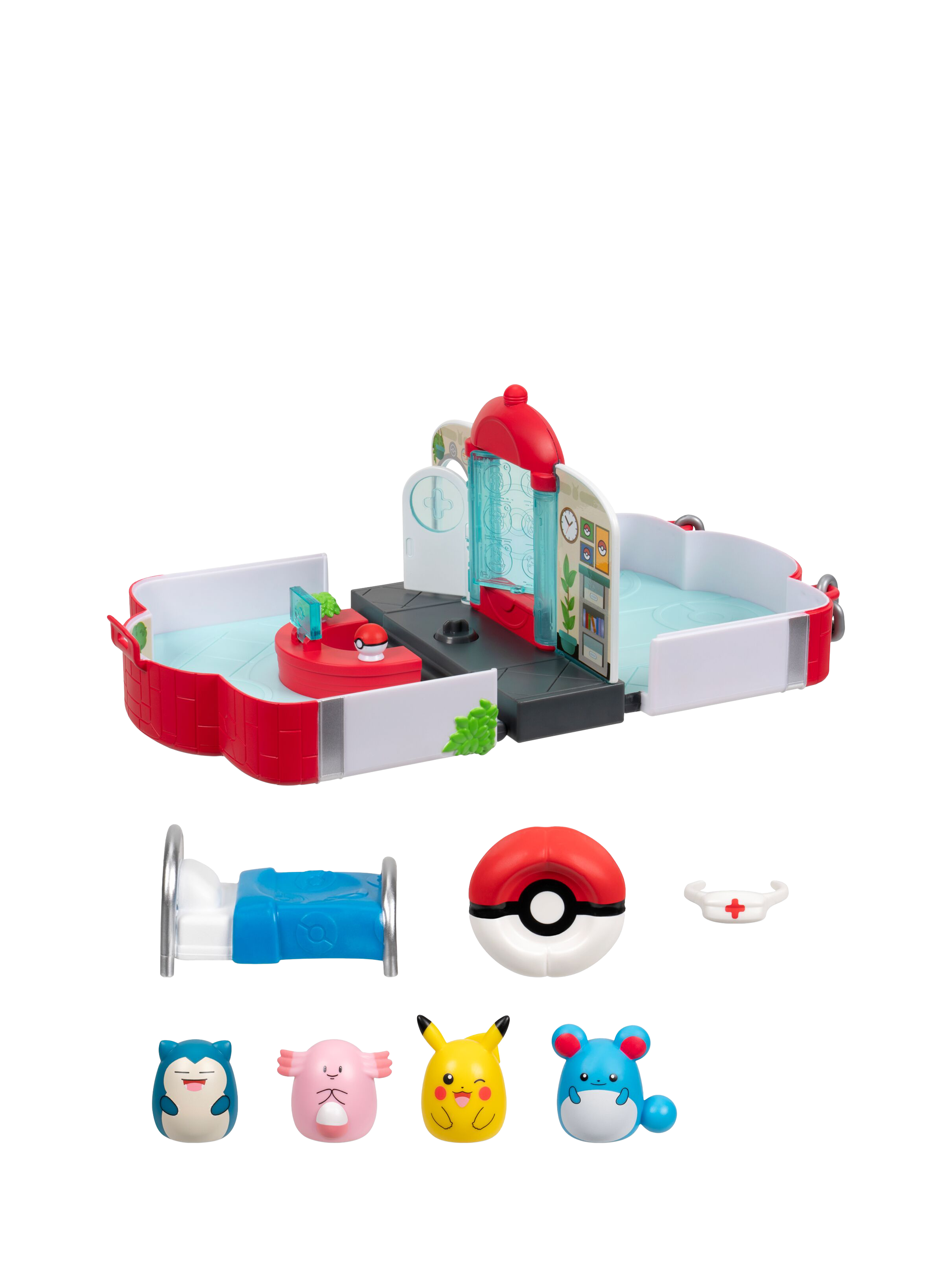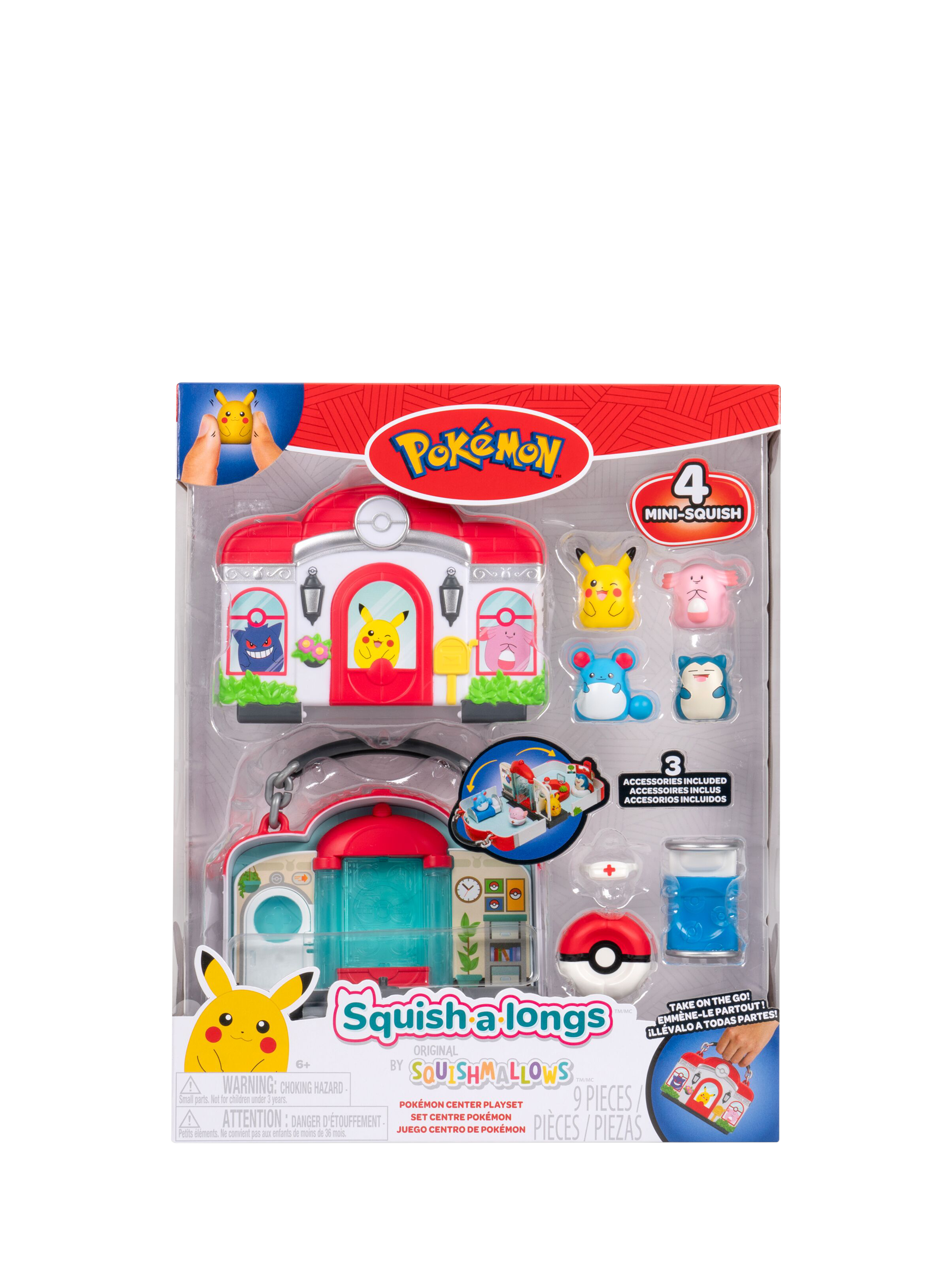 Inspired by the iconic Pokémon Centre fans know and love, this official Pokémon Squish-a-longs playset includes Mini-Squish Chansey, Marill, Pikachu, and Snorlax to play with or display.