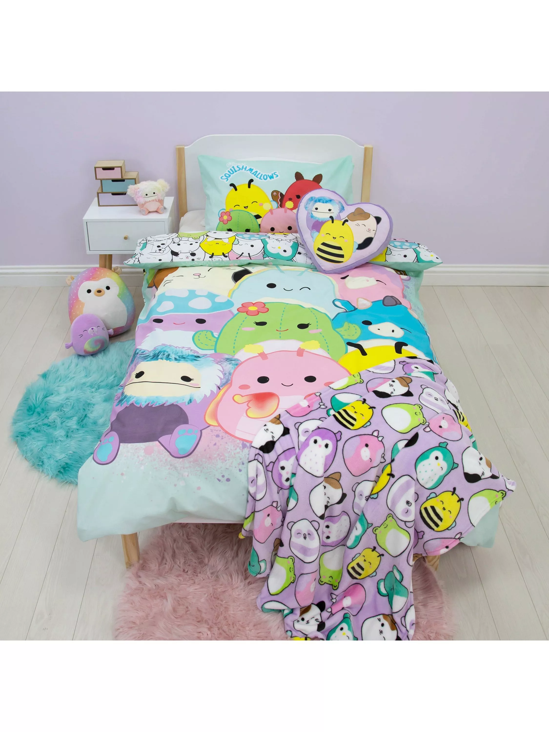 Reversible duvet cover and pillowcase set. The front side features a large print of multiple Squishmallows, including Cam the Cat, Winston the Owl, Patty the Cow, and Wendy the Frog, on a blue background with spray paint spots and ‘Squish Squad’ tag. The reverse side features a repeating pattern of various monochrome and colour Squishmallows, including Winston, Cam, Wendy, and Sunny the Bee, with a matching pillowcase. Made from a polycotton mix to be soft and comfortable, with popper fasteners.