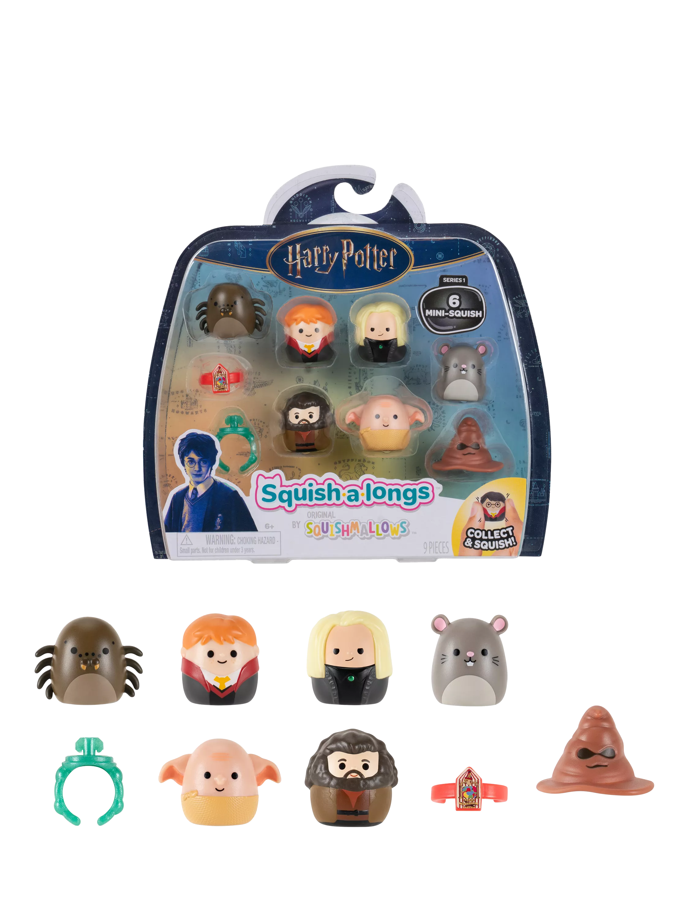 Cast a spell on your Squad with “Harry Potter” Squish-a-longs! This Squish-a-longs multipack includes 6 “Harry Potter” Mini-Squish — Ron Weasley, Scabbers, Dobby, Lucius Malfoy, Aragog, and Rubeus Hagrid — in addition to Sorting Hat and Bertie Botts accessories for Mini-Squish styling. Play or display your “Harry Potter” Squish-a-longs at home, or attach your Mini-Squish to the included ring accessory to take the magic on the go!