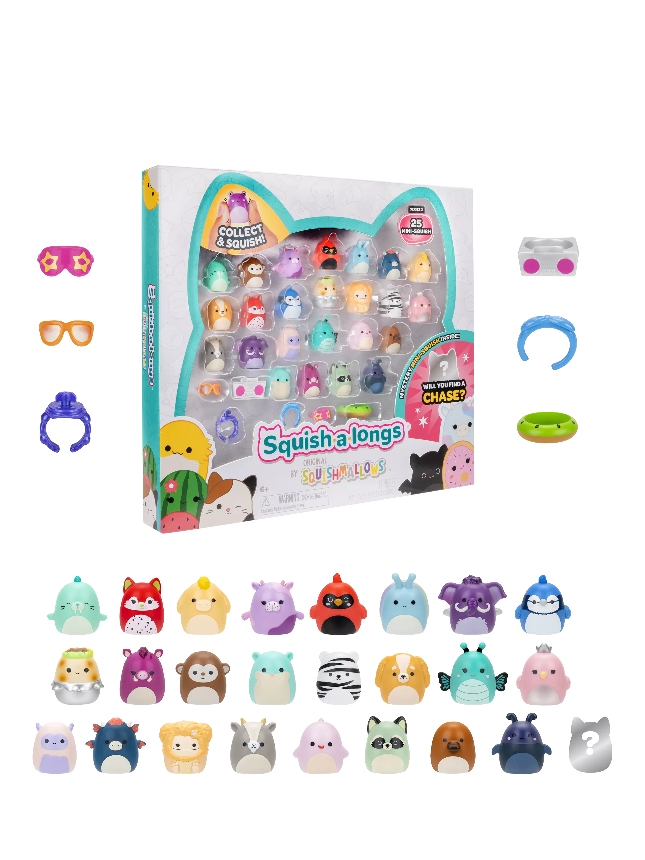 These adorable and oh-so-portable collectables, known as Squish-a-longs, are crafted from squeezable plastic and are a perfect 1-inch size for maximum squish appeal! The excitement knows no bounds, with over 350+ Mini-Squish to collect, trade, play with, wear, and proudly display! Showcase the trendy ring and accessorise your Mini-Squish with aviator glasses, a superhero mask, and more; the possibilities are endless!