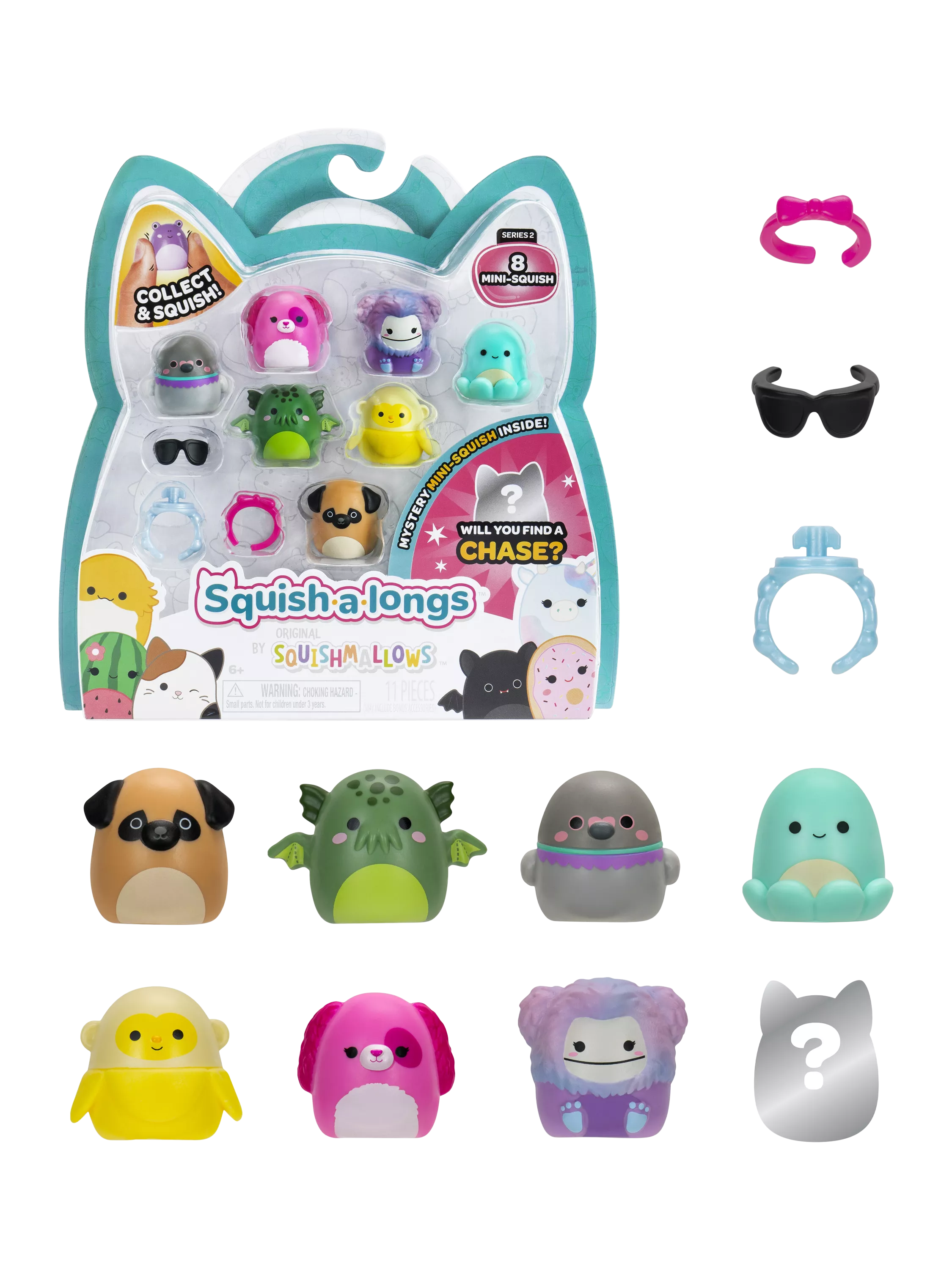 An adorable and portable collectable, Squish-a-longs Mini-Squish, made of squeezable plastic, is perfect with its 1-inch size! The fun is endless, with over 140+ Mini-Squish to collect, trade, play, wear, and display! Show off your fandom by wearing the ring and dressing your Mini-Squish with fun accessories like a headband and sunglasses.
