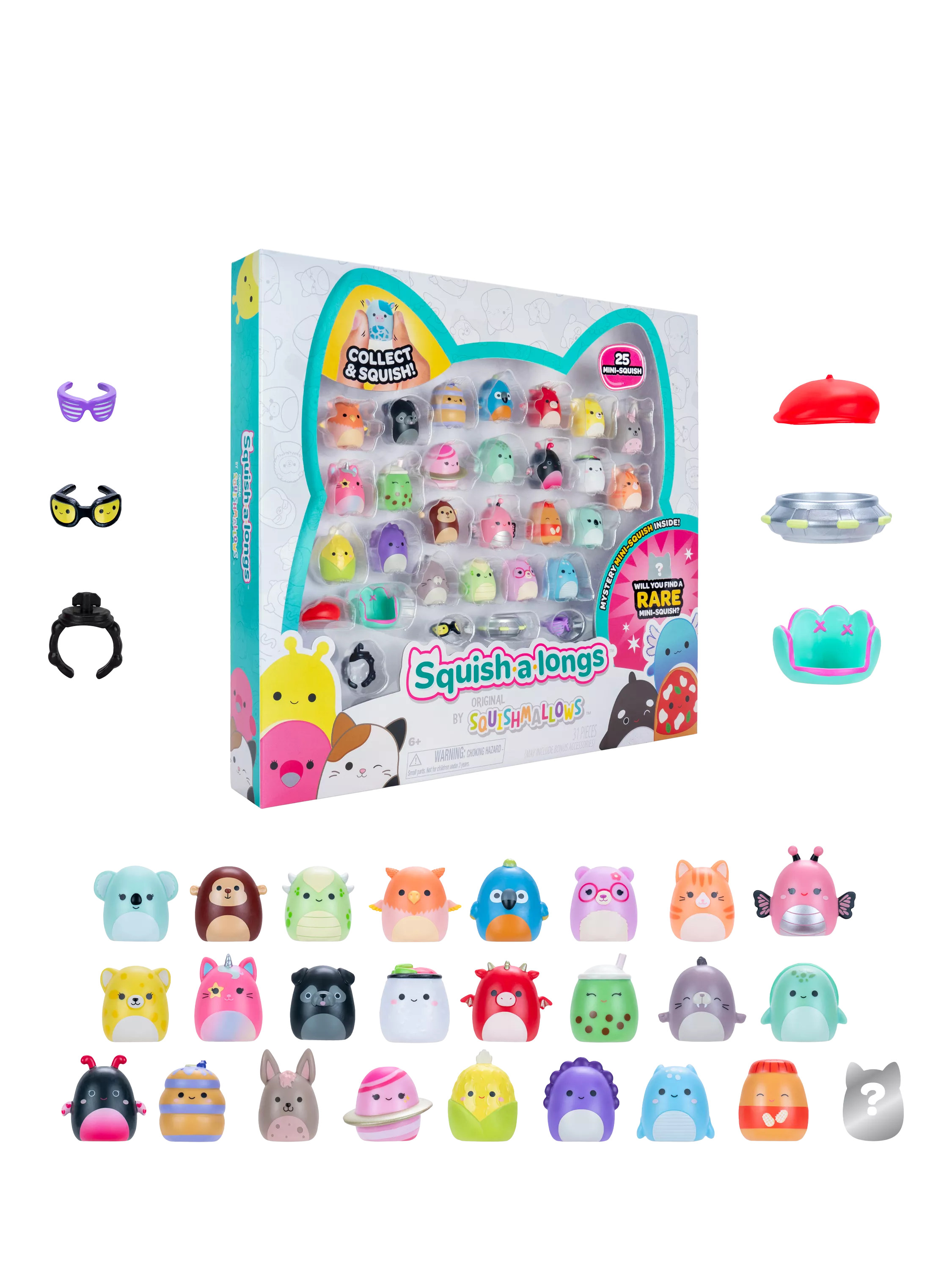 An adorable and portable collectable, Squish-a-longs Mini-Squish, made of squeezable plastic, is perfect with its 1-inch size! The fun is endless, with over 140+ Mini-Squish to collect, trade, play, wear, and display! Show off your fandom by wearing the ring and dressing your Mini-Squish with fun accessories like a headband and sunglasses.