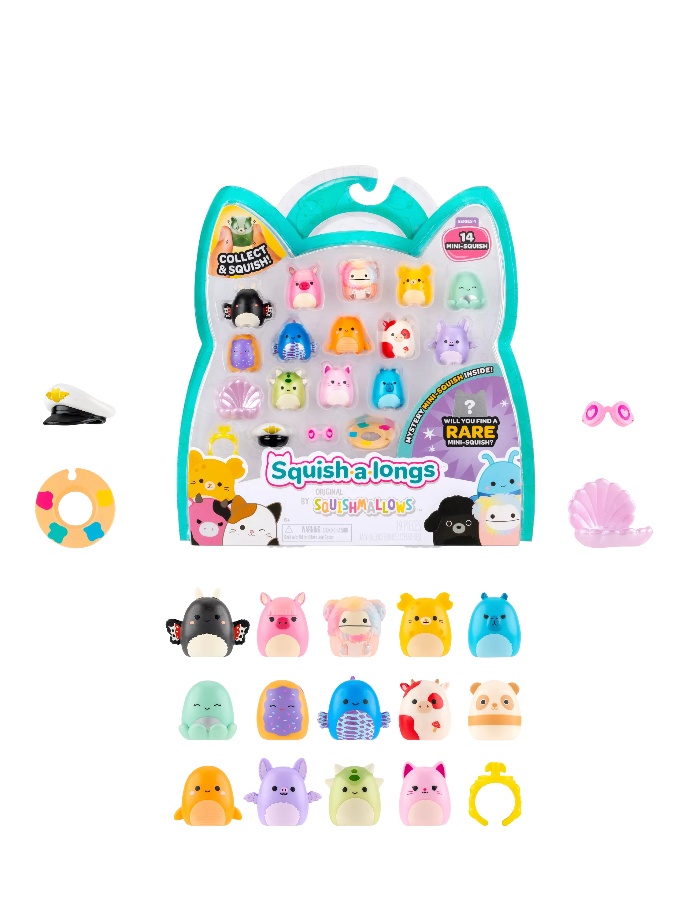 This Squish-a-longs 14-pack includes a Mini-Squish ring attachment for on-the-go Squish styling in addition to Heart Eyes Glasses, Flight Cap, Palette and Seashell accessories for Mini-Squish modelling. Feeling lucky? You might just come across X. Axis the Pastel Rainbow Clown or Junie the Chocolate-Dipped Banana, two chase Mini-Squish that are as adorable as they are rare! Collect them all with help from the numbered Squish-a-longs Collector's Guide and join the Squad today!