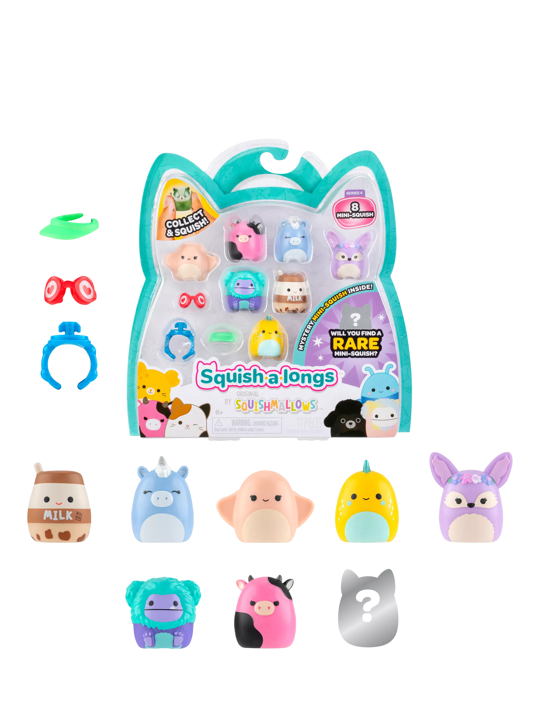 This Squish-a-longs eight-pack includes a Mini-Squish ring attachment for on-the-go Squish styling in addition to Visor and Heart Eyes Glasses accessories for Mini-Squish modelling.