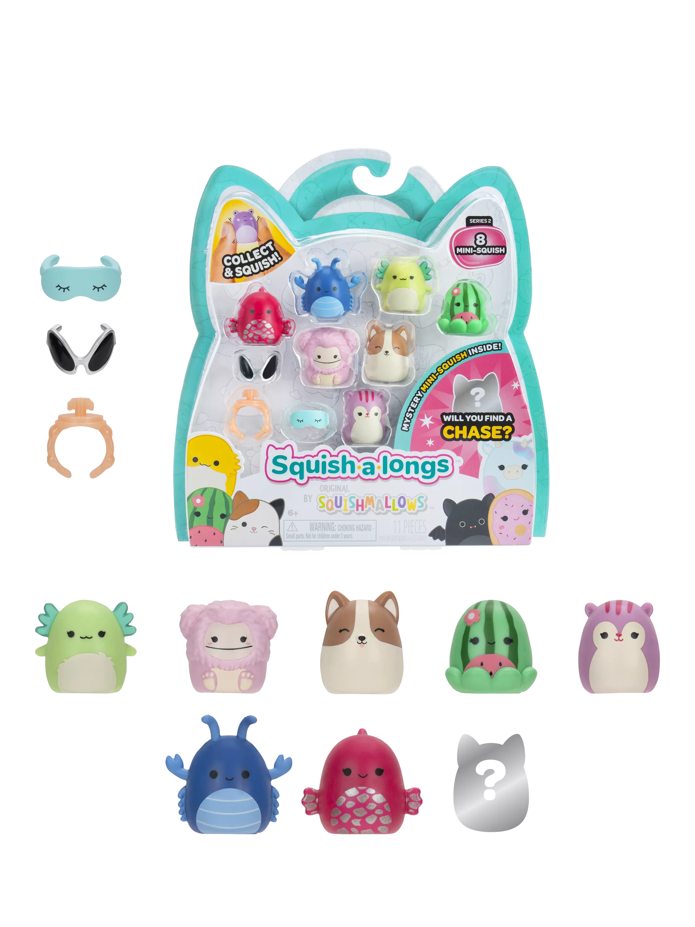 An adorable and portable collectable, Squish-a-longs Mini-Squish, made of squeezable plastic, is perfect with its 1-inch size! The fun is endless, with over 140+ Mini-Squish to collect, trade, play, wear, and display! Show off your fandom by wearing the ring and dressing your Mini-Squish with fun accessories like a sleeping mask or alien glasses.