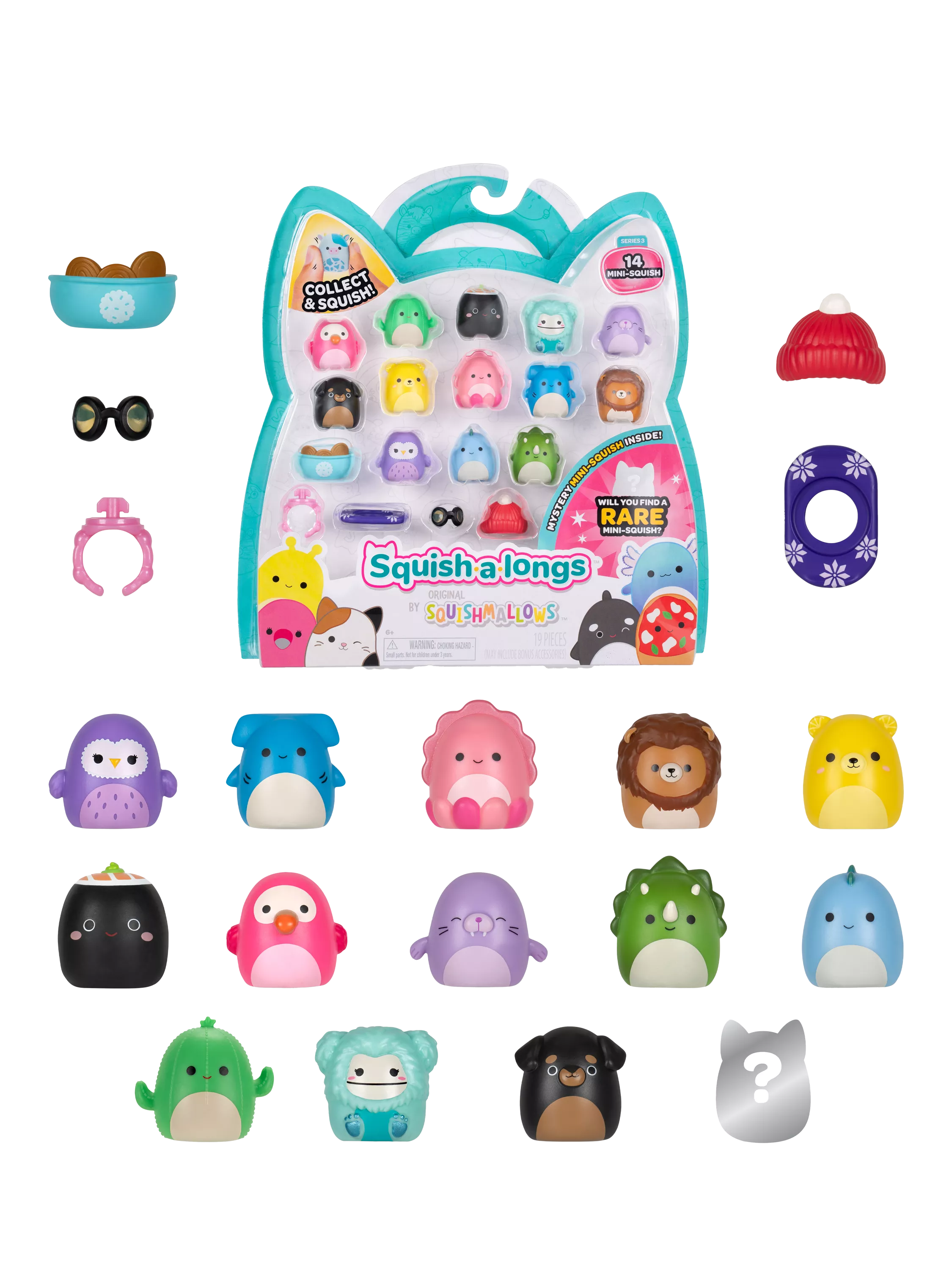 Collector's guide — Use the numbered Squish-a-longs Collector's Guide to collect all Wave 3 styles; with 140+ Mini-Squish to collect, trade, or wear, the Squish might be small, but the possibilities are endless!