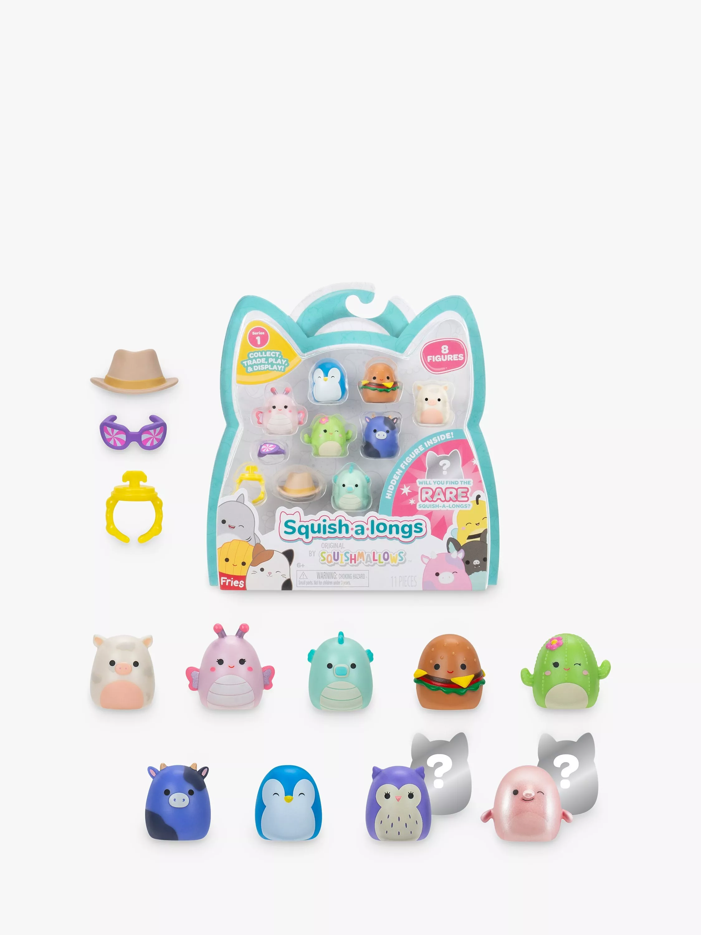Get ready for a new level of squish with Squish-a-longs, the latest addition to the Squishmallows family! An adorable and portable collectible, Squish-a-longs Mini-Squish, made of squeezable plastic, is perfect with its 1-inch size! The fun is endless, with over 140+ Mini-Squish to collect, trade, play, wear, and display! Show off your fandom by wearing the ring and dressing your Mini-Squish with fun accessories like the included glasses and cowboy hat. You can ensure you get them all with the helpful collector's guide. Take advantage of the ultimate Squish fun - start your Mini-Squish collection today!