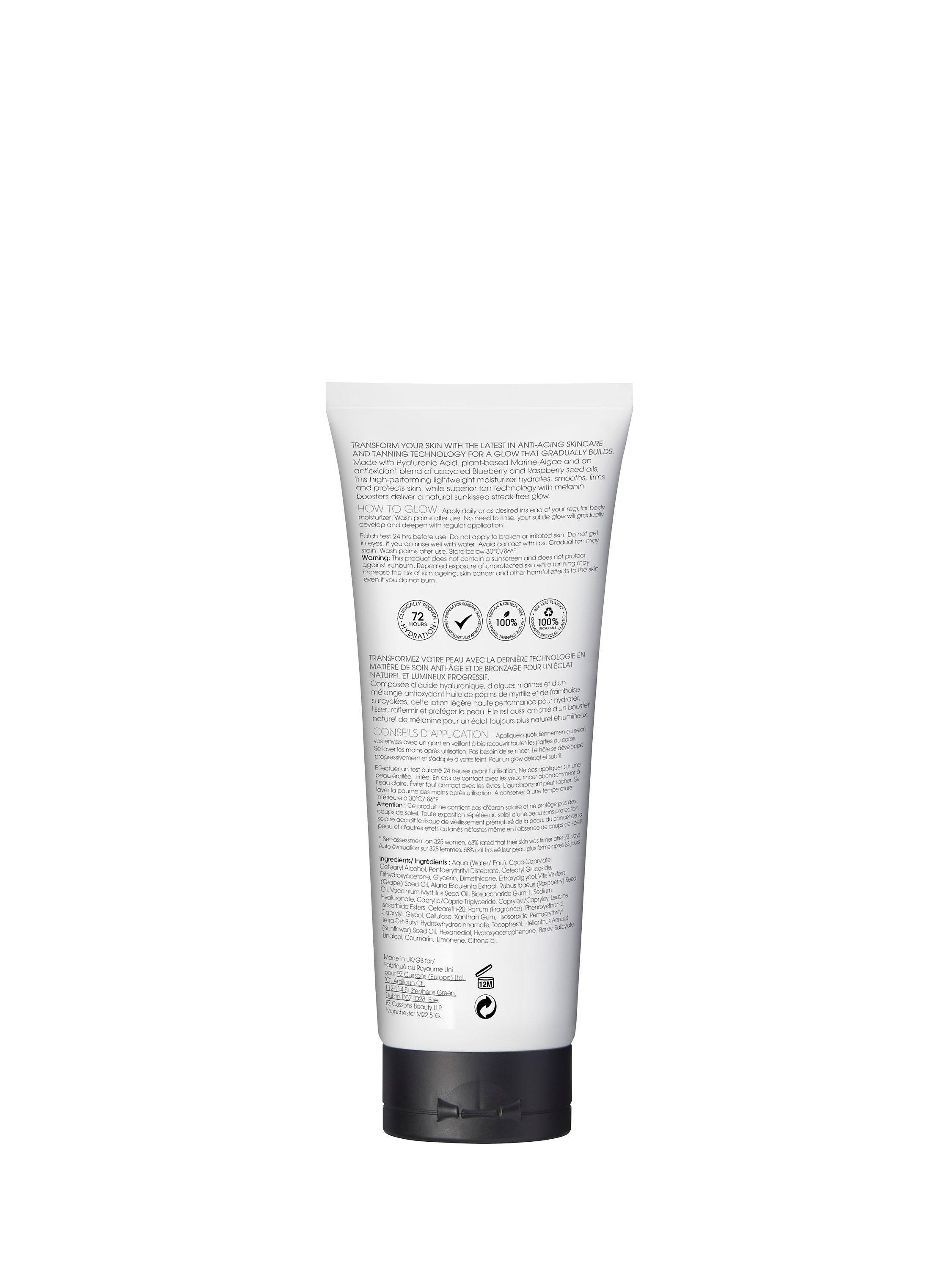Made with high molecular weight Hyaluronic Acid, plant-based Marine Algae and an antioxidant blend of upcycled Blueberry and Raspberry seed oils, this high-performing lightweight moisturizer combined with superior tan technology and melanin boosters delivers a natural sunkissed streak-free glow.