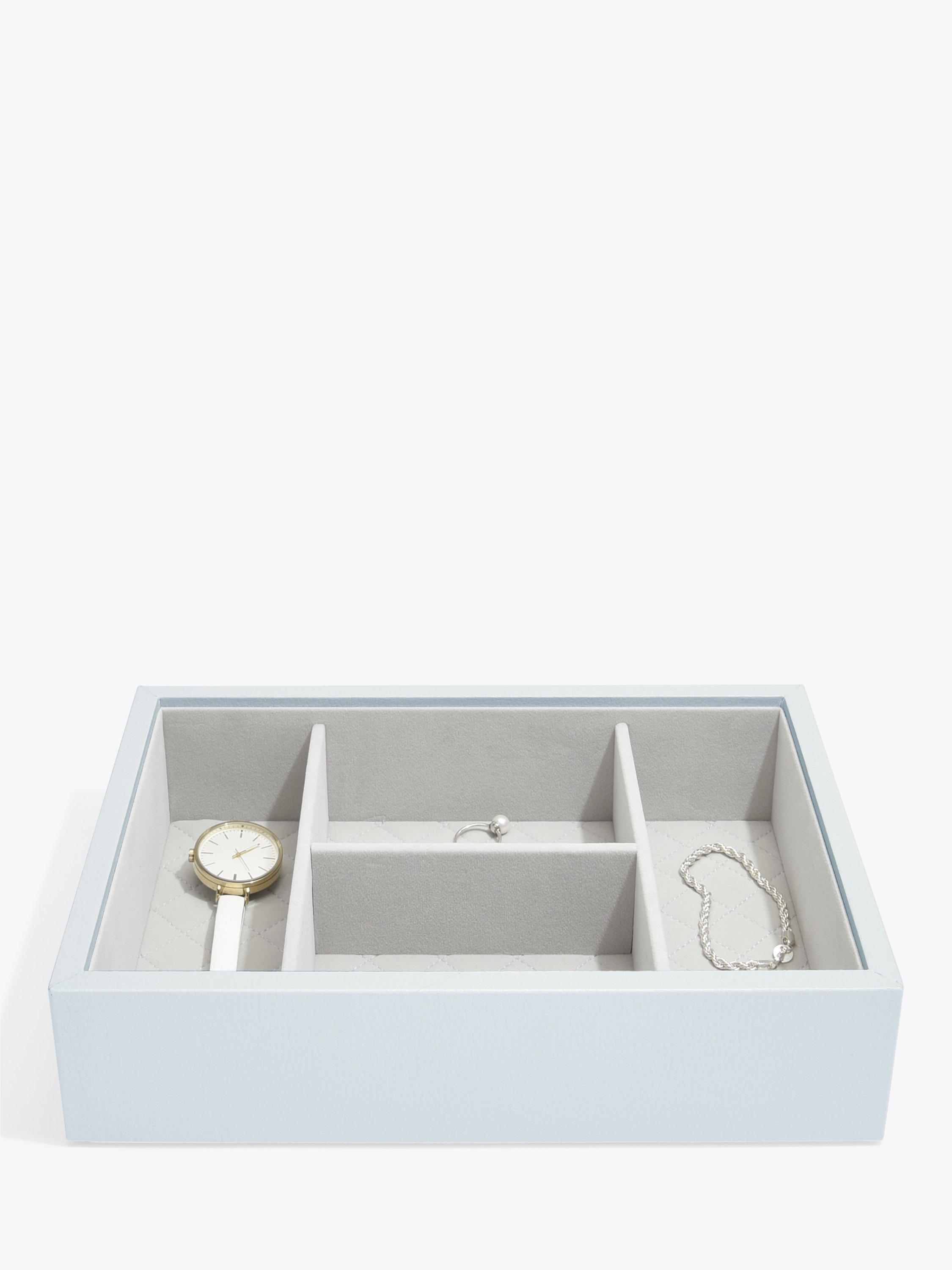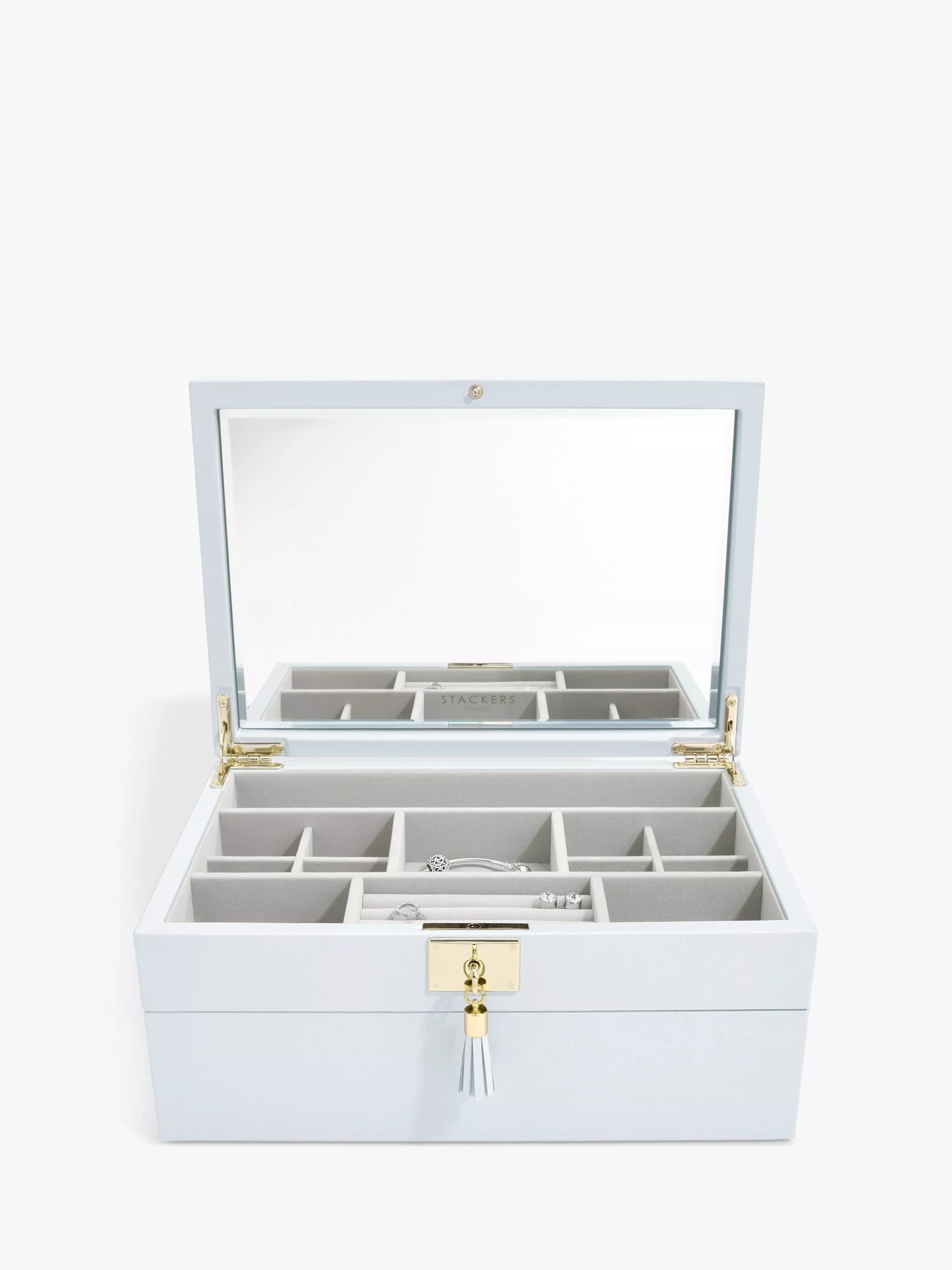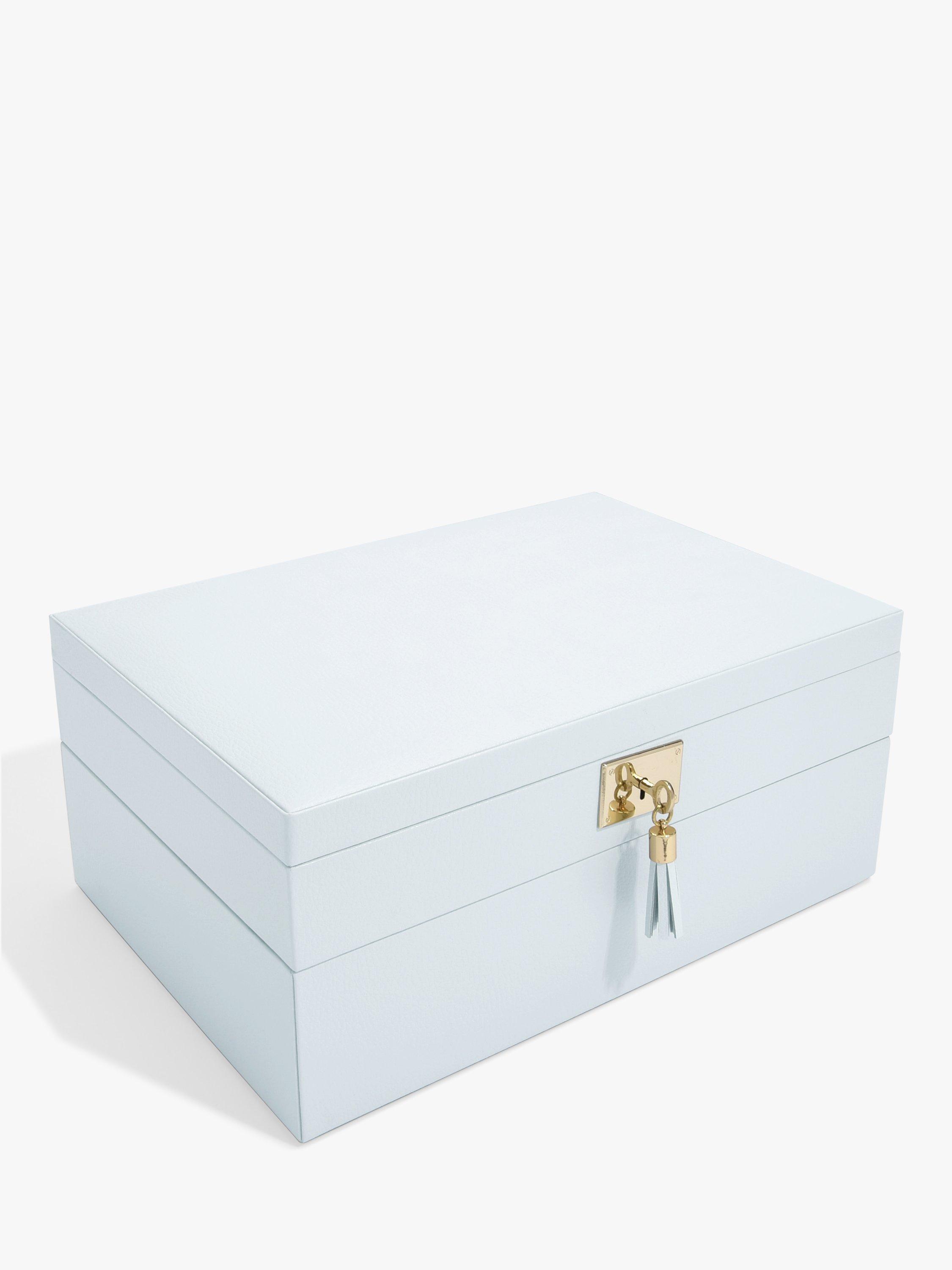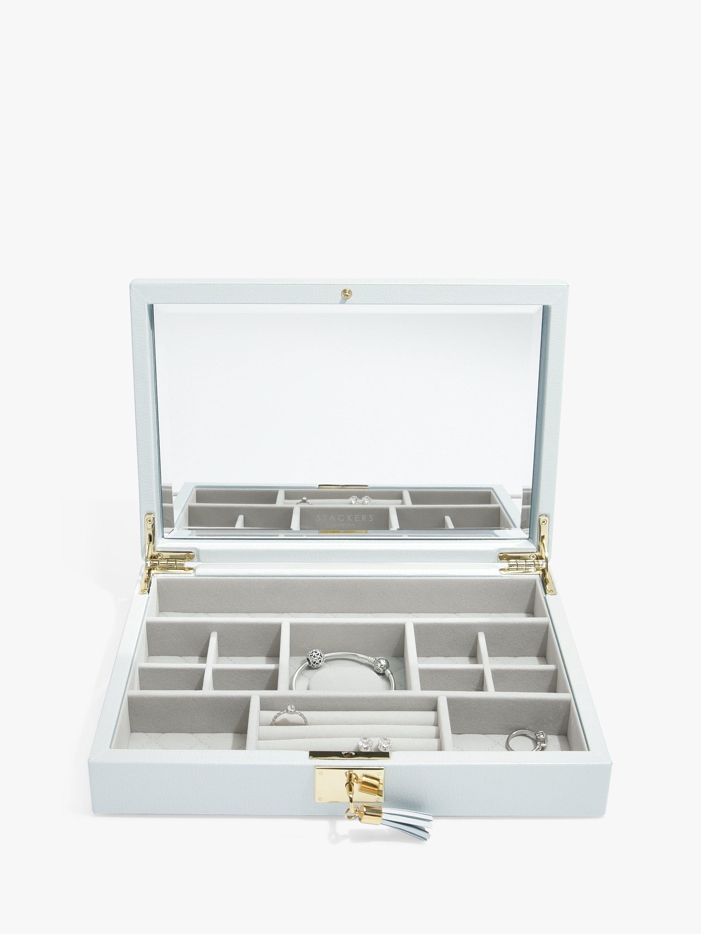 This set includes the lid with a fitted ring roll and 12 storage sections complete with an interior mirror and finished with gold detailing as well as a lock with leather tasselled key. Additionally, the Watch/Accessory layer is perfect for housing your larger jewellery pieces such as bangles and watches, keeping your jewellery easily accessible and satisfyingly organised.