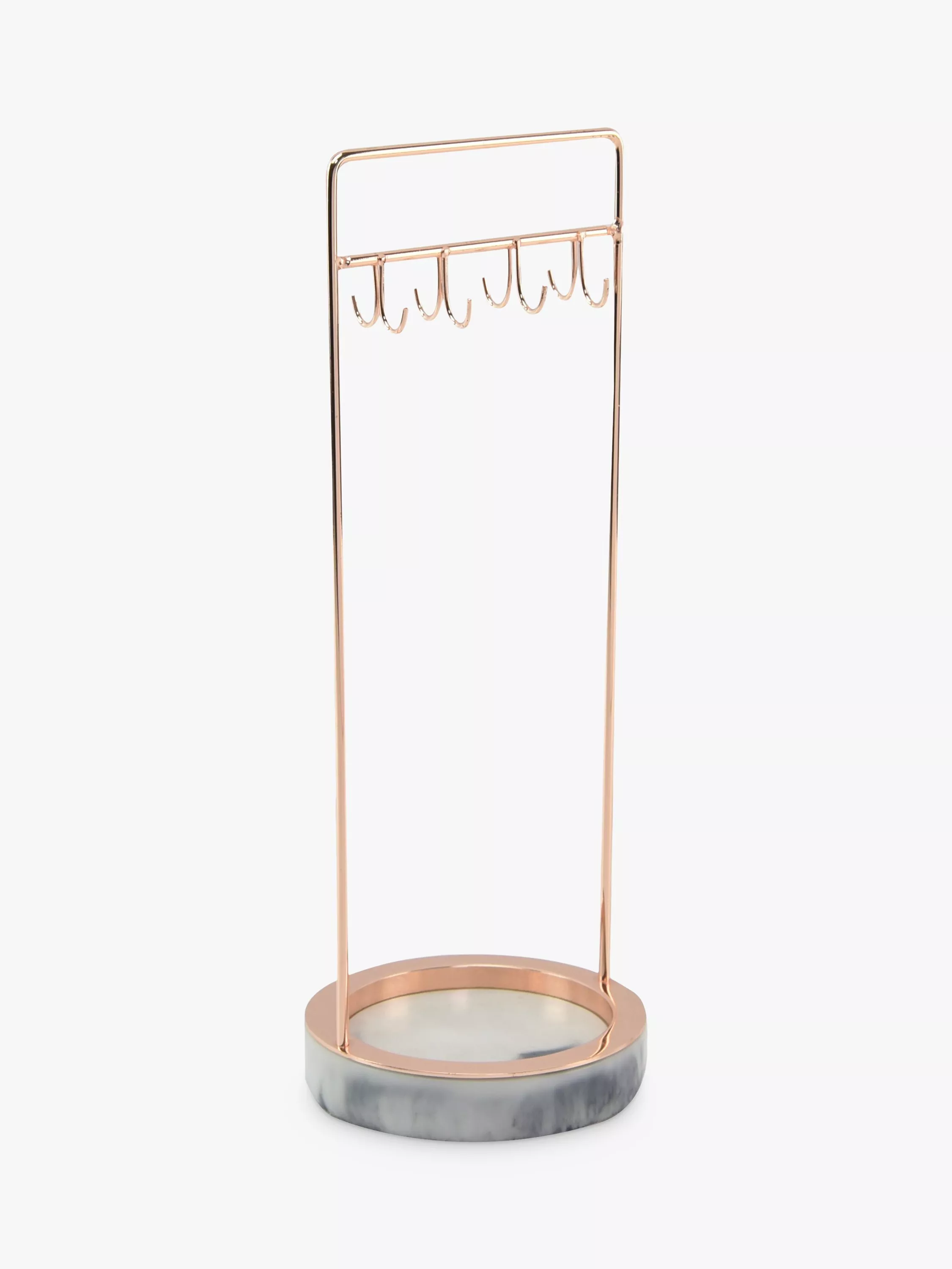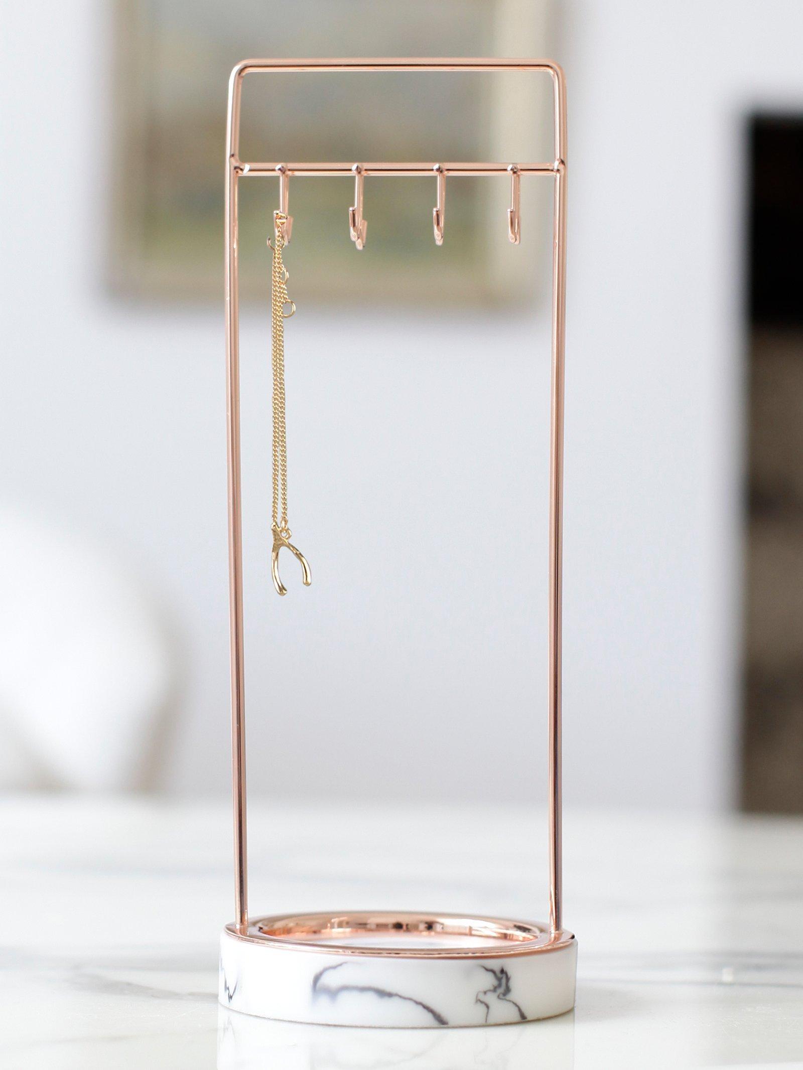 Hang necklaces or watches from the hooks complete with a rose gold finish, and safely keep rings and smaller items in the marble-effect base.