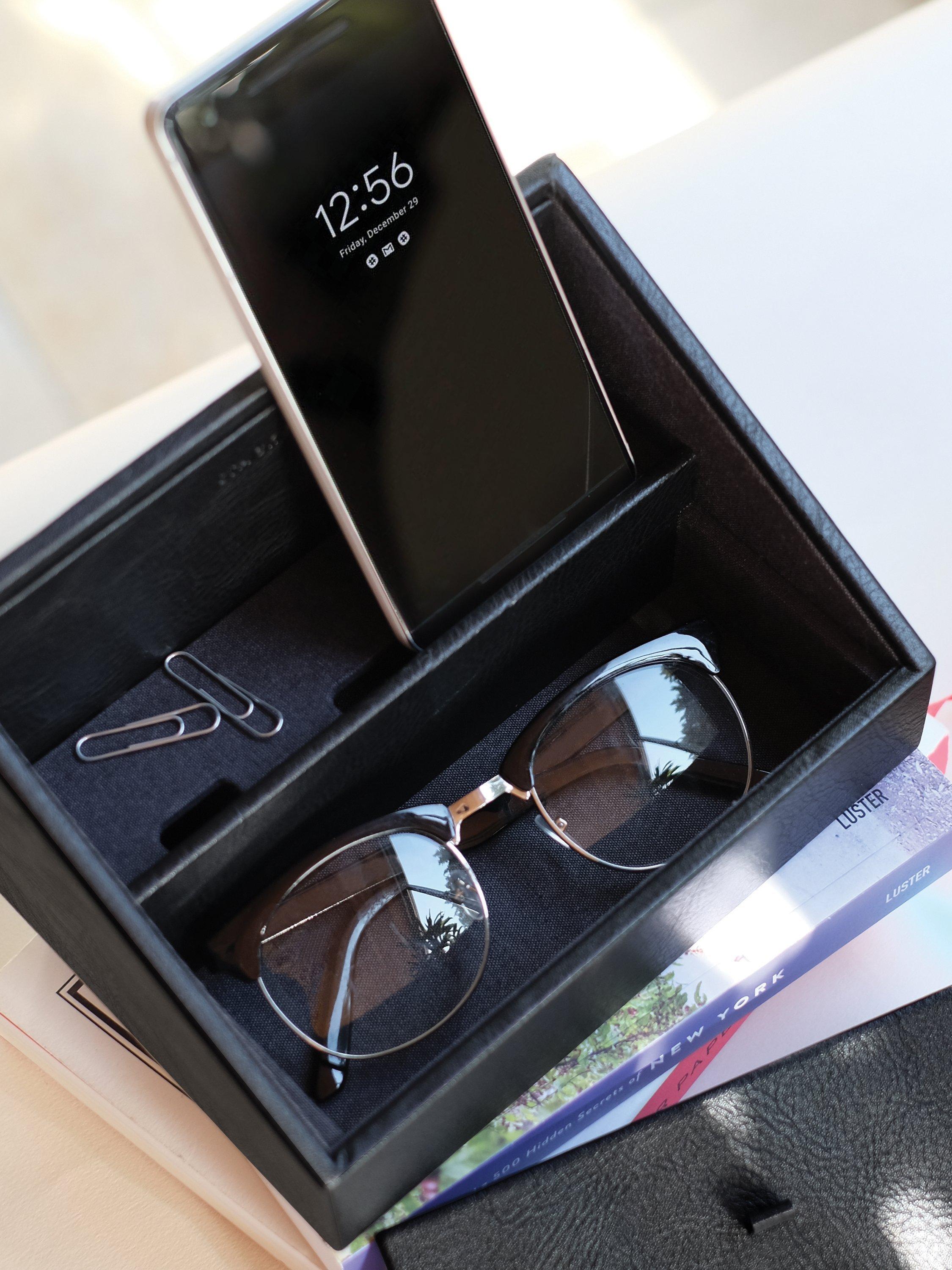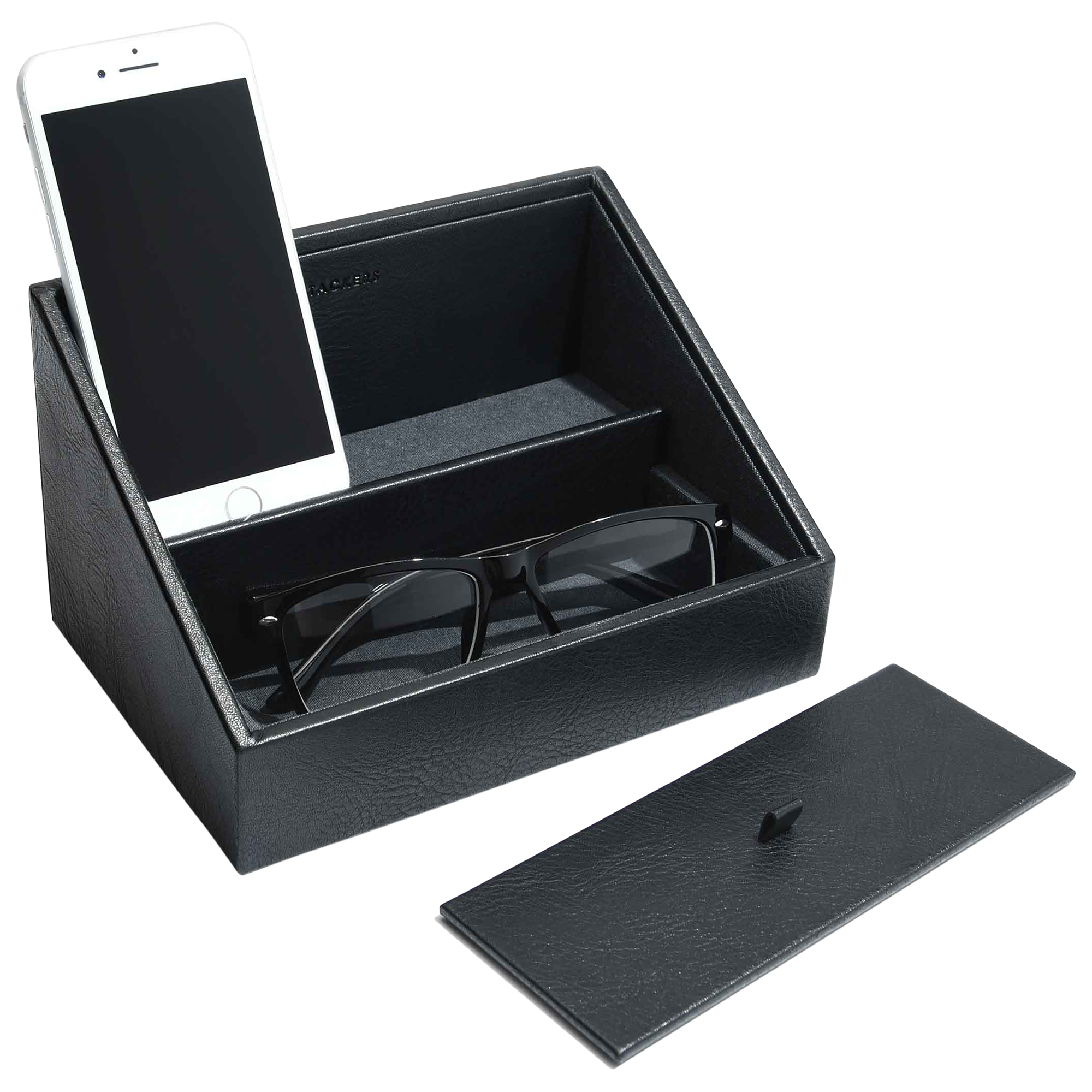There is cable access for Smart phones, Kindles, Tablets etc. and a removable lid for additional storage for glasses and other accessories.