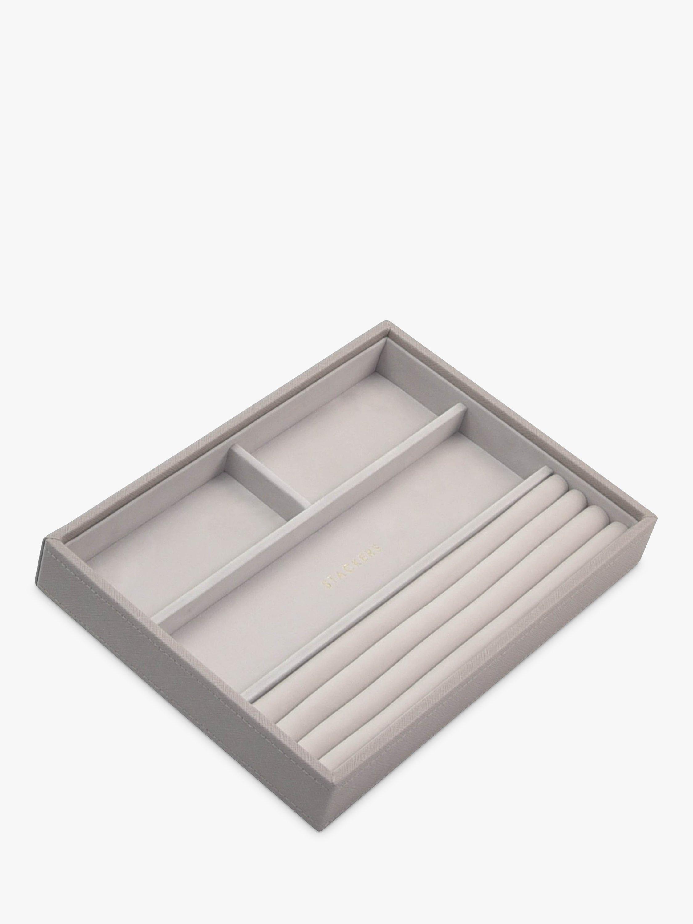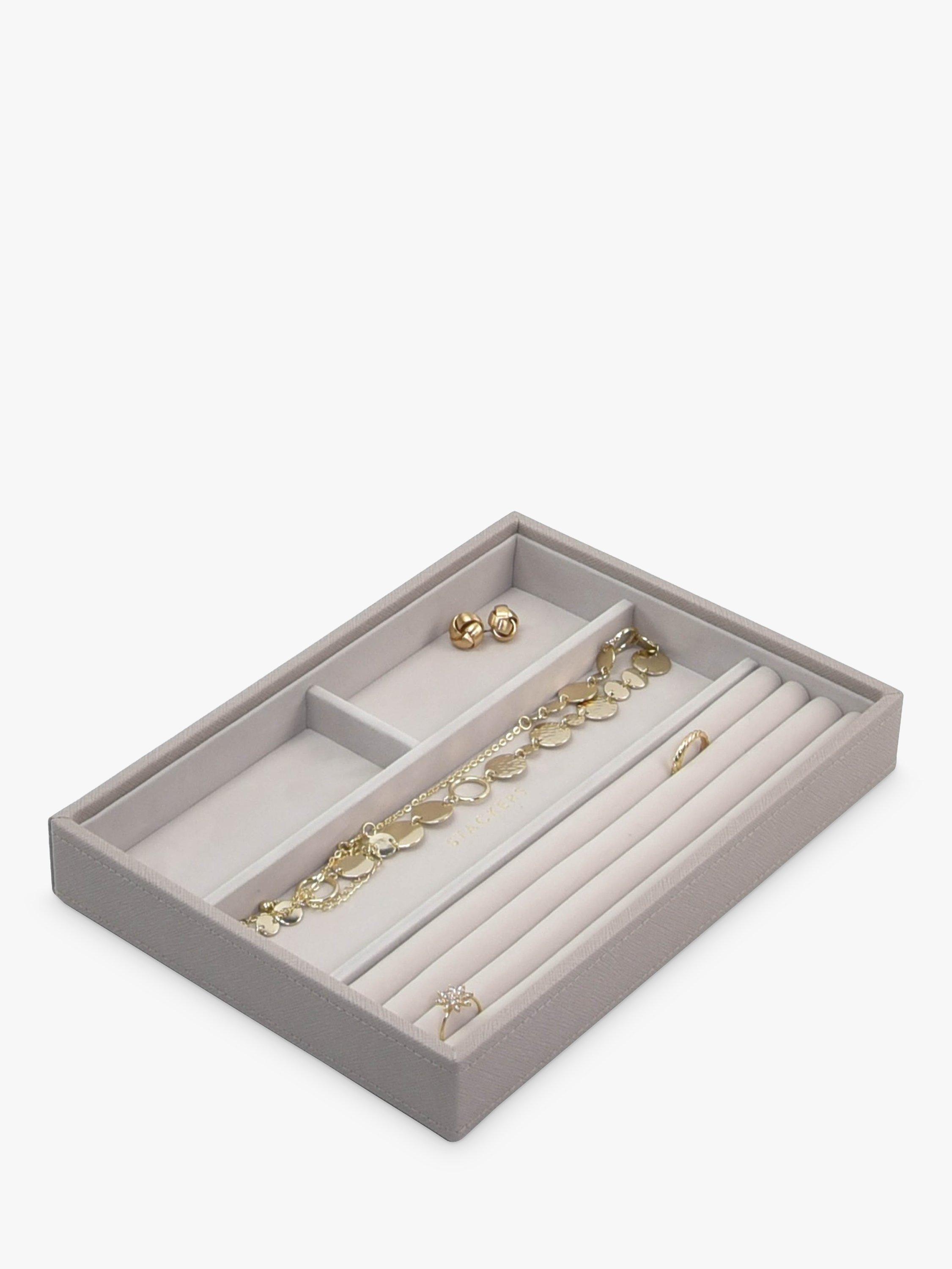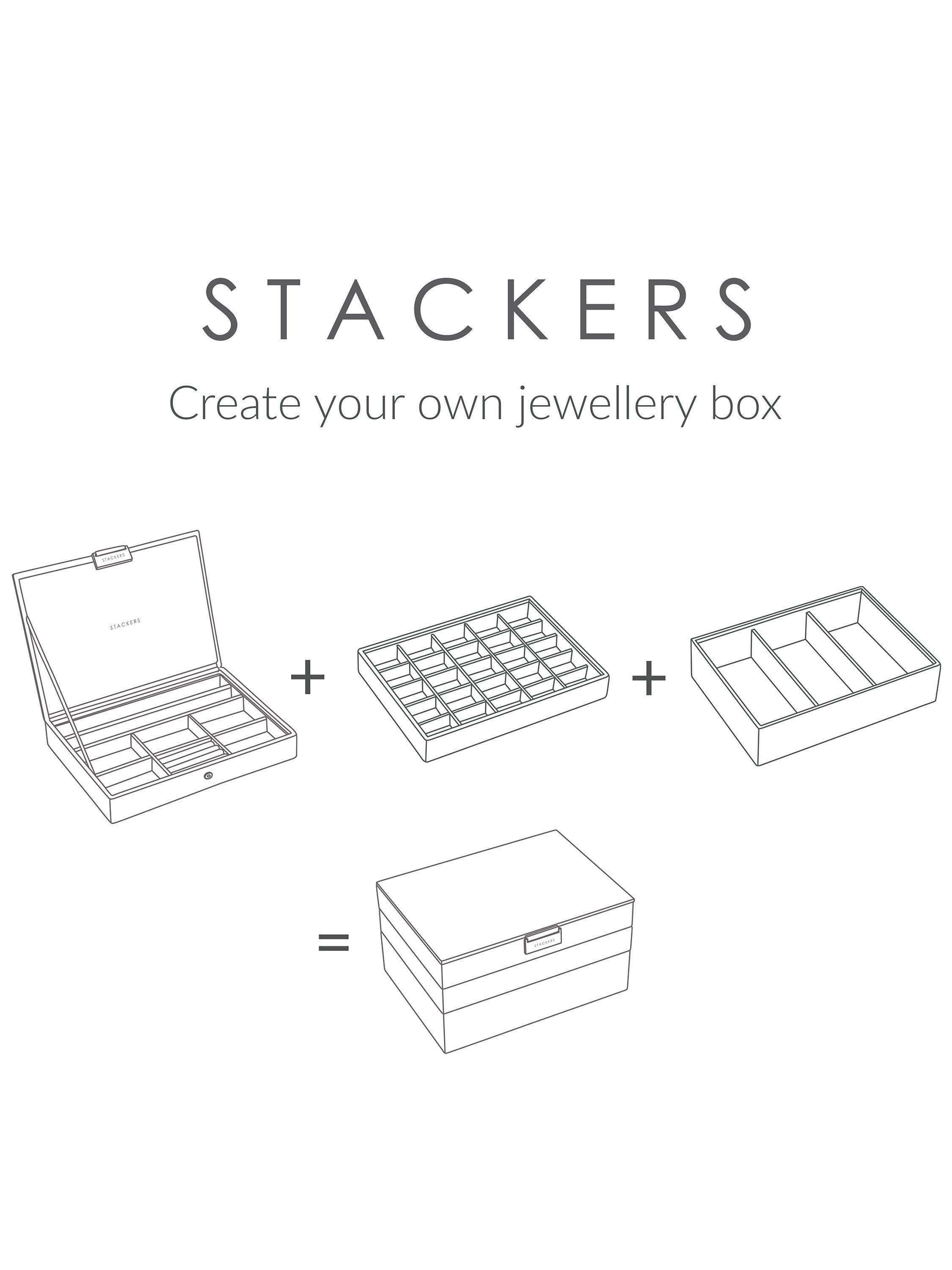 The ideal way to keep on top of your ever expanding jewellery collection. Stackers are designed the same size, so you can mix and match the colours and compartments you need. With a velvet lining, this 4-section tray has long areas, ideal for watches, necklaces and any other small trinkets you want to store safely and keep organised.