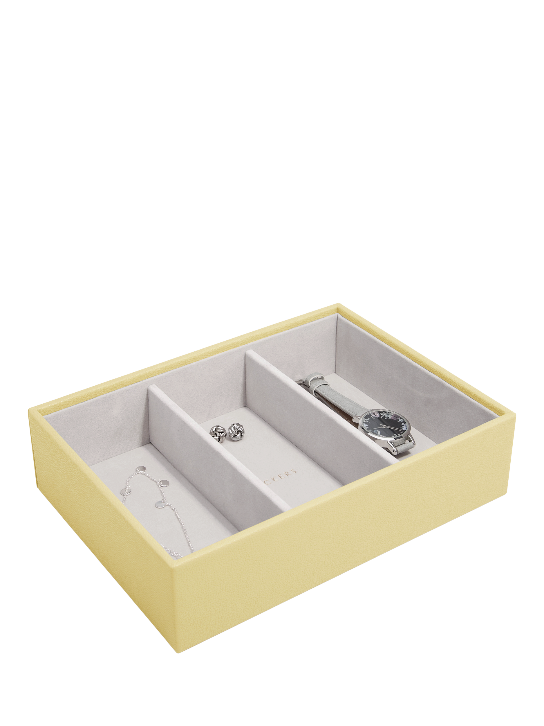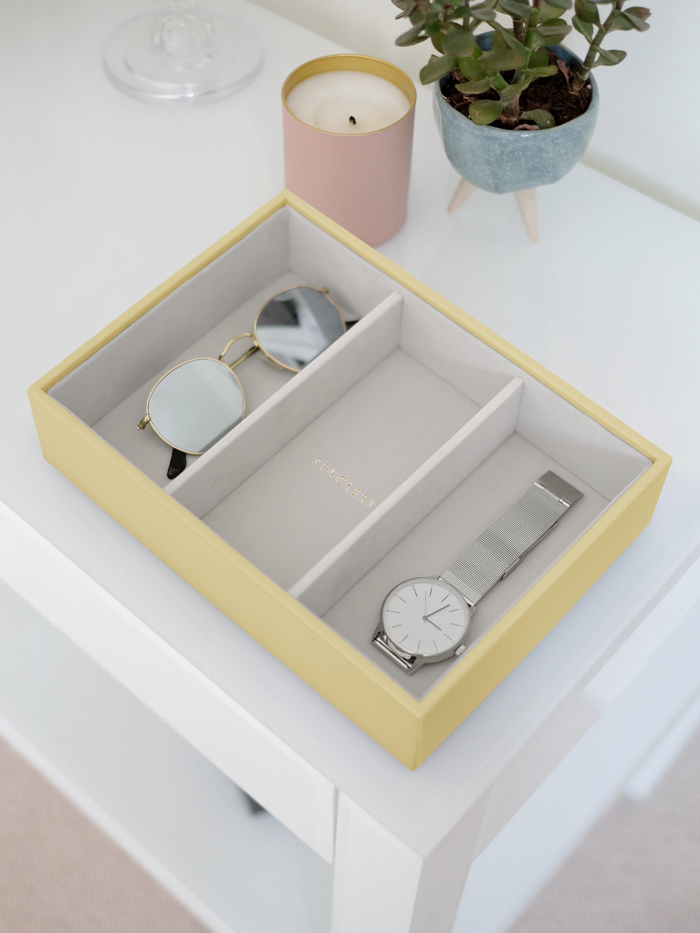 The perfect home for your watches, bracelets and glasses as you can store at least three pairs of sunglasses, 6 watches and even a dozen bracelets within this deep 3 section velvet lined tray. Stackers are designed the same size, so you can mix and match the colours and compartments you need.