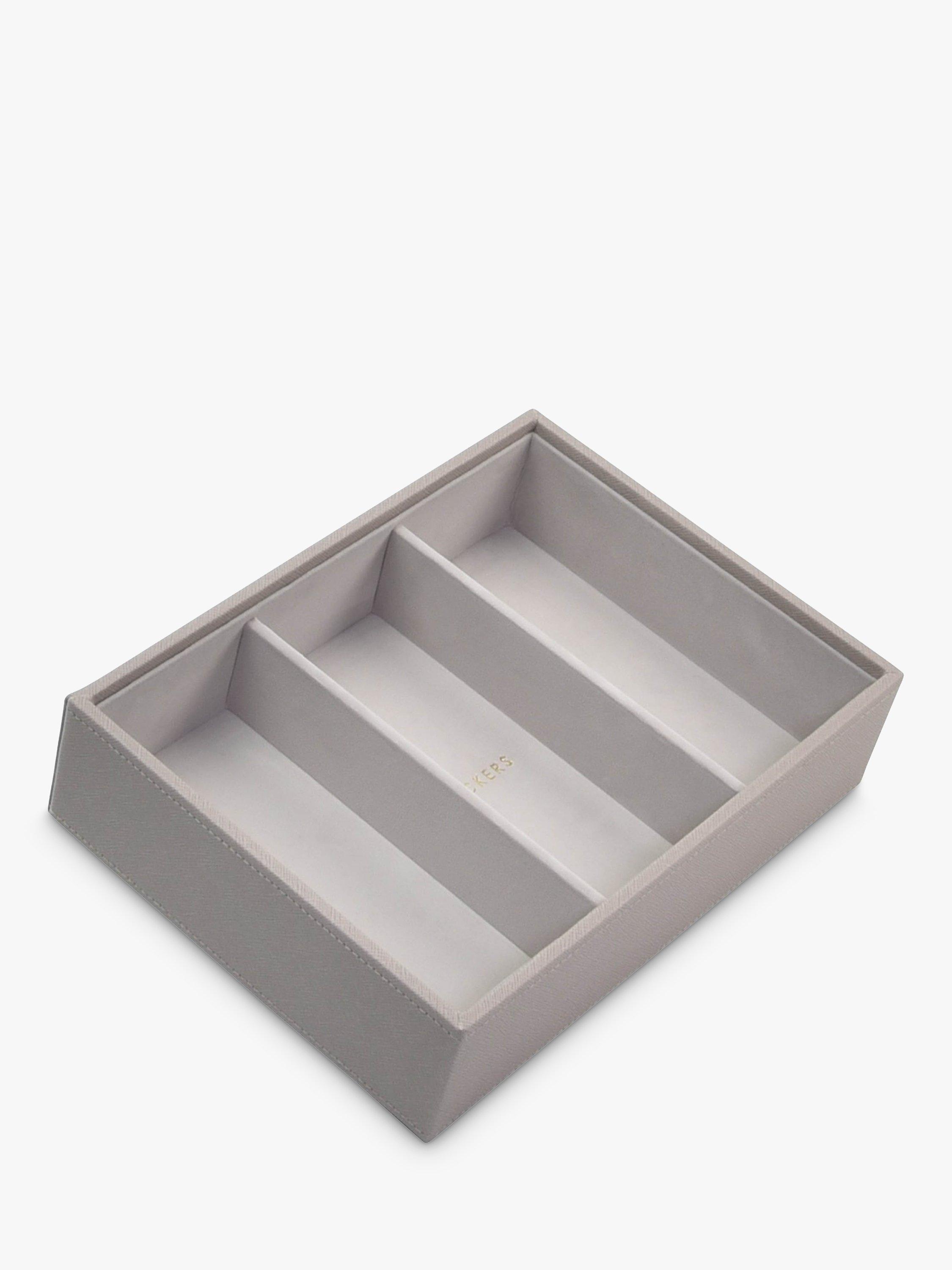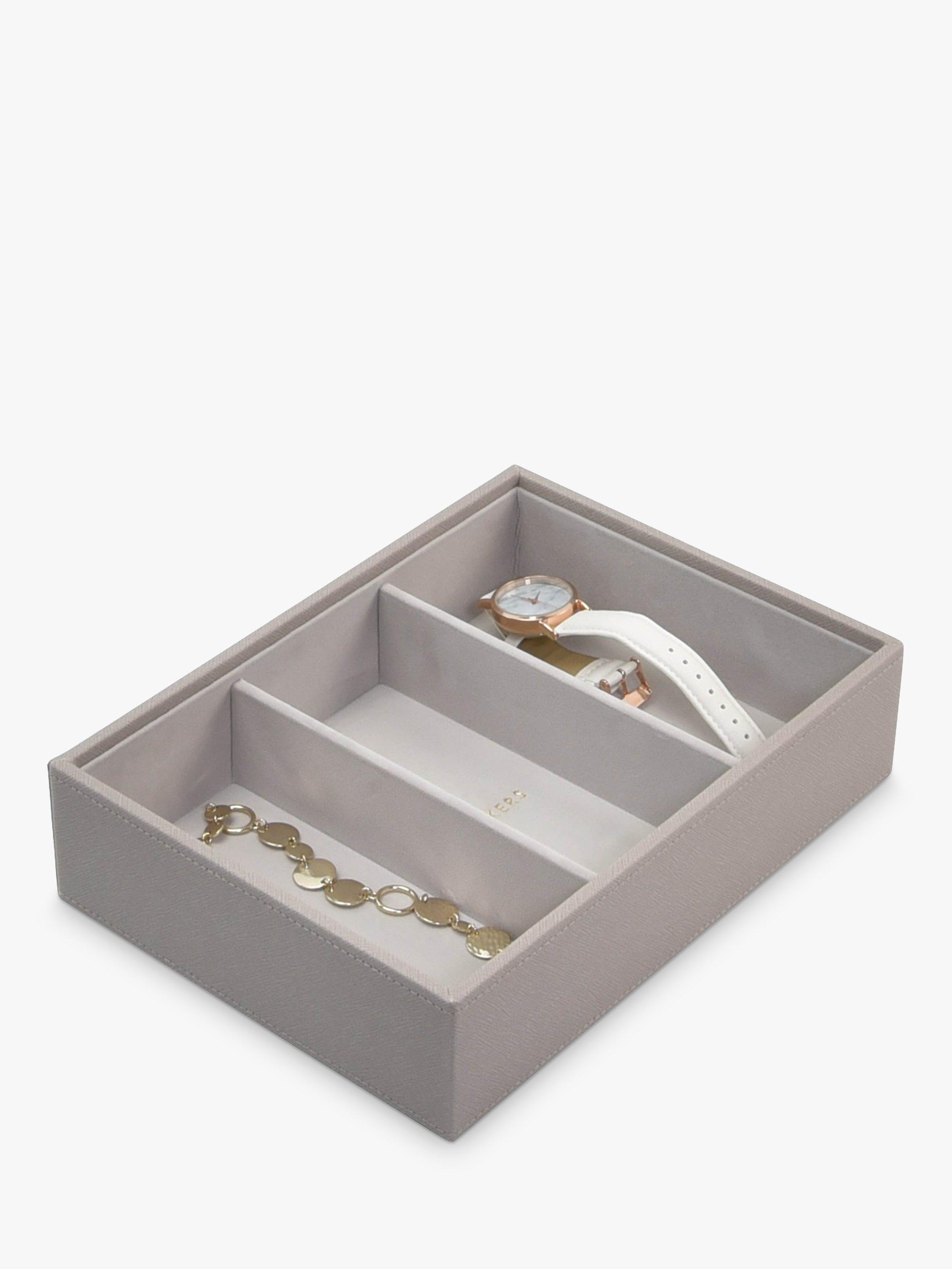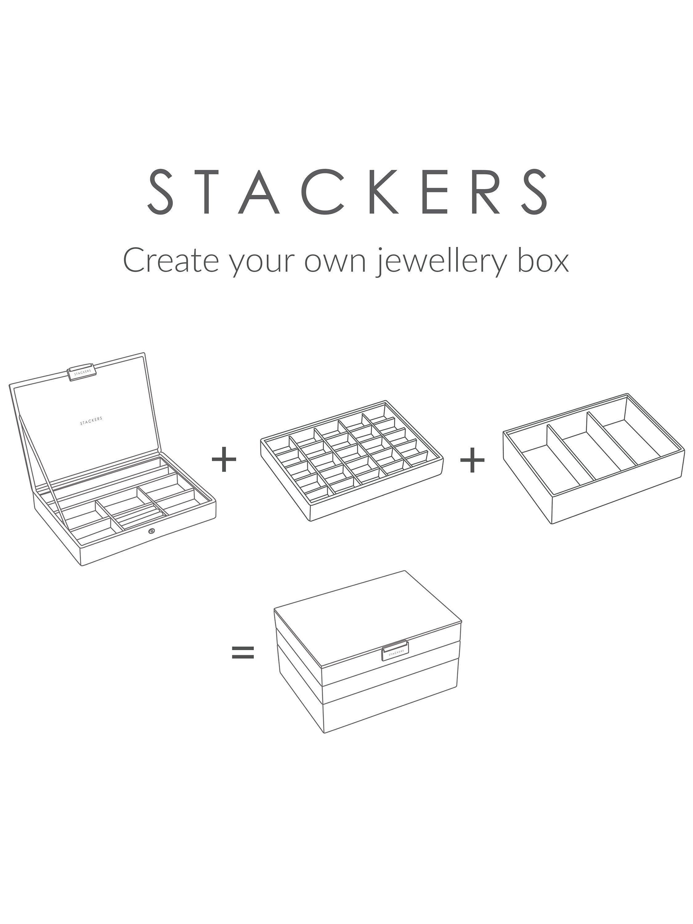 The perfect home for your watches, bracelets and glasses as you can store at least three pairs of sunglasses, 6 watches and even a dozen bracelets within this deep 3 section velvet lined tray. Stackers are designed the same size, so you can mix and match the colours and compartments you need.