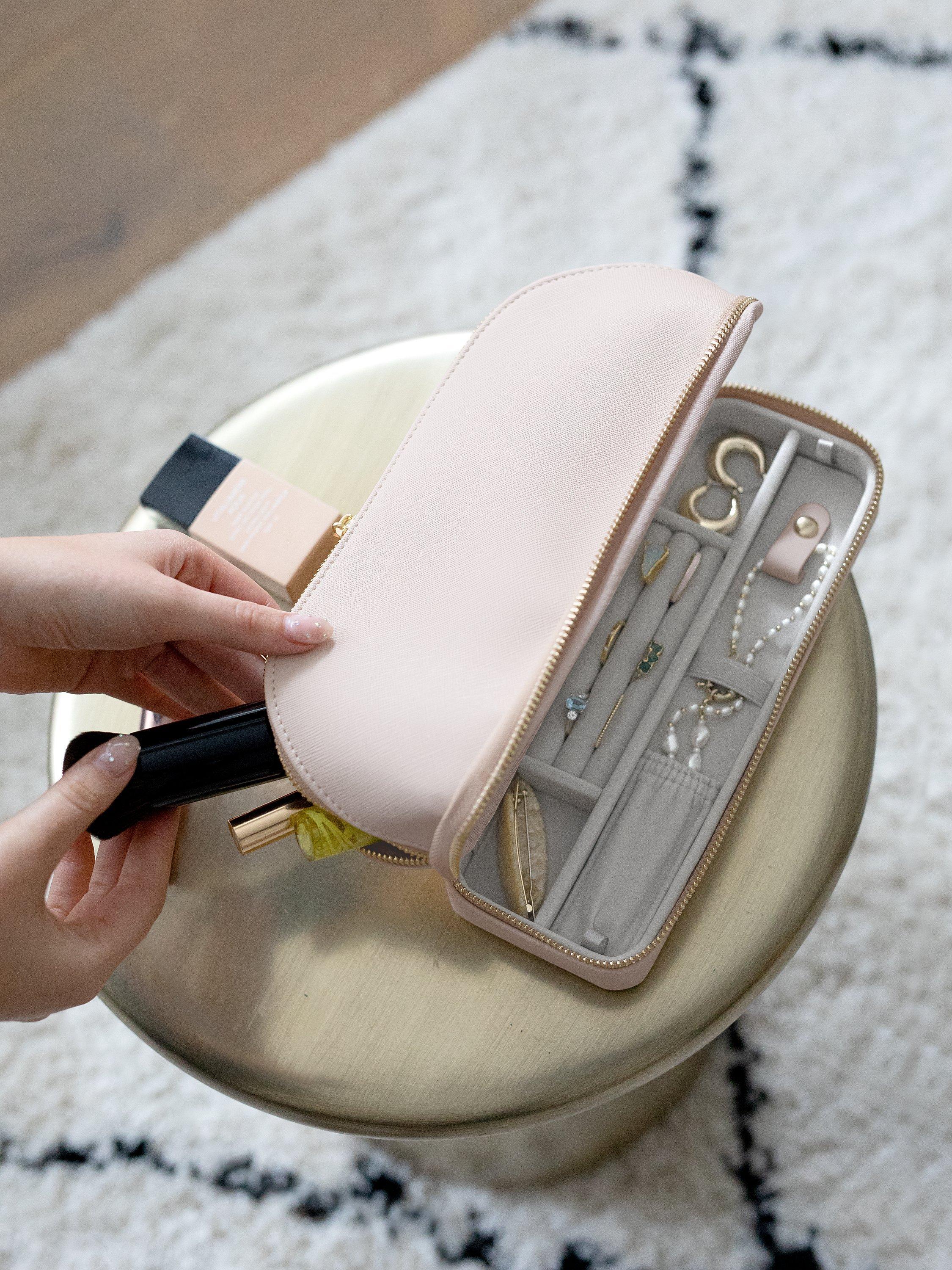 This Cosmetic and Jewellery Bag is a 2-in-1 storage bag featuring two separate sections for keeping your makeup and jewellery neatly organised.