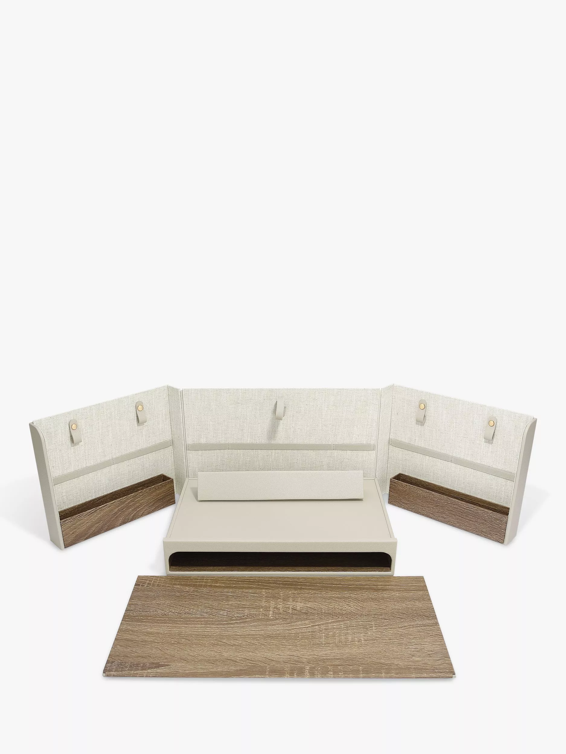 A simple solution for putting work away at the end of the day when you work from home. The Stackers Office In A Box can be packed away leaving just a subtle box, ready to be re-opened when you need it. The lid is removable and the box unfolds to reveal space for a laptop or tablet, notebooks, stationery and more. Finished in a neutral Oatmeal PU and Linen mix, to complement your home office aesthetic.