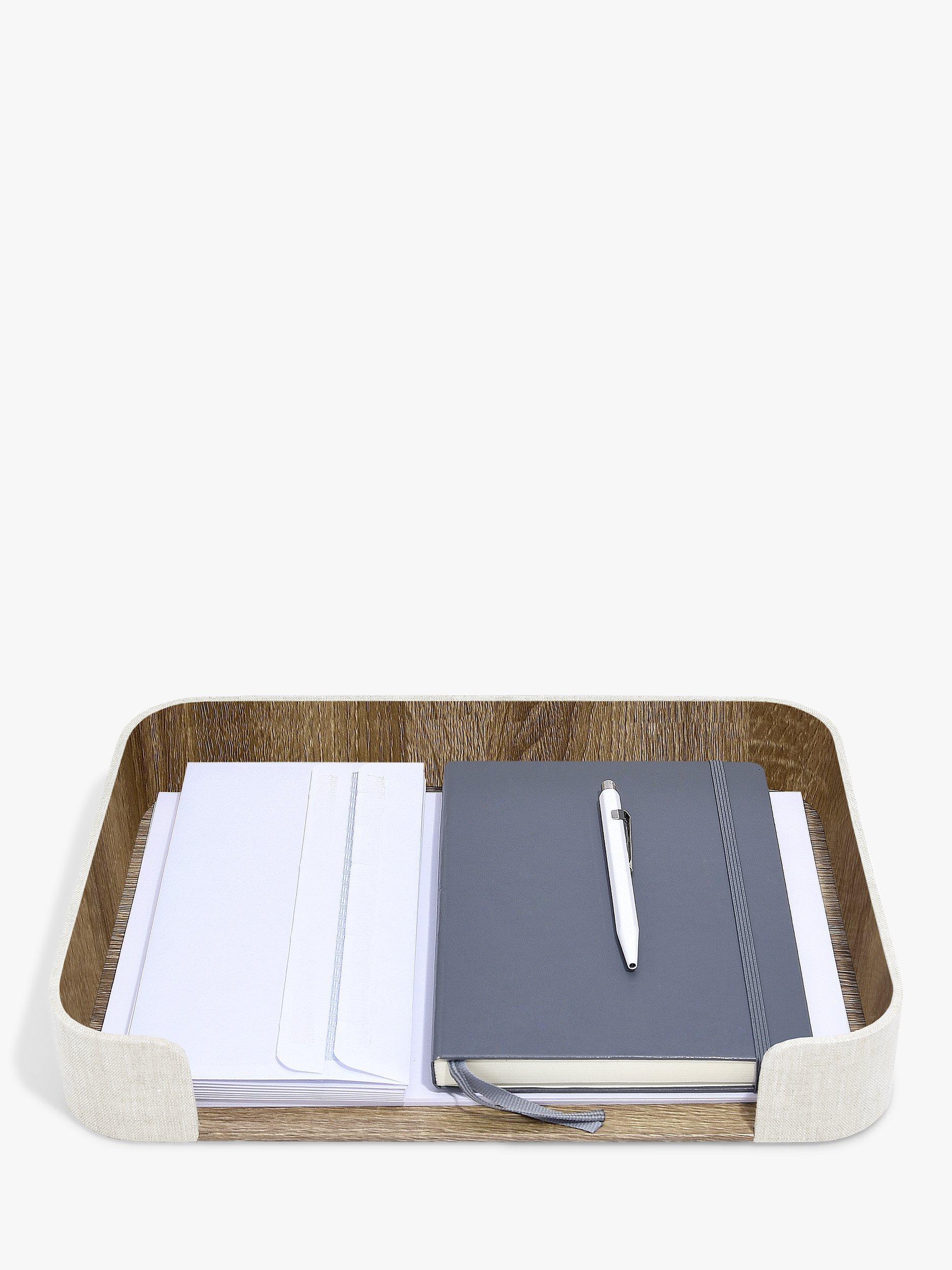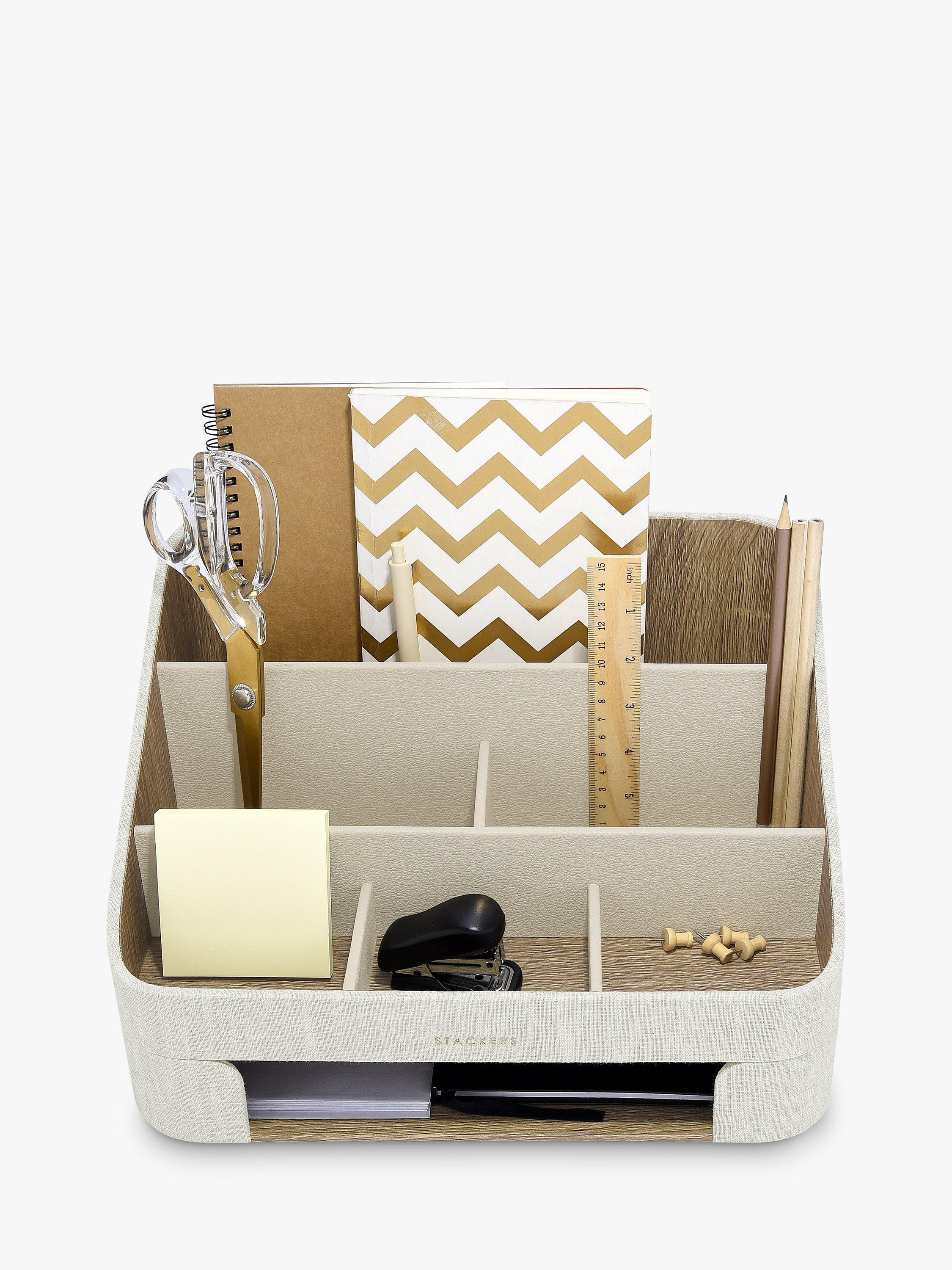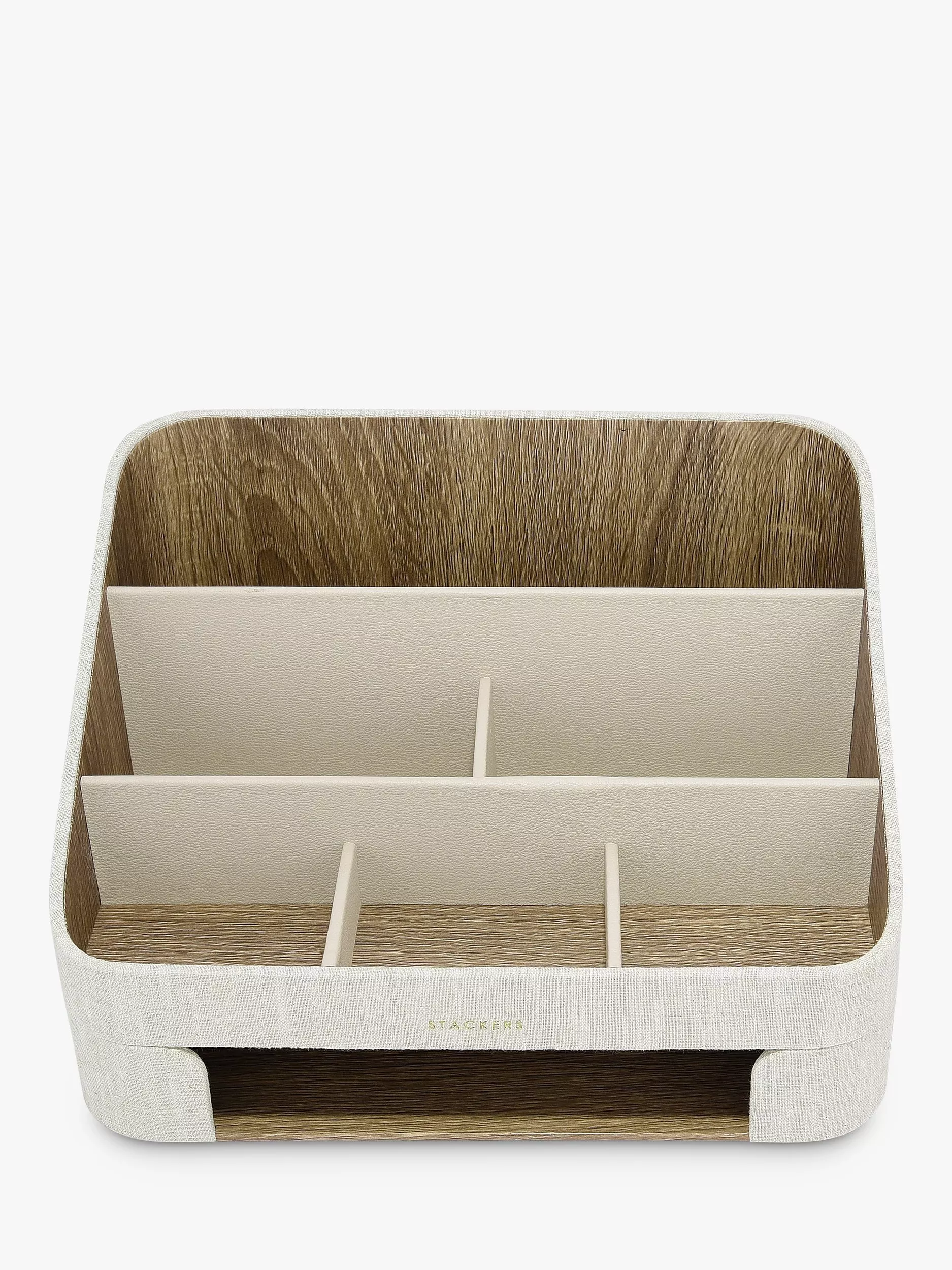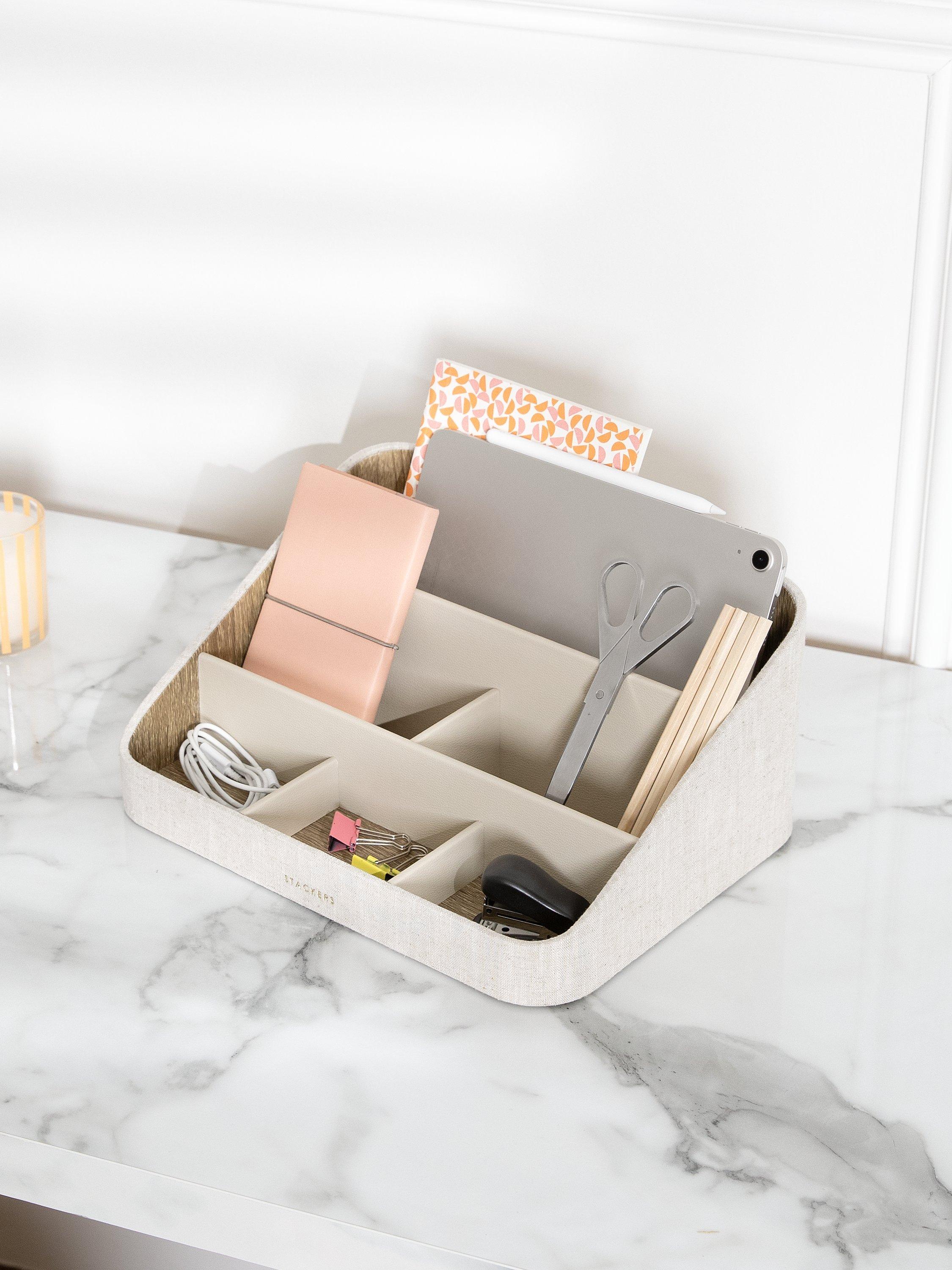 The Stackers Desk Organiser Set keeps all of your working-from-home essentials neatly organised. With space for notebooks, stationery, cables, headphones and more - everything can be kept within easy reach on your desk. The caddy stacks on top of the letter tray for compact storage, but they can also be used separately. Finished in a neutral Oatmeal PU and Linen mix, to complement your home office aesthetic.