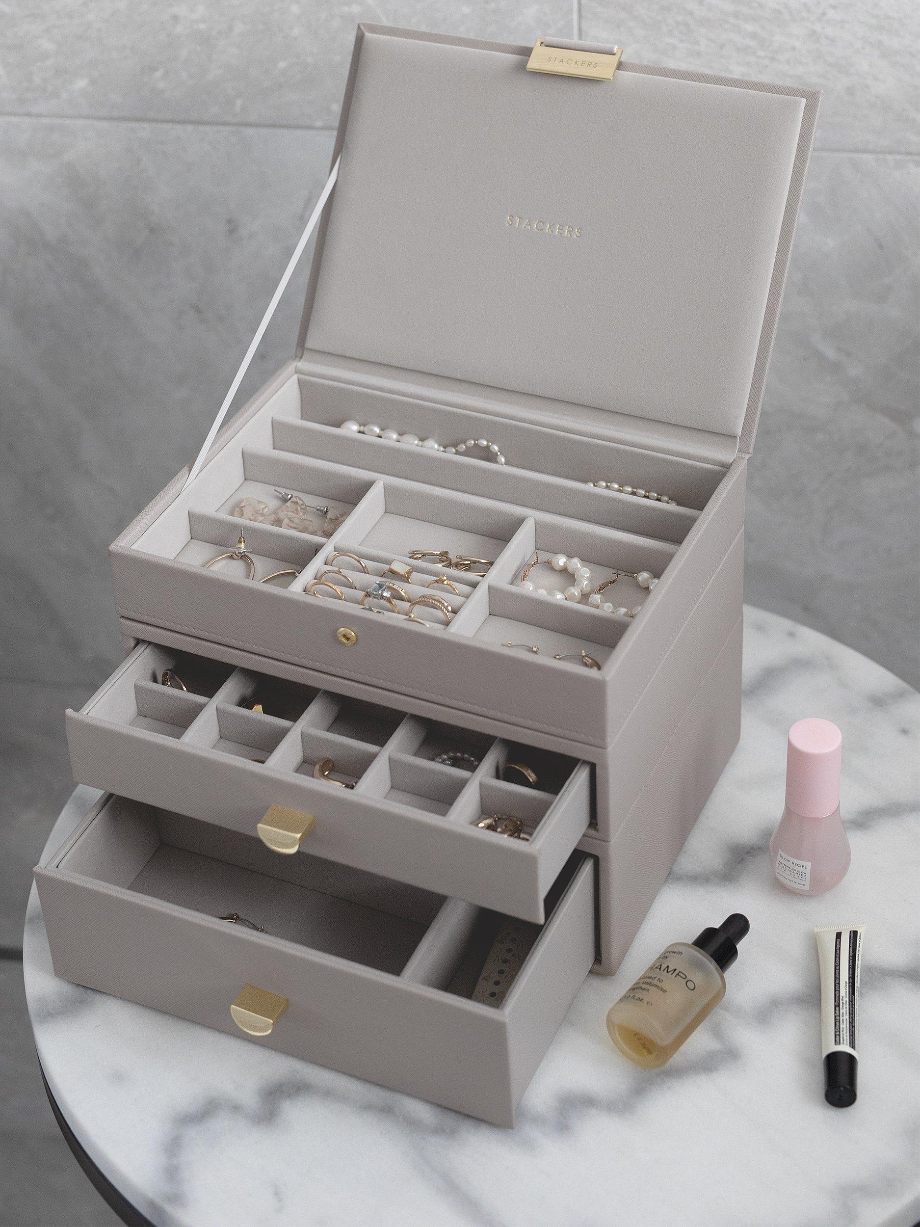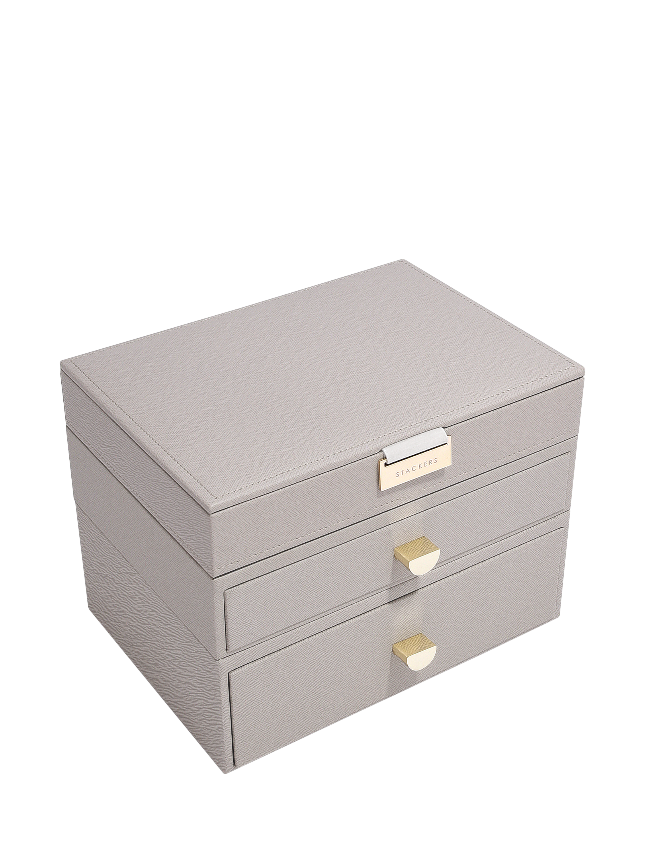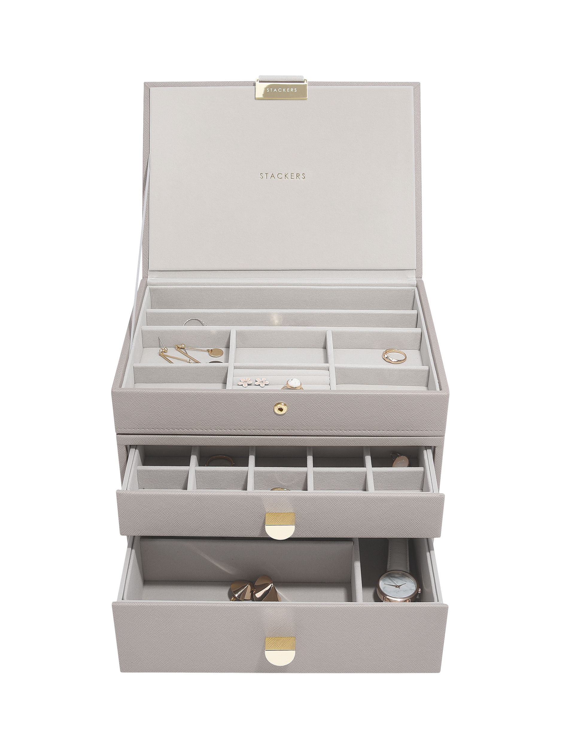 The Stackers Classic Jewellery Box 2-Drawer Set includes the Classic Jewellery Box Lid, Classic Trinket Drawer Layer, Classic Necklace Layer and Classic Accessory Drawer Layer. It's the perfect addition to your dressing table to keep your jewellery and trinkets safe from scratches and beautifully displayed.
