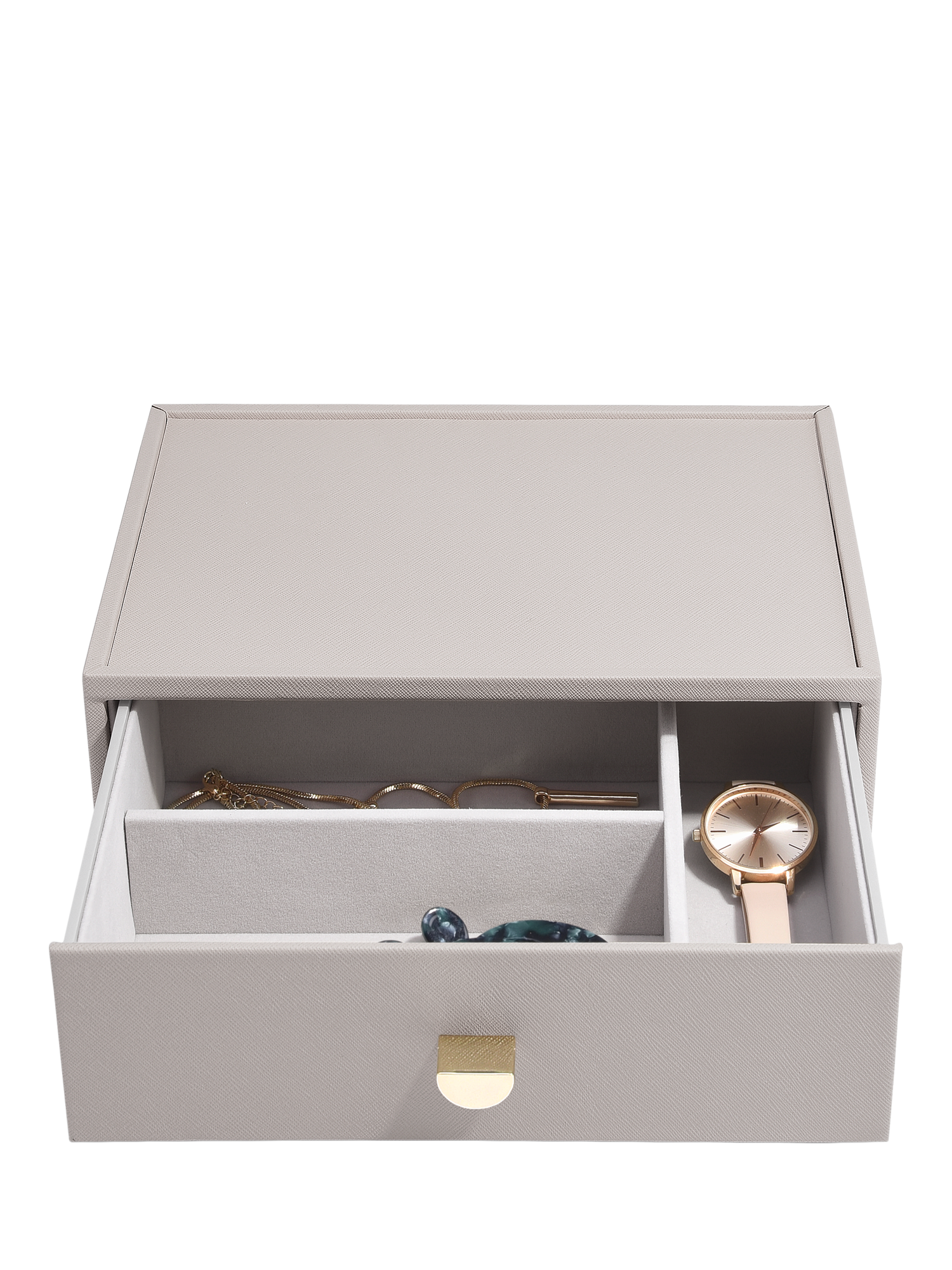 The Jewellery Box Lid is designed to hold bracelets, earrings and necklaces, and features a cushioned compartment for rings and stud earrings. Your Trinket Drawer Layer can be used to store pairs of earrings, chunky rings and fine chains. The Accessory Drawer Layer consists of three sections to hold larger accessories such as watches, chunky bracelets and sunglasses. You can also add the Watch Pad, Ring Roll or Medium Zipped Travel Jewellery Box to these sections for additional storage.