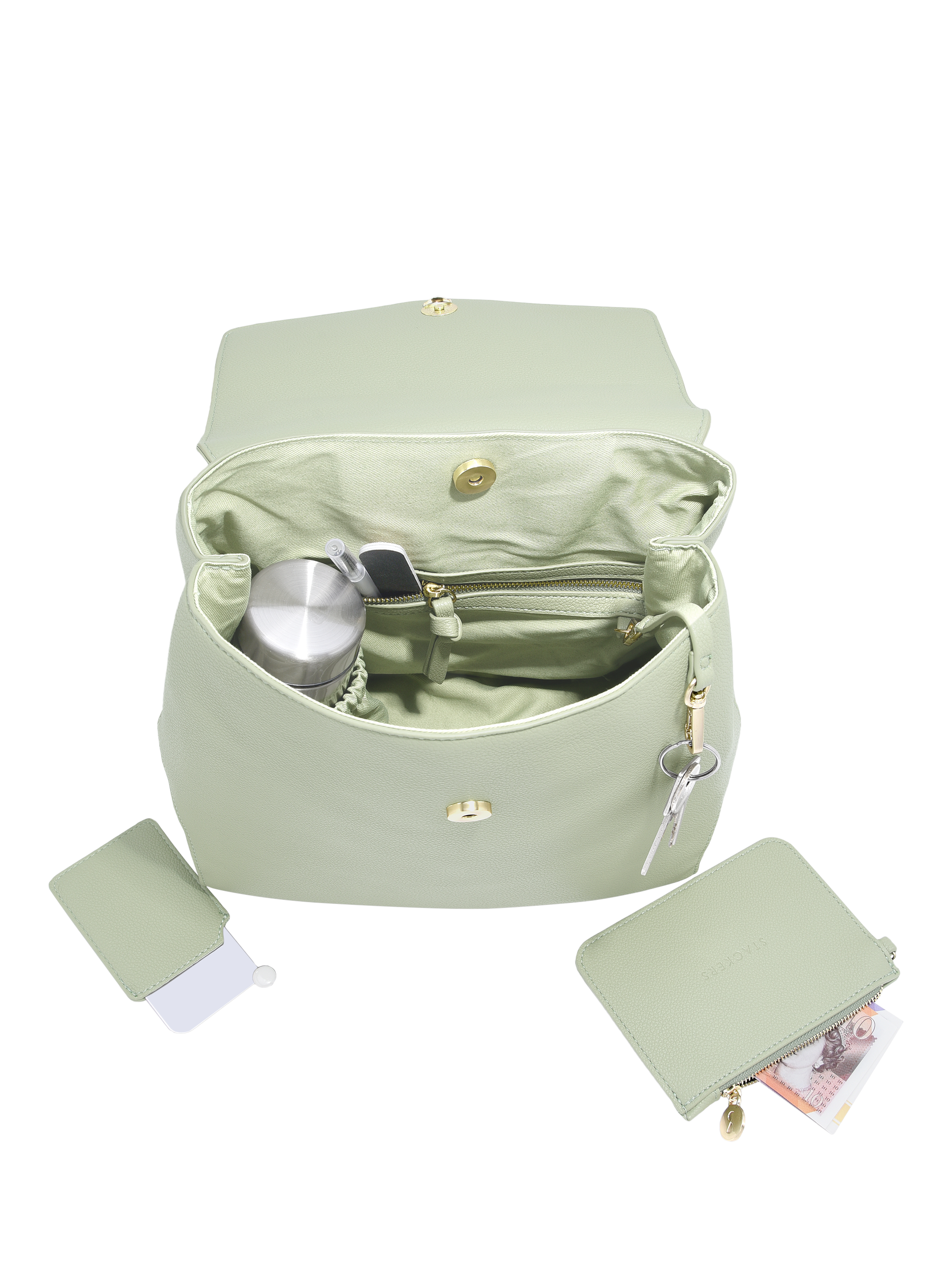 Includes an expandable pocket for a water bottle and built-in cable tidy with elastic loops for your charger and earphones. There's also an additional zipped compartment on the back of the bag. Comes with a removable zipped purse and key clip.