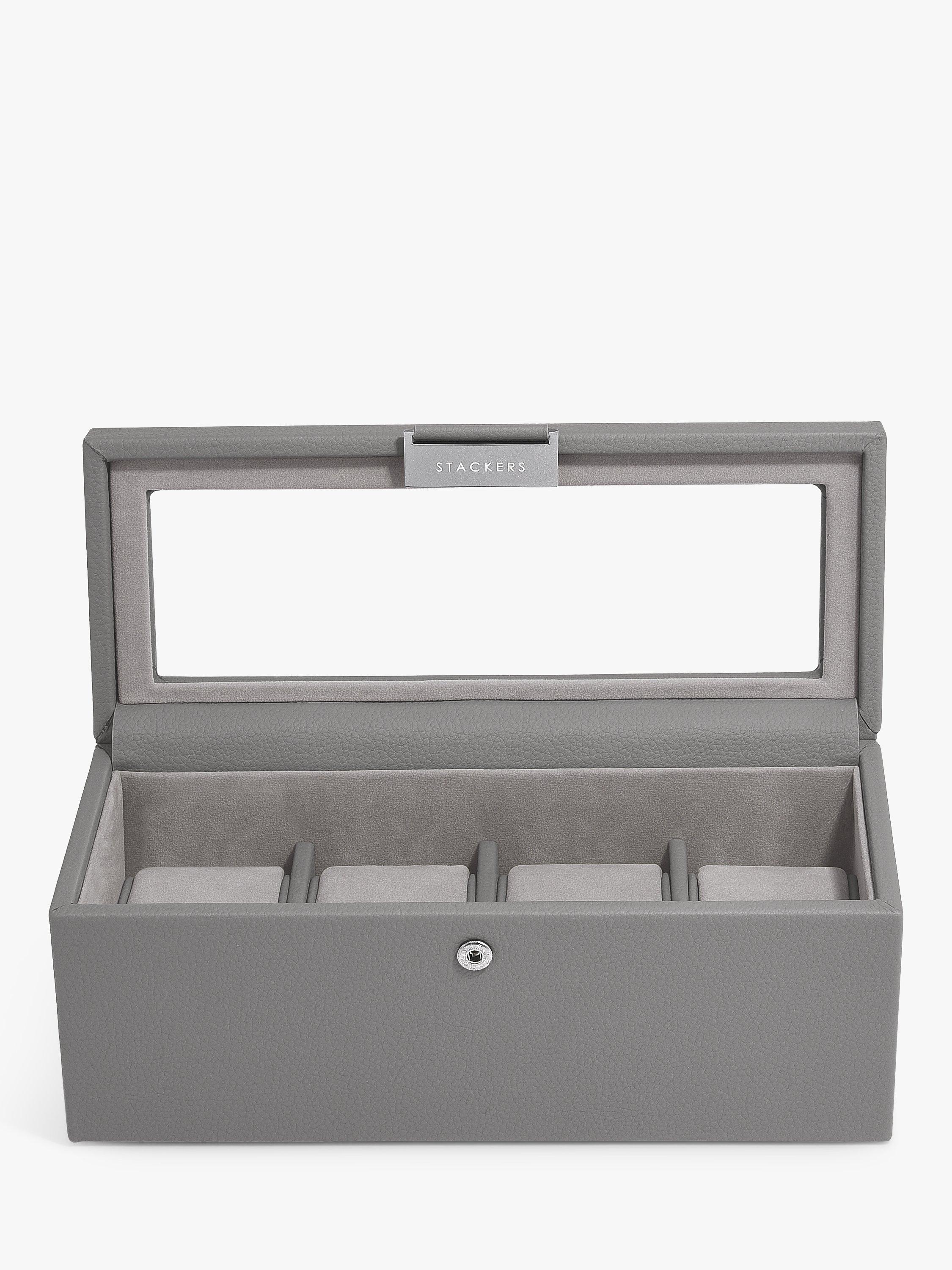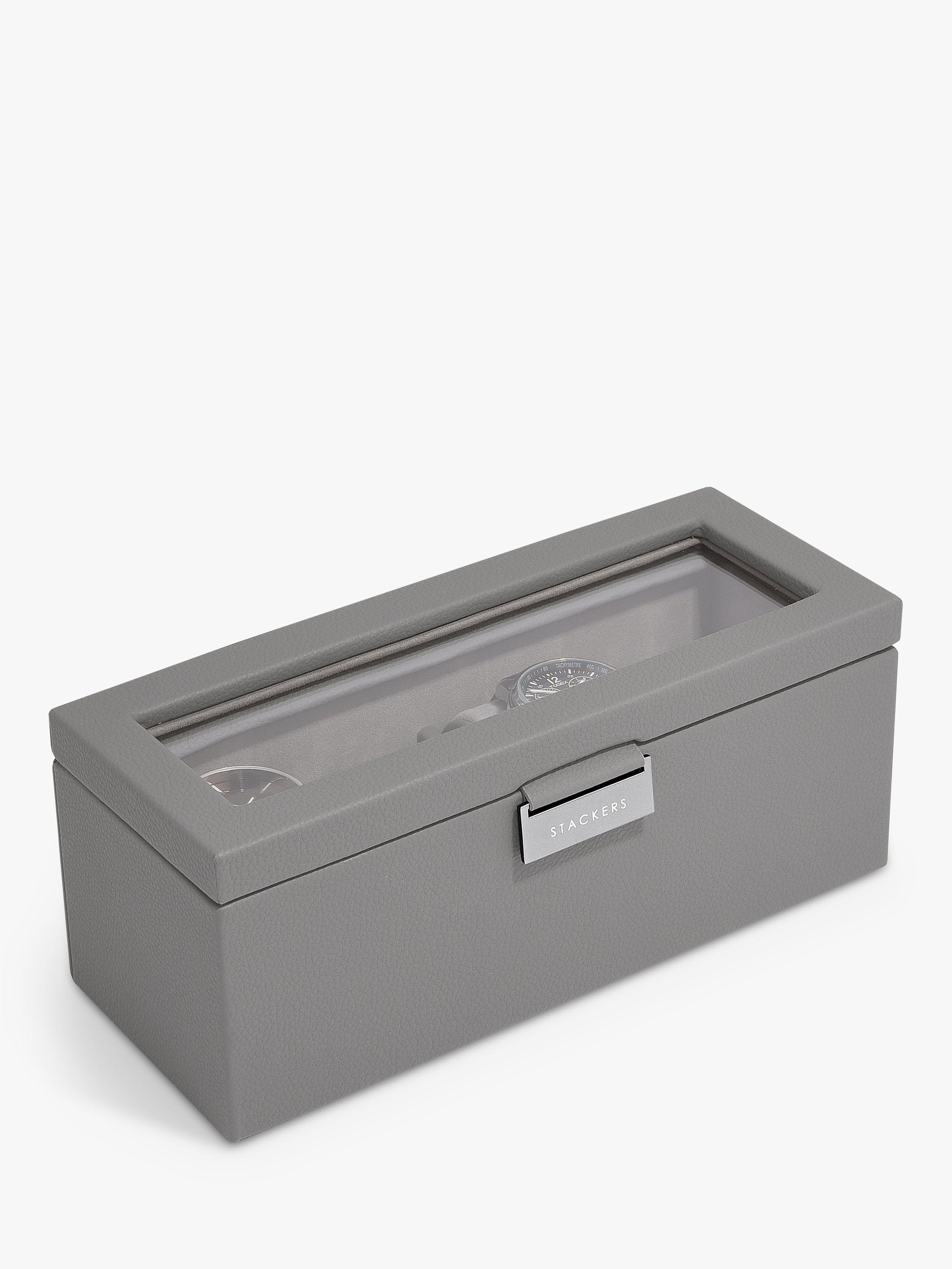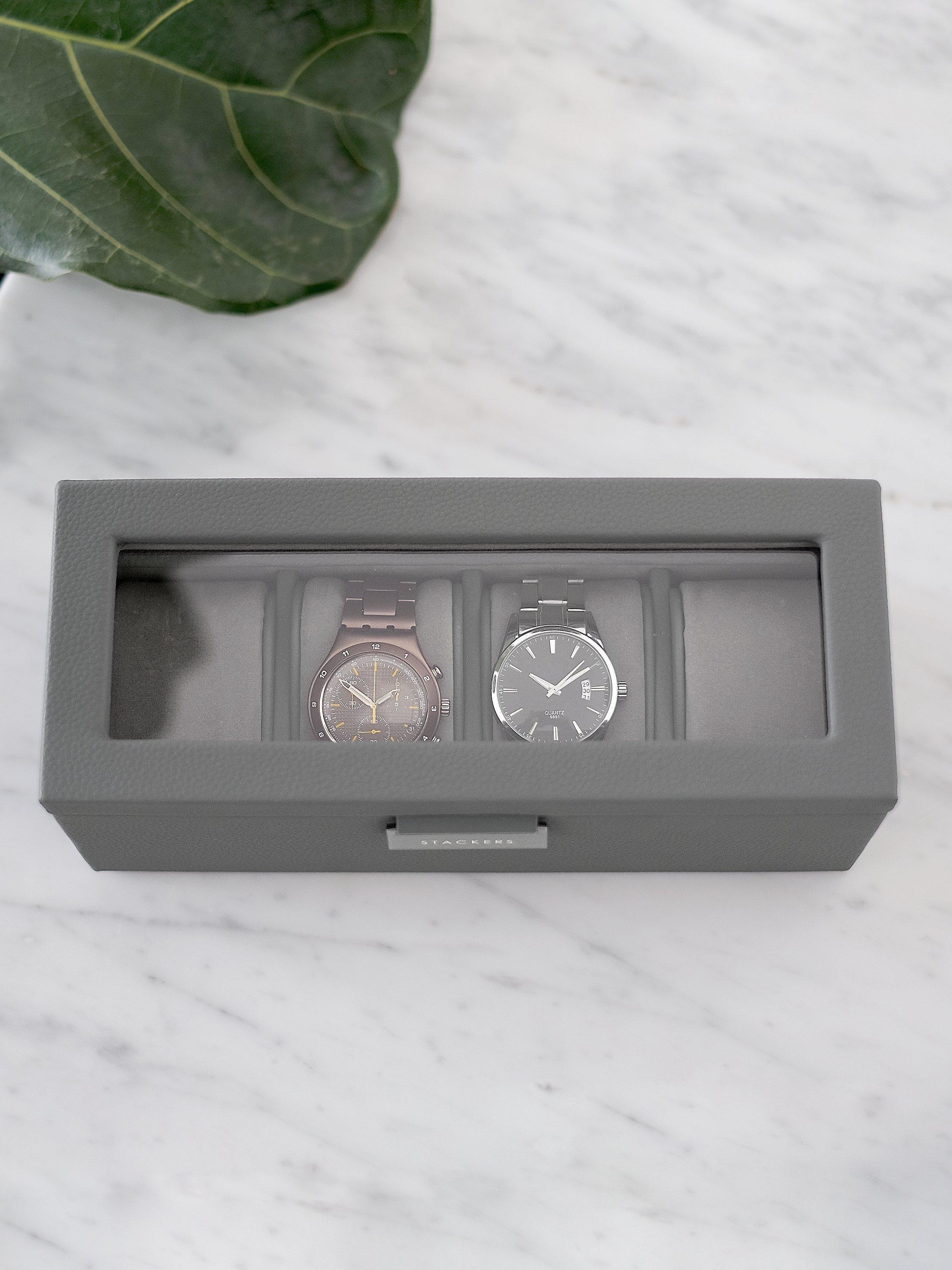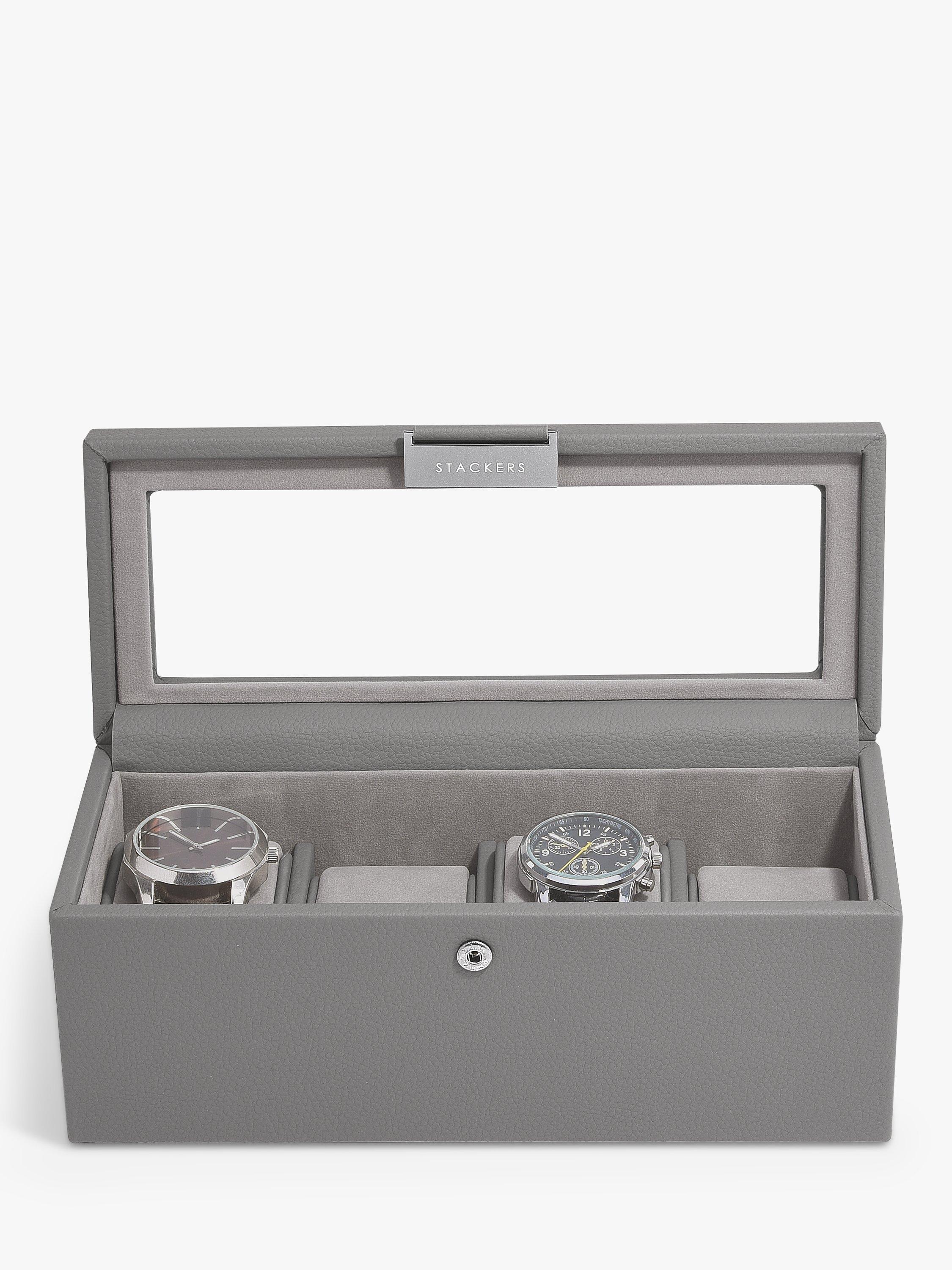 For the keen watch collector. Keep your watch collection organised and safe with this 4 piece watch box. It features a clear glass lid, to keep your watches safe and visible, and a quality cotton lining with soft watch pads, to ensure your watches stay scratch and dust free.