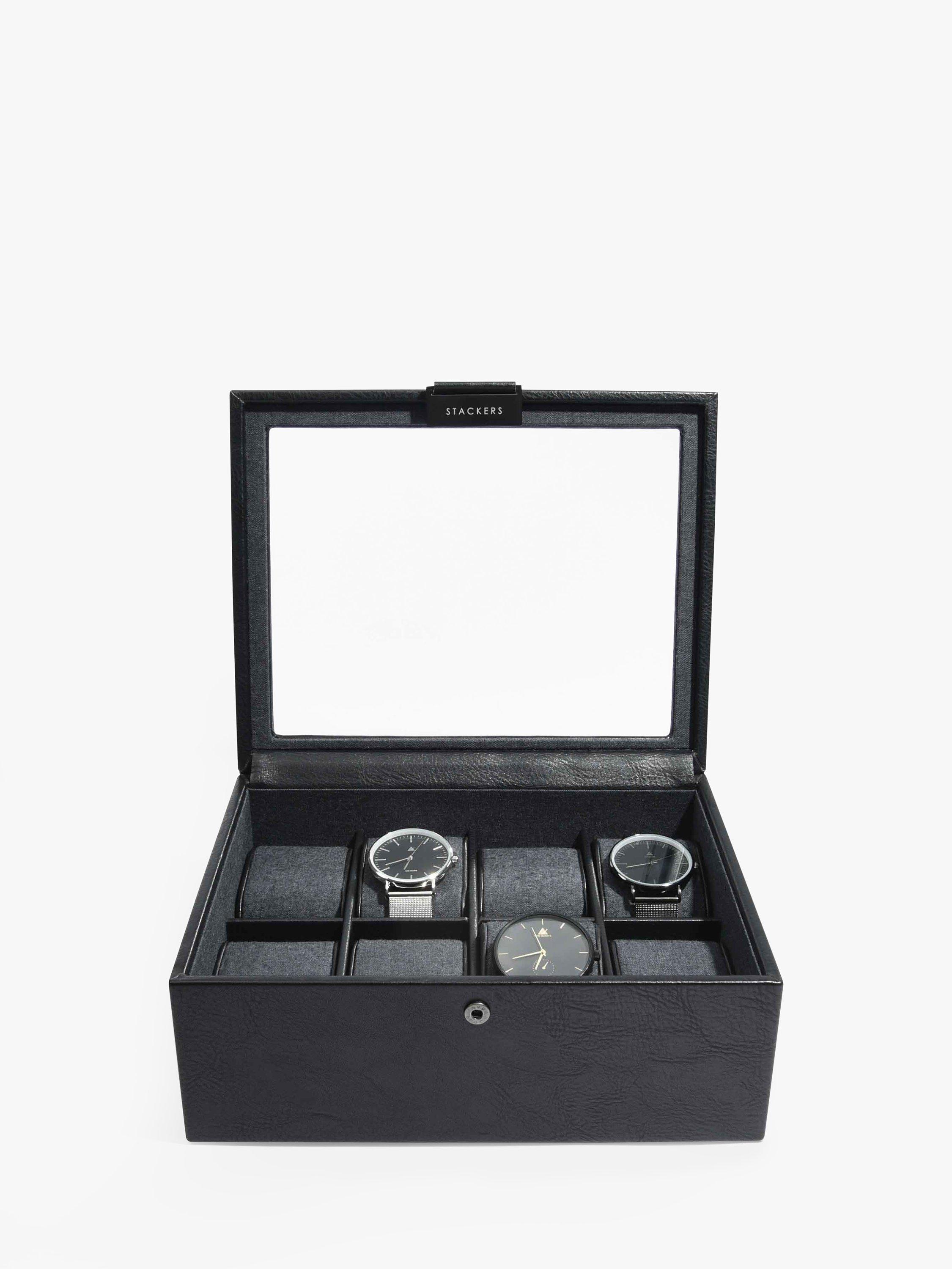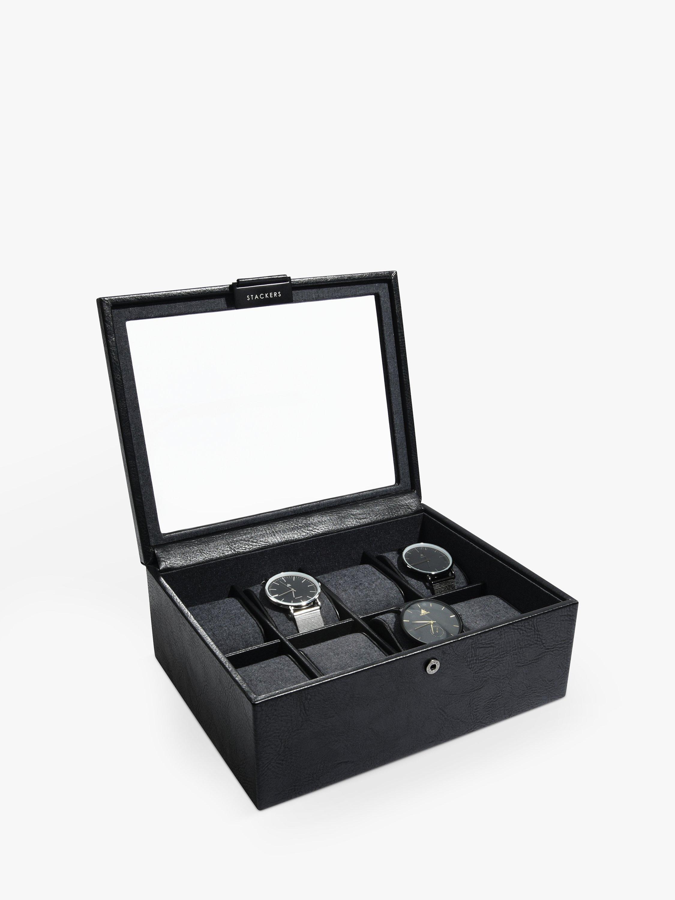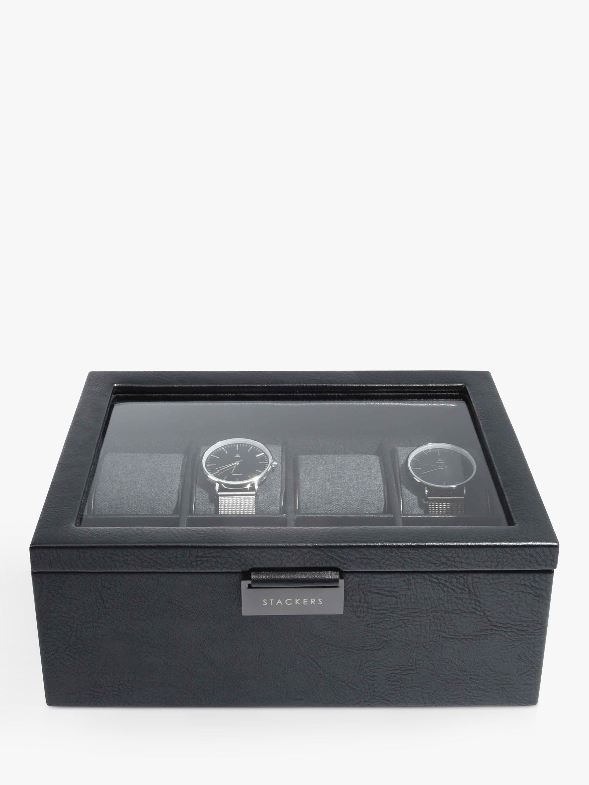 It holds up to eight watches, with removable watch pads, glass viewing panel, fully lined interior and stylish gunmetal finish metal fittings.