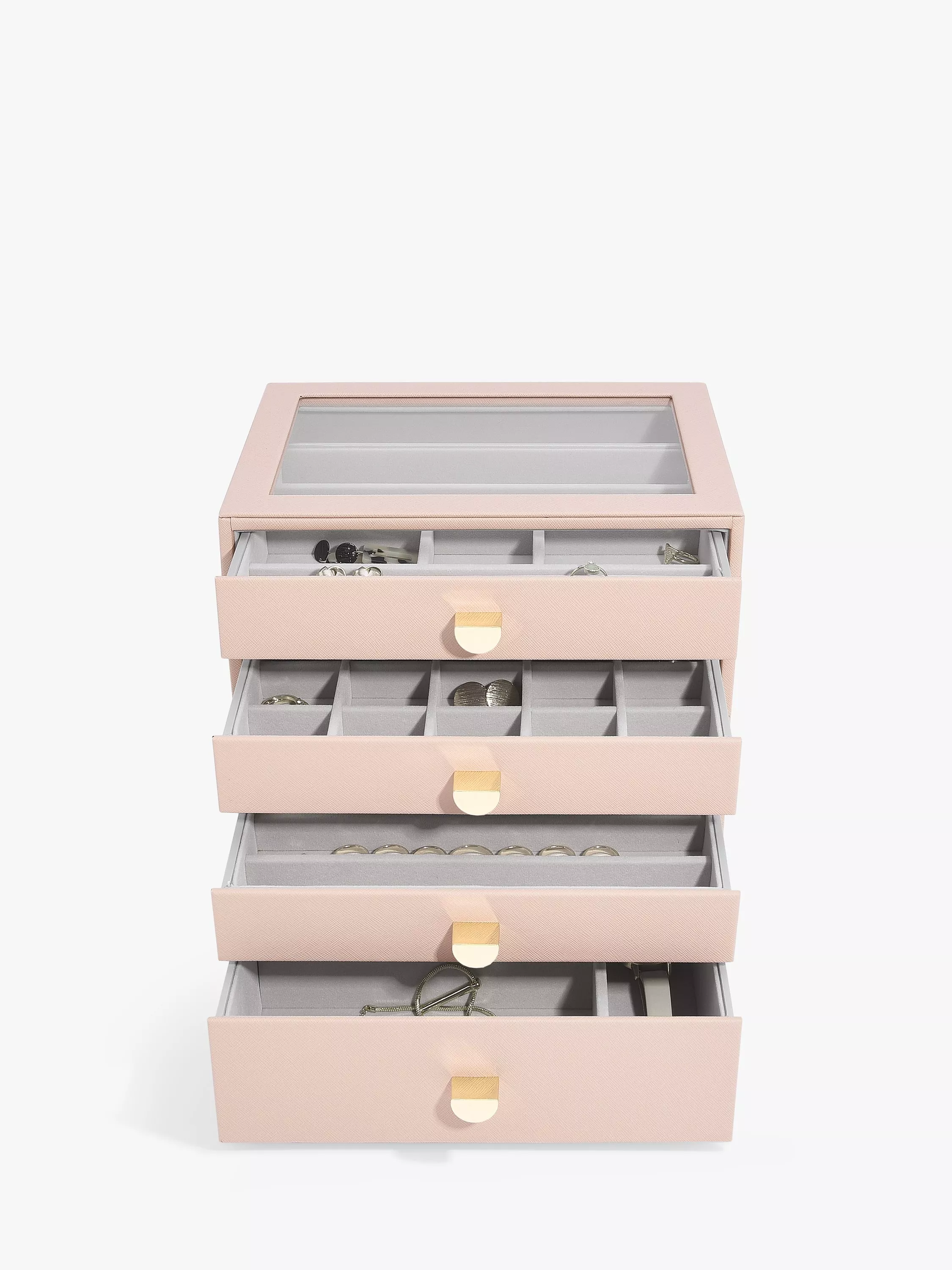 There'll be no excuse for your favourite jewellery to be anything other than tangle-free and organised! The Classic Drawer Set of 4 is ideal for almost every jewellery collection. With plenty of space to keep your necklaces, rings, earrings, watches and more, beautifully organised and safe. Whats more, you can easily add another jewellery drawer layer as your collection grows! Featuring a clear glass lid for visibility and easy access to your favourite pieces.