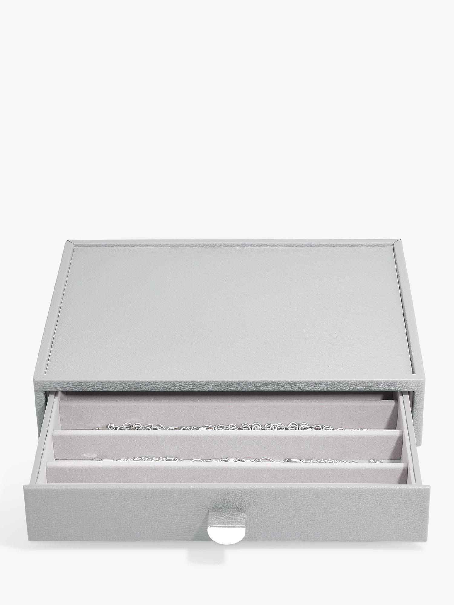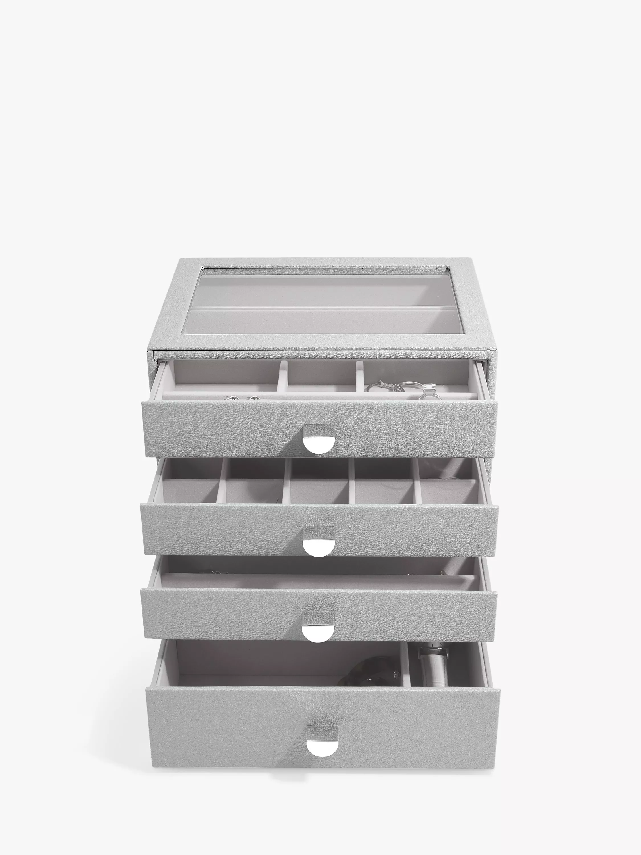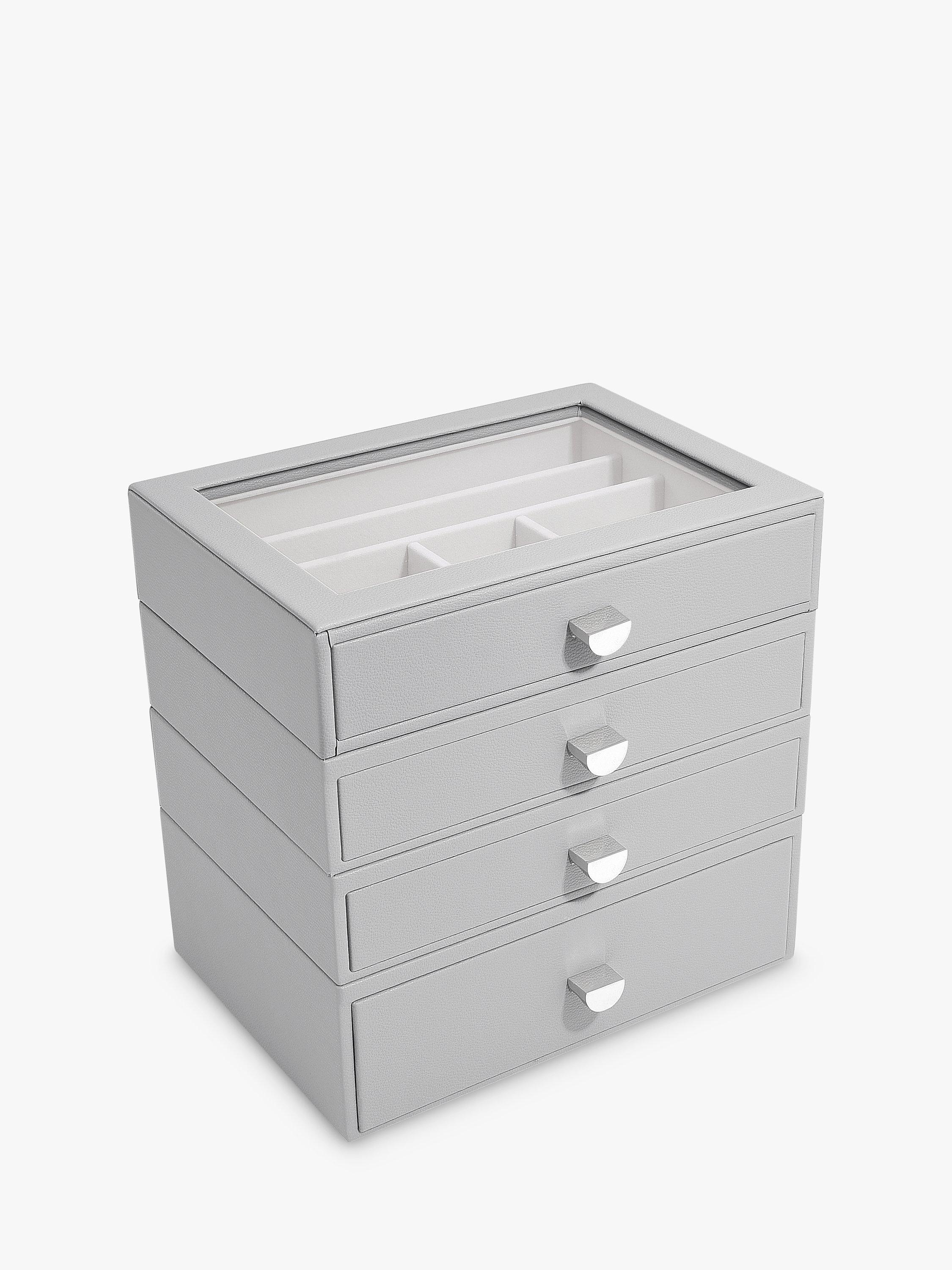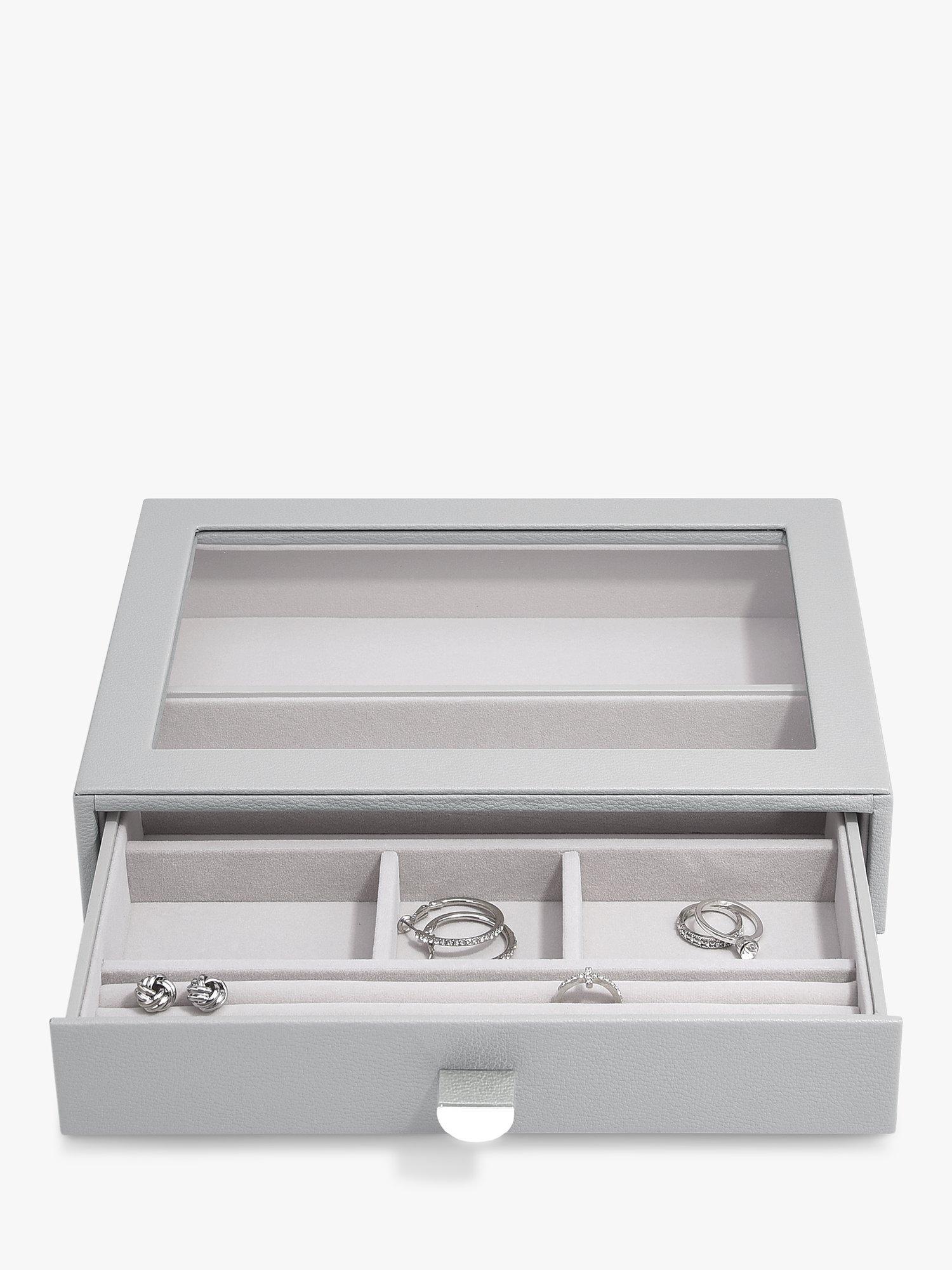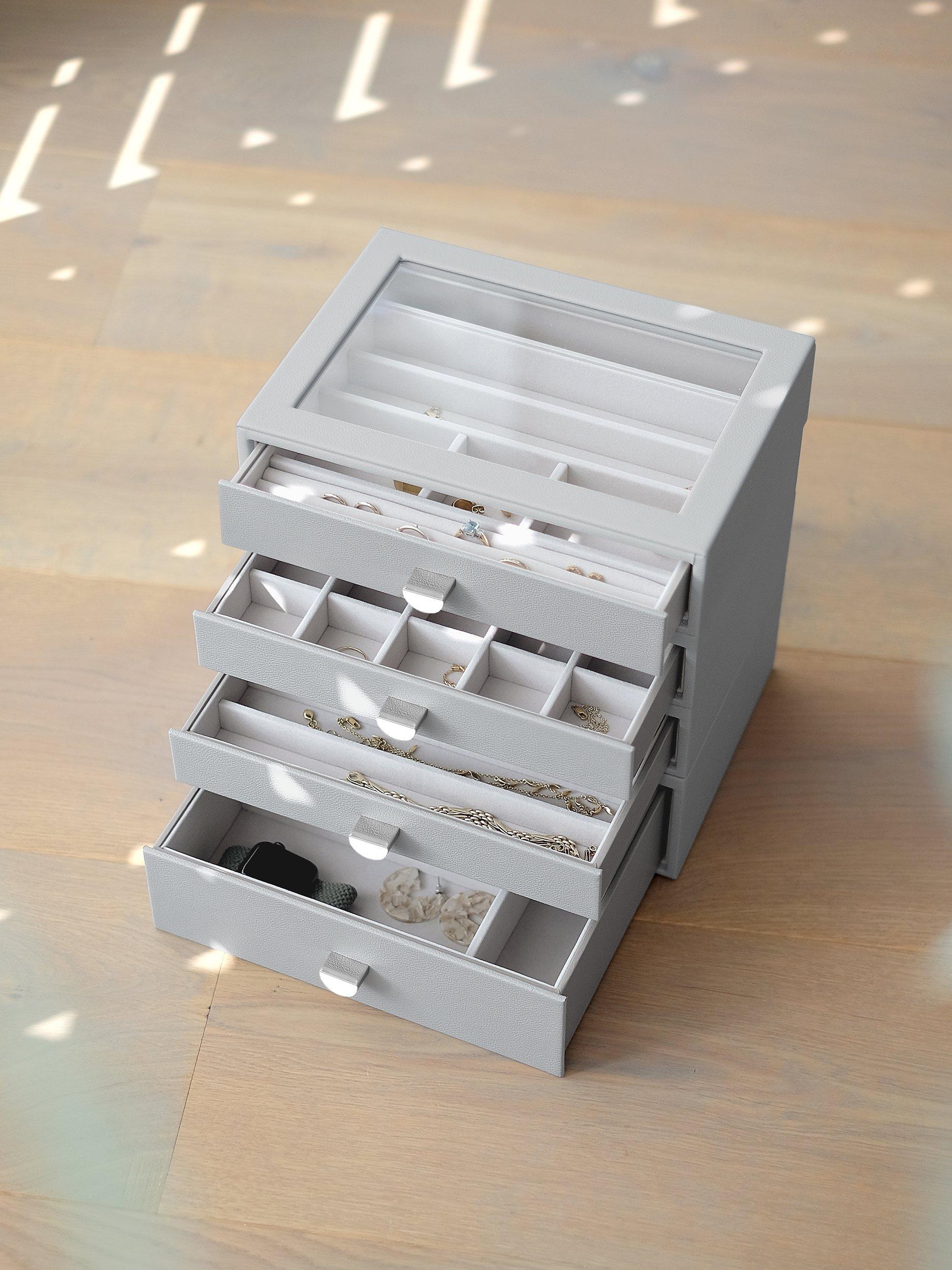 There'll be no excuse for your favourite jewellery to be anything other than tangle-free and organised! The Classic Drawer Set of 4 is ideal for almost every jewellery collection. With plenty of space to keep your necklaces, rings, earrings, watches and more, beautifully organised and safe. Whats more, you can easily add another jewellery drawer layer as your collection grows! Featuring a clear glass lid for visibility and easy access to your favourite pieces.