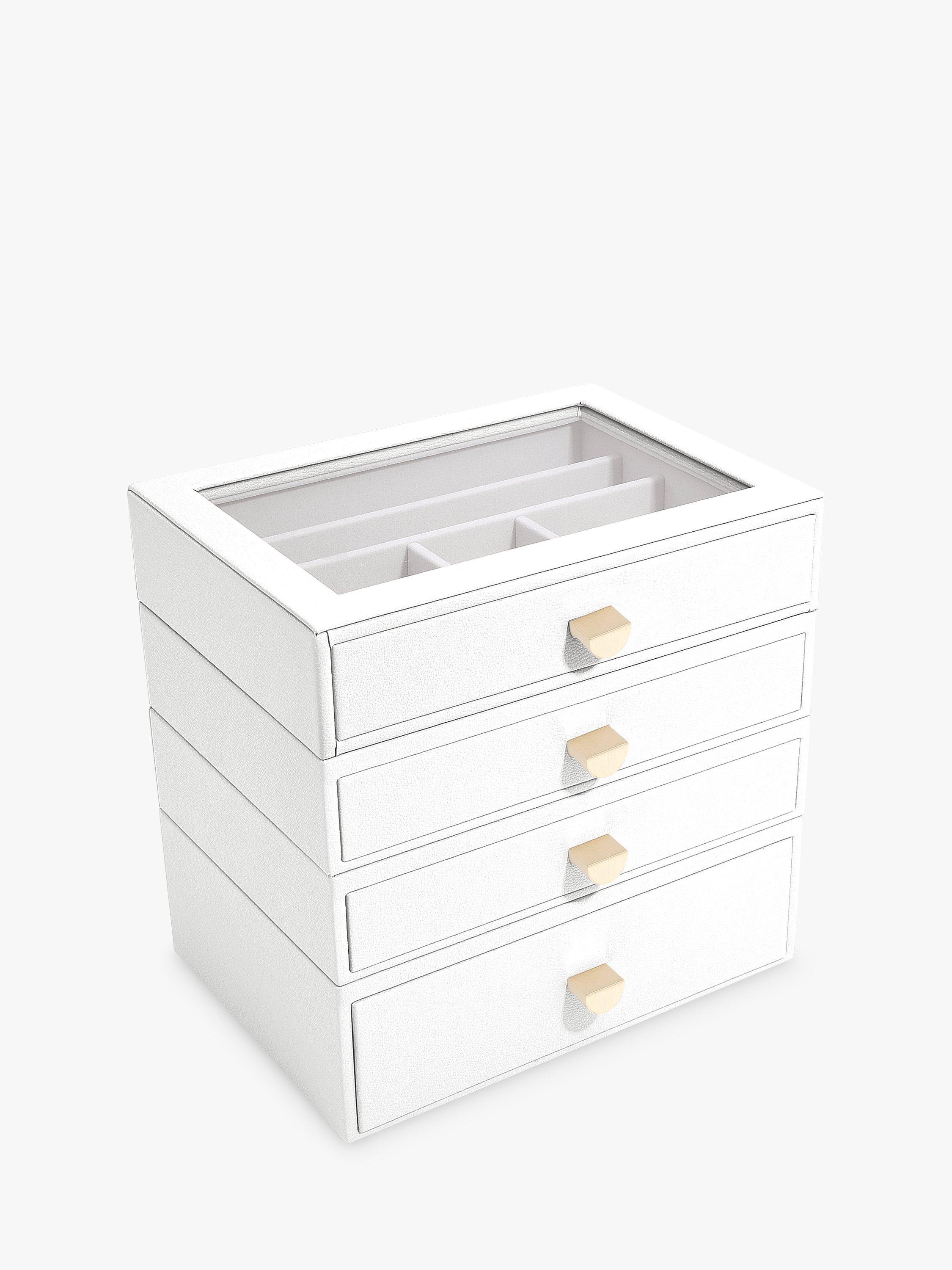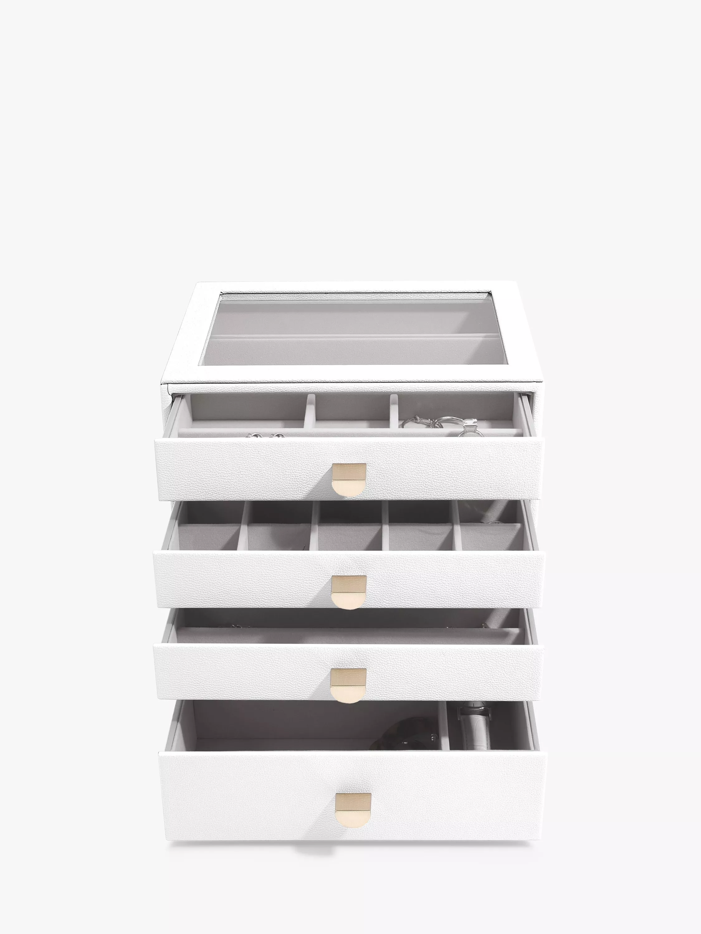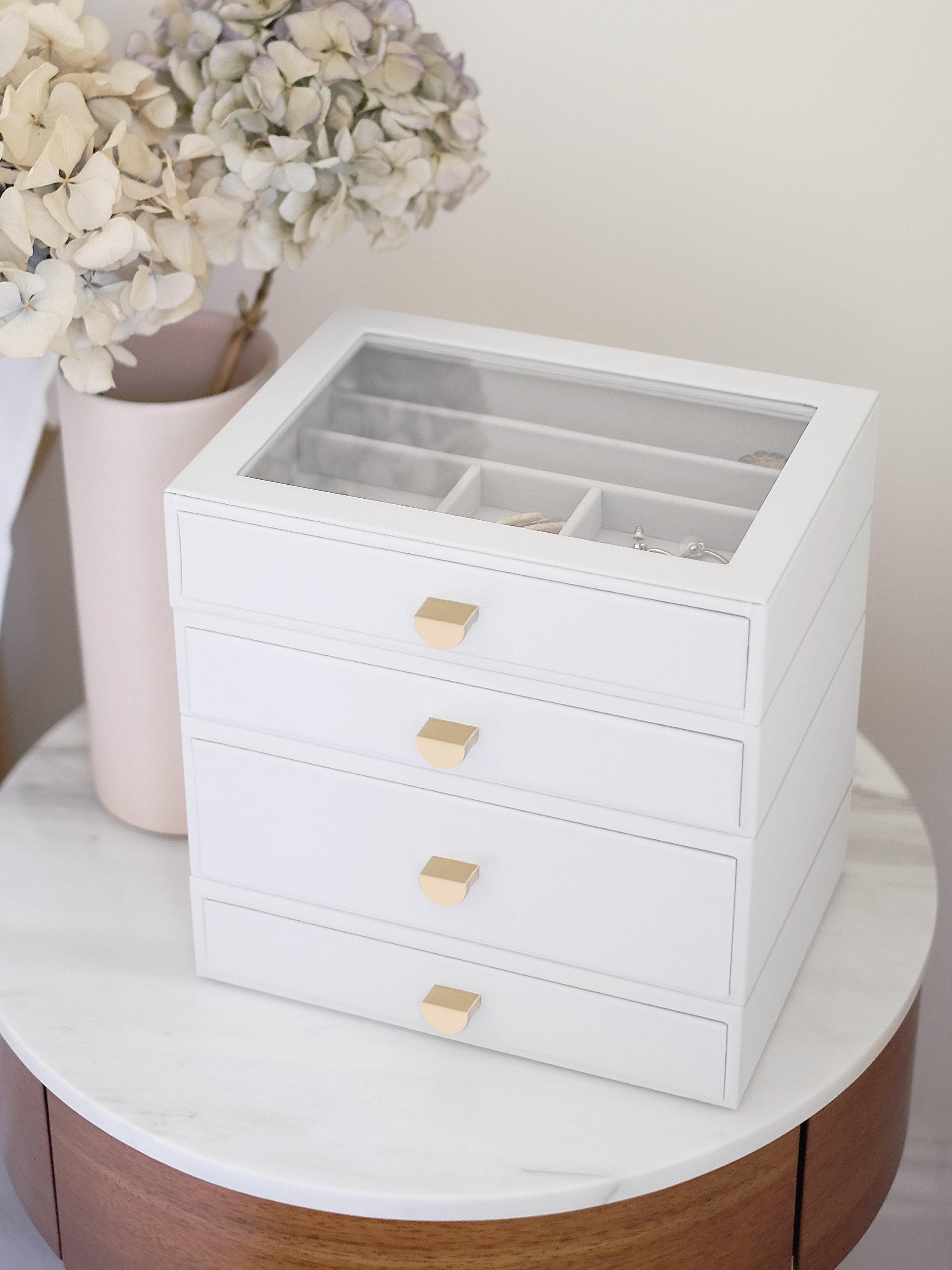There'll be no excuse for your favourite jewellery to be anything other than tangle-free and organised! The Classic Drawer Set of 4 is ideal for almost every jewellery collection. With plenty of space to keep your necklaces, rings, earrings, watches and more, beautifully organised and safe. Whats more, you can easily add another jewellery drawer layer as your collection grows! Featuring a clear glass lid for visibility and easy access to your favourite pieces.