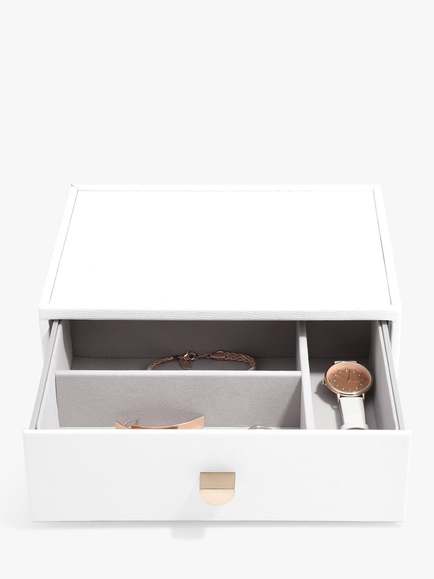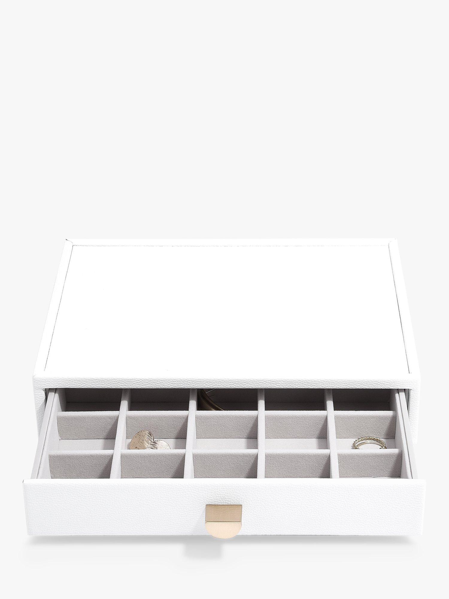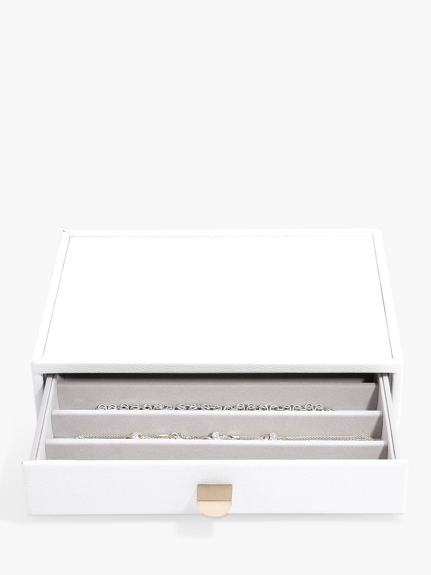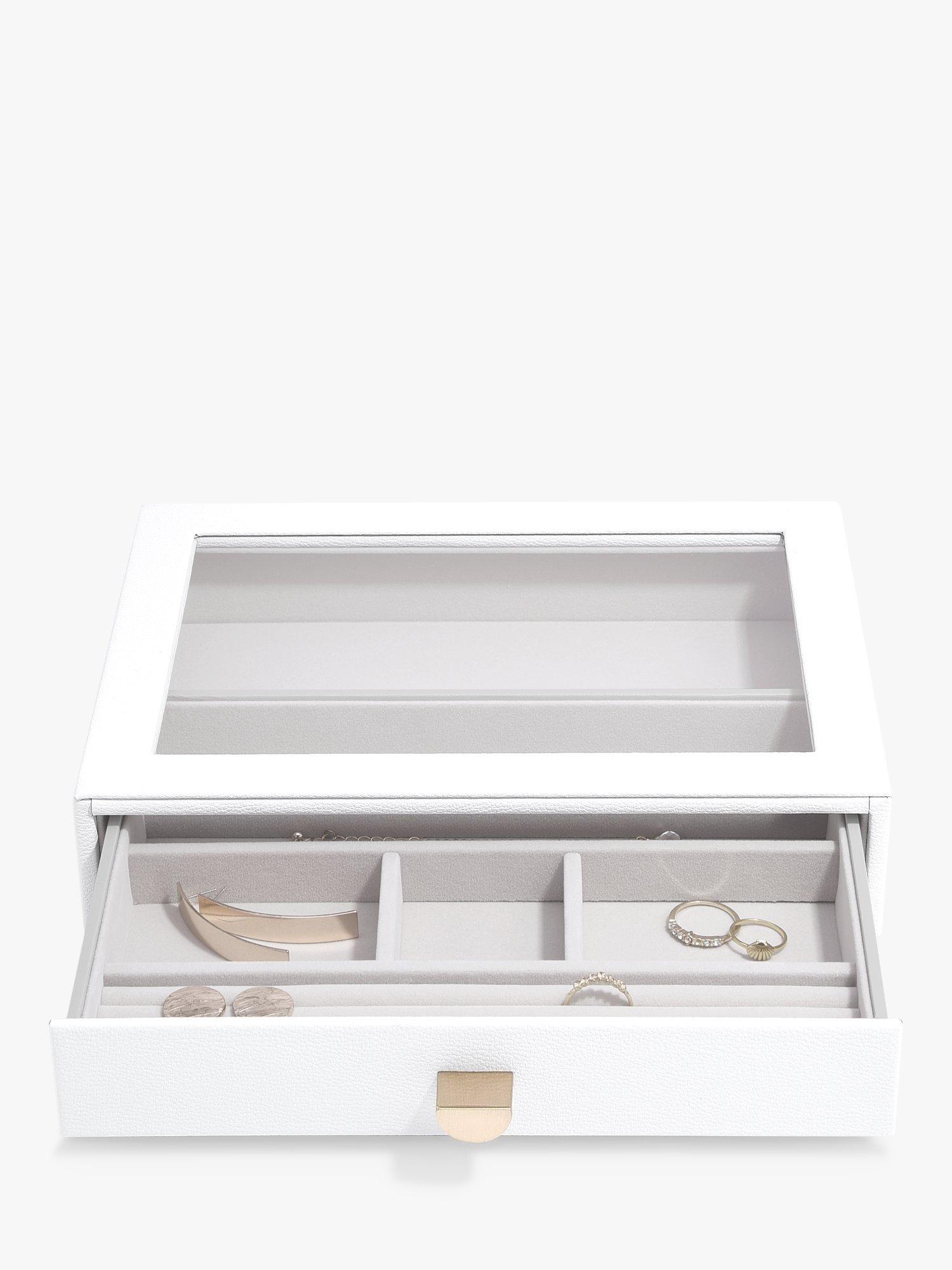 There'll be no excuse for your favourite jewellery to be anything other than tangle-free and organised! The Classic Drawer Set of 4 is ideal for almost every jewellery collection. With plenty of space to keep your necklaces, rings, earrings, watches and more, beautifully organised and safe. Whats more, you can easily add another jewellery drawer layer as your collection grows! Featuring a clear glass lid for visibility and easy access to your favourite pieces.