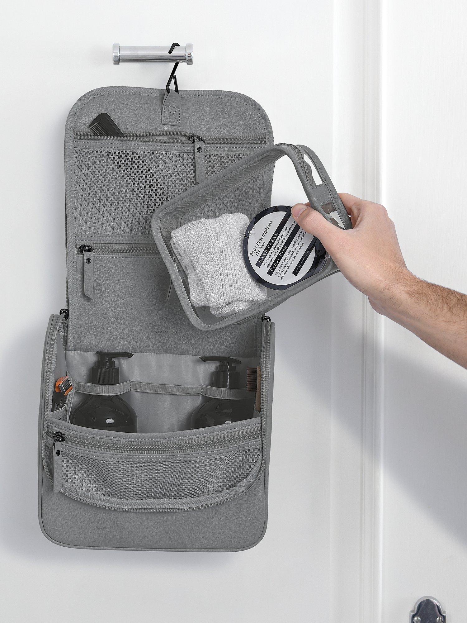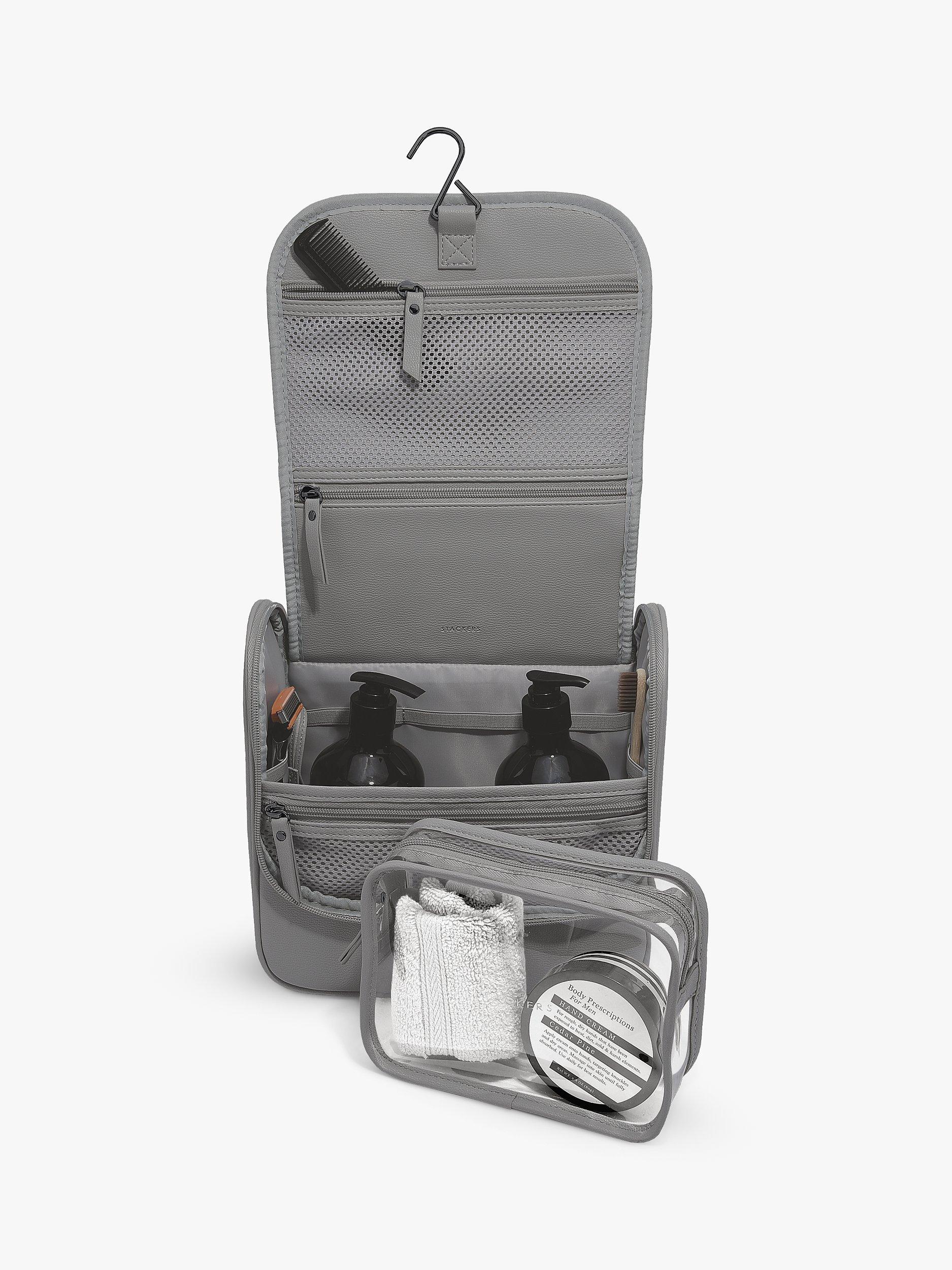 Perfect for the traveller, this Stackers hanging wash bag features a clear removable bag so that liquids can be displayed at airport security.