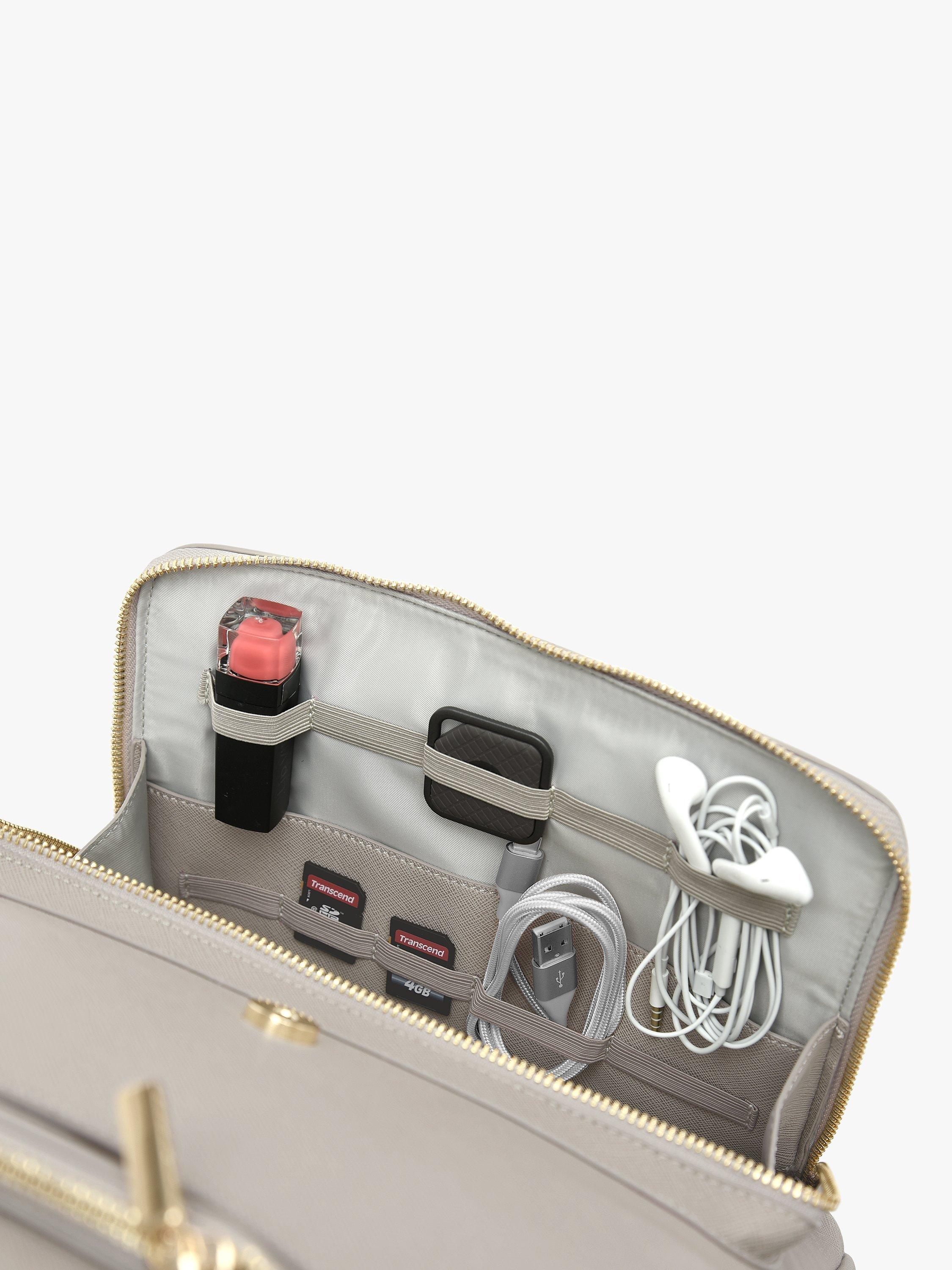 Bring some order to everyday..With a faux leather exterior, this backpack includes a large internal padded sleeve for your laptop (up to 13 inch), multiple pockets, a space for your drinks bottle and a large compartment for all your daily essentials. There are additional zipped pockets to the back and the inside of the lid as well a large zipped pocket with elasticated compartments for smaller accessories