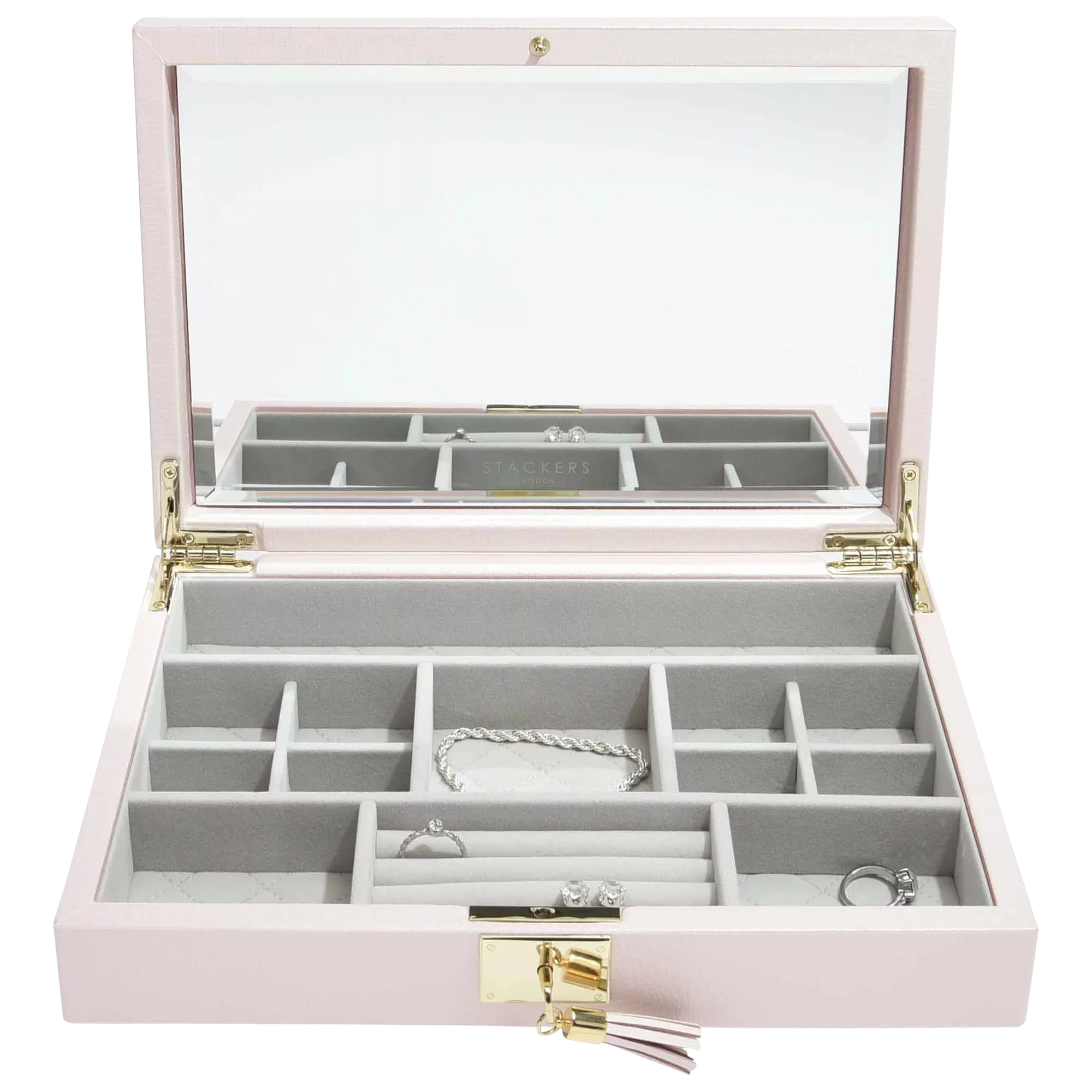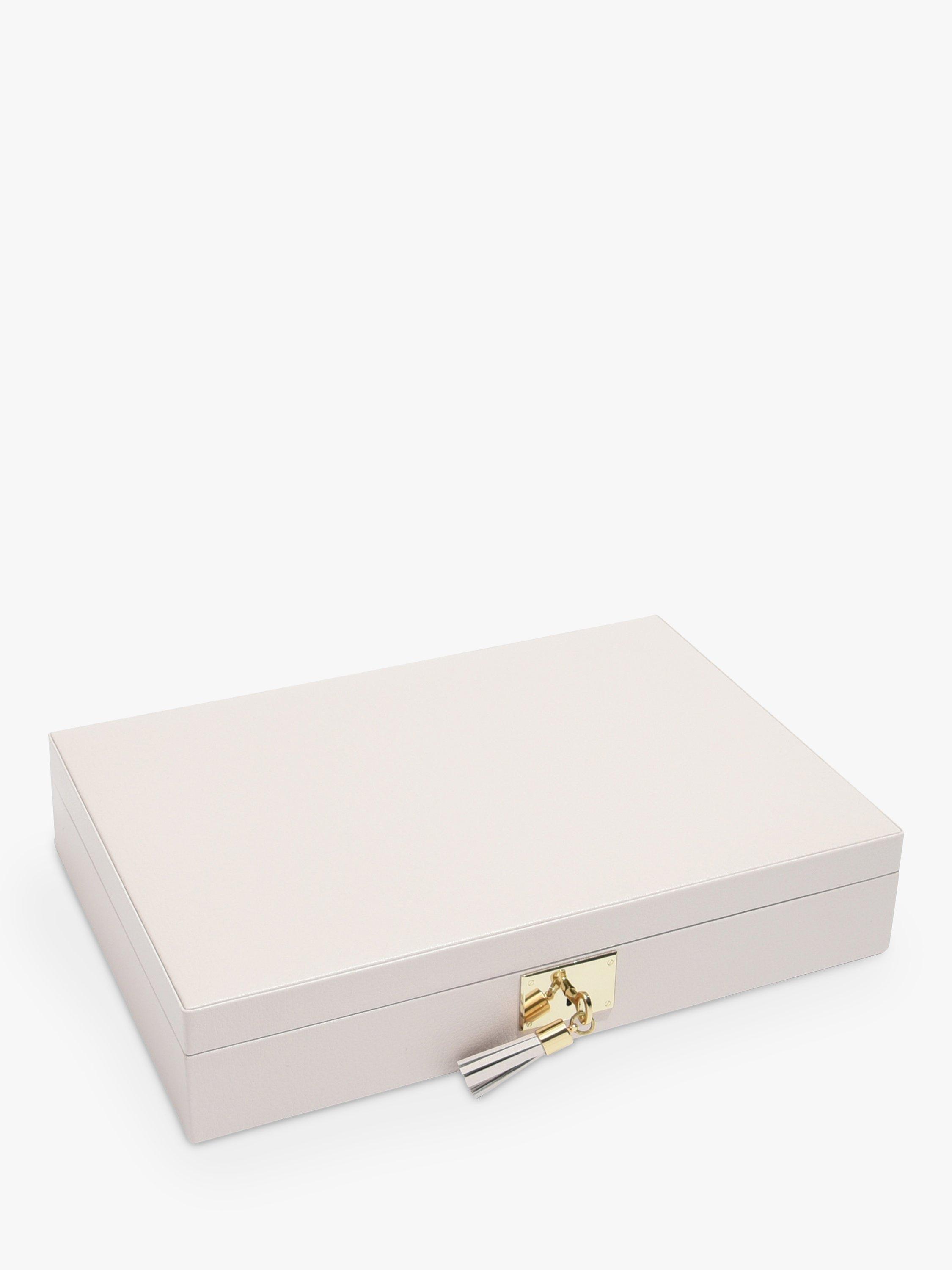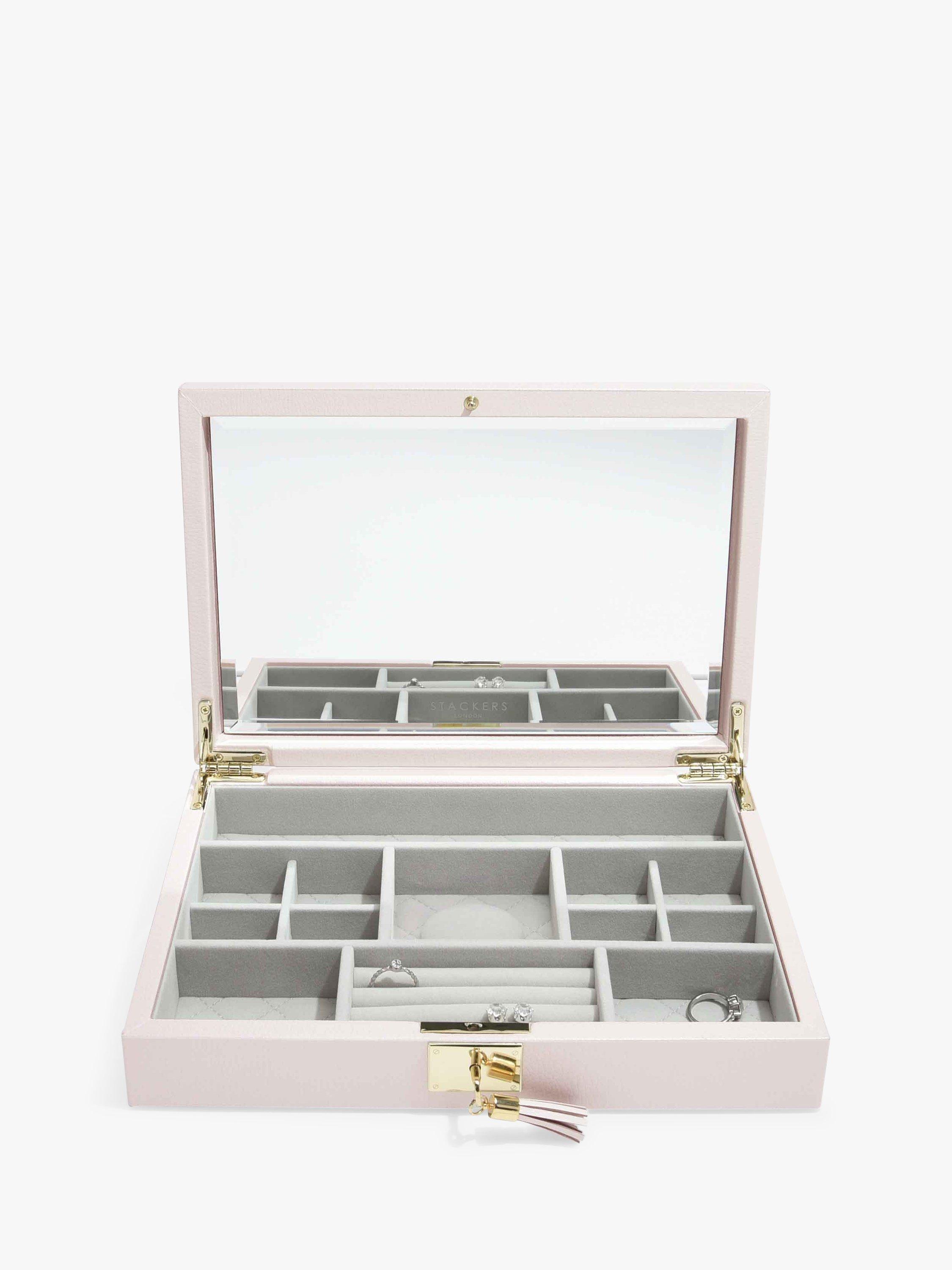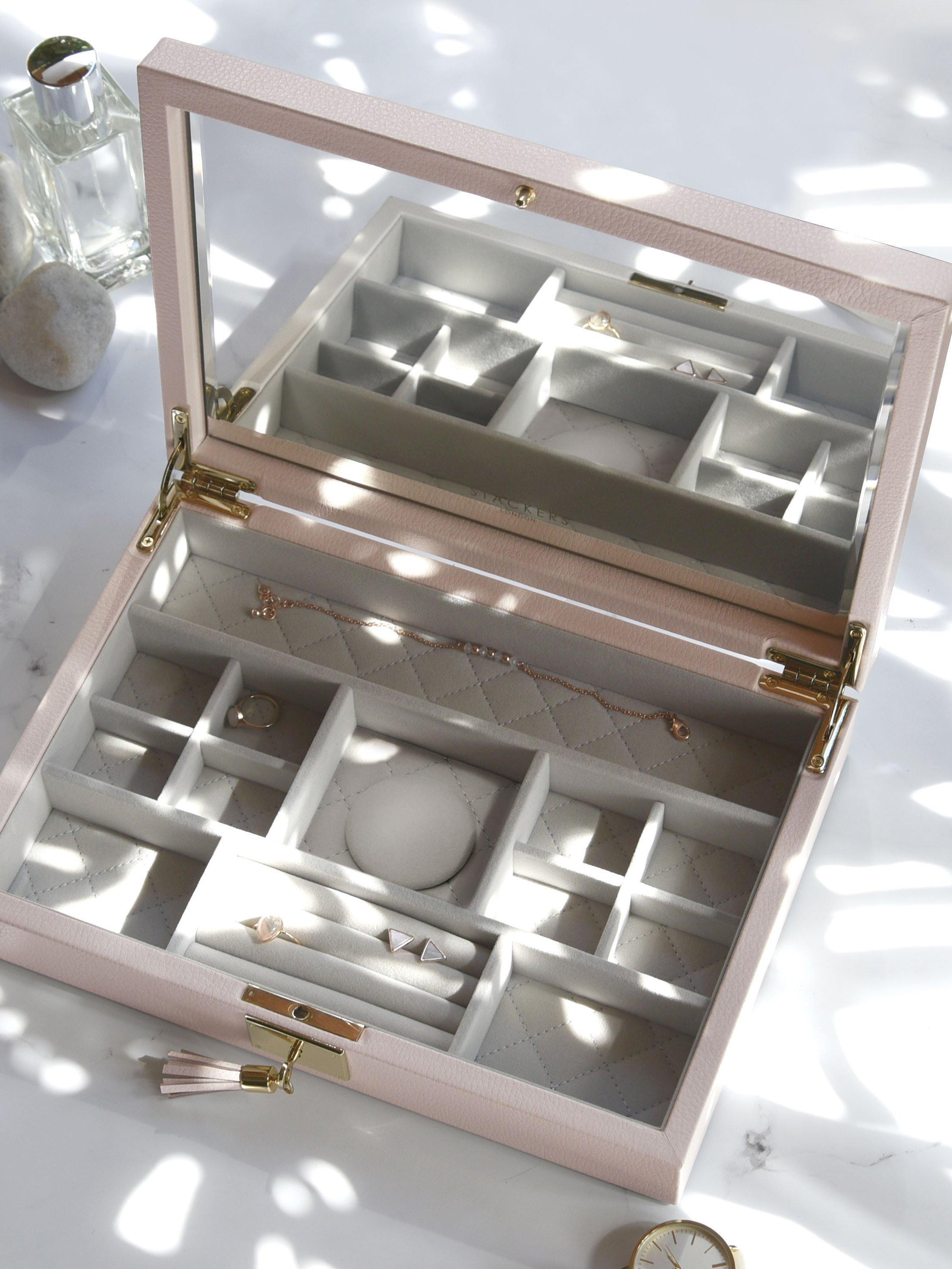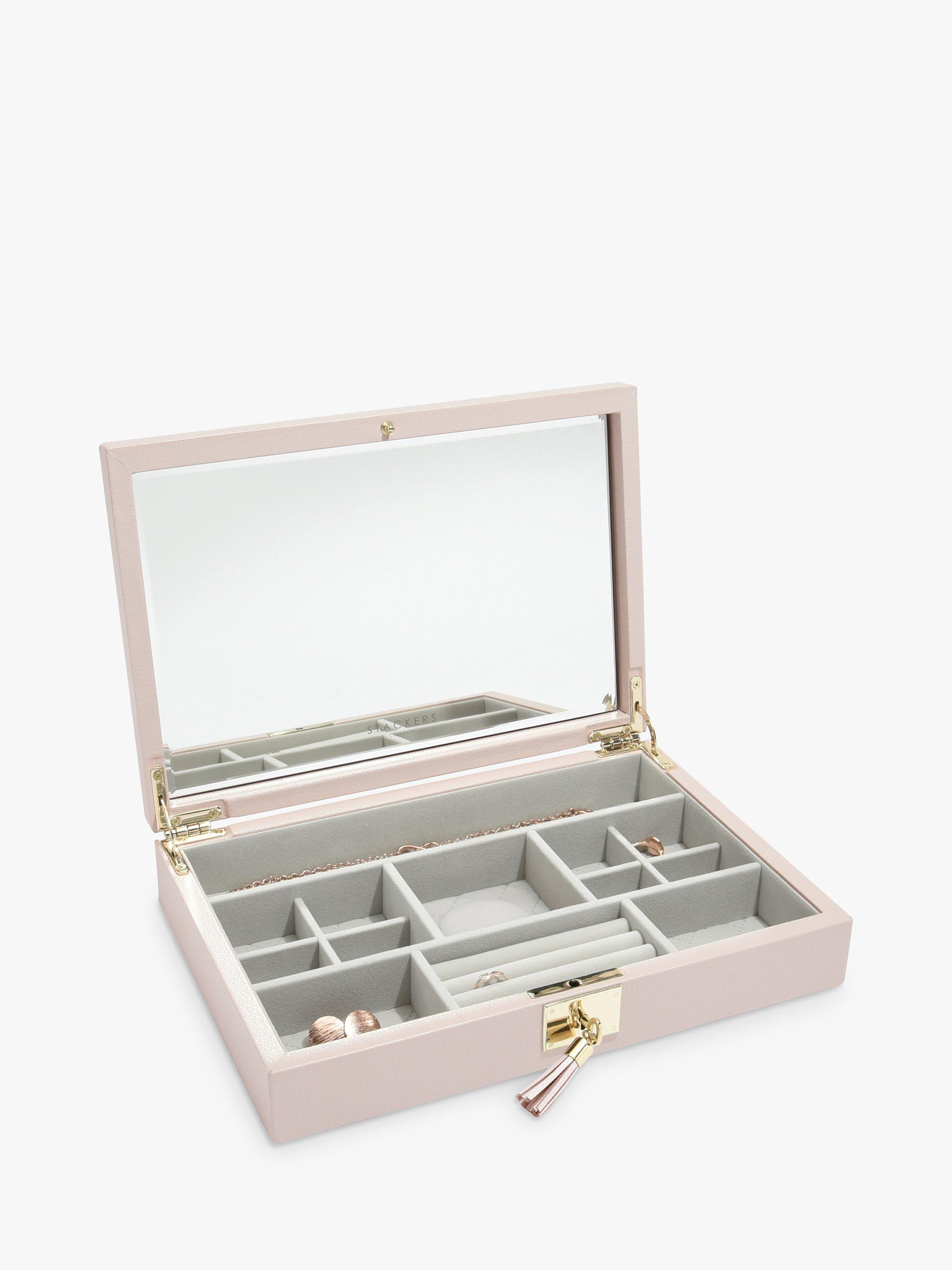 Beautifully crafted with smooth premium bonded leather and lined with soft grey velvet, this jewellery box features a full size bevelled mirror beneath the lid, smaller compartments for your finer jewellery and finally a matching lock and key to make sure your jewellery is kept safe.