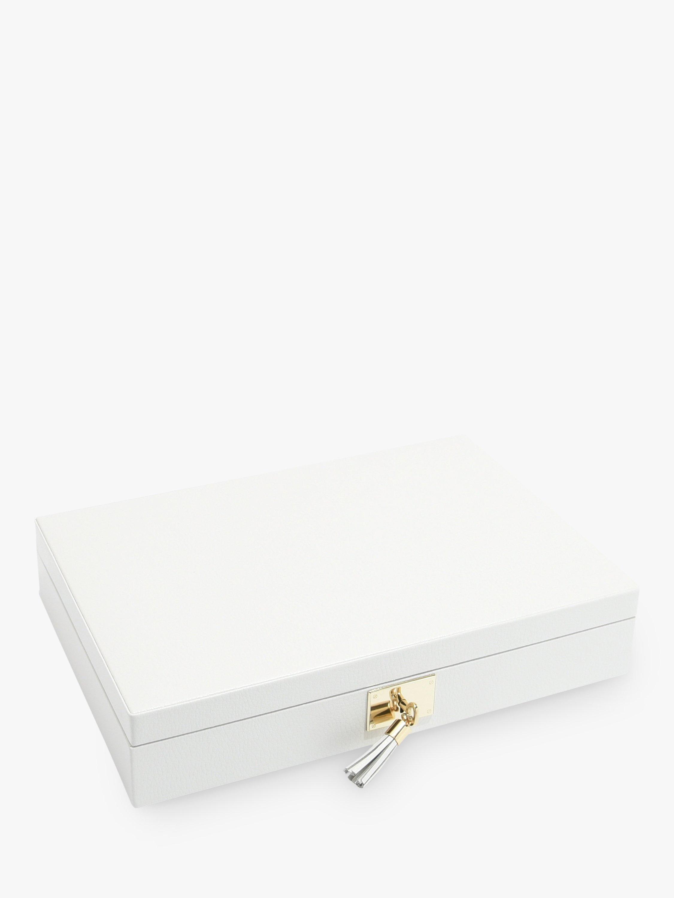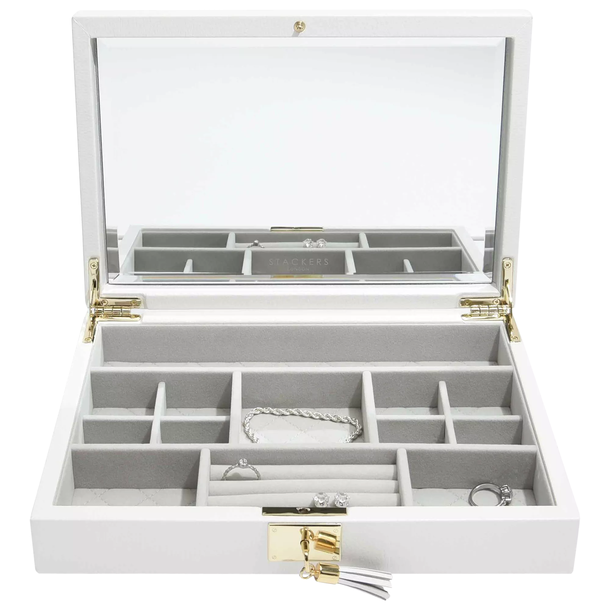 Beautifully crafted with smooth premium bonded leather and lined with soft grey velvet, this jewellery box features a full size bevelled mirror beneath the lid, smaller compartments for your finer jewellery and finally a matching lock and key to make sure your jewellery is kept safe.