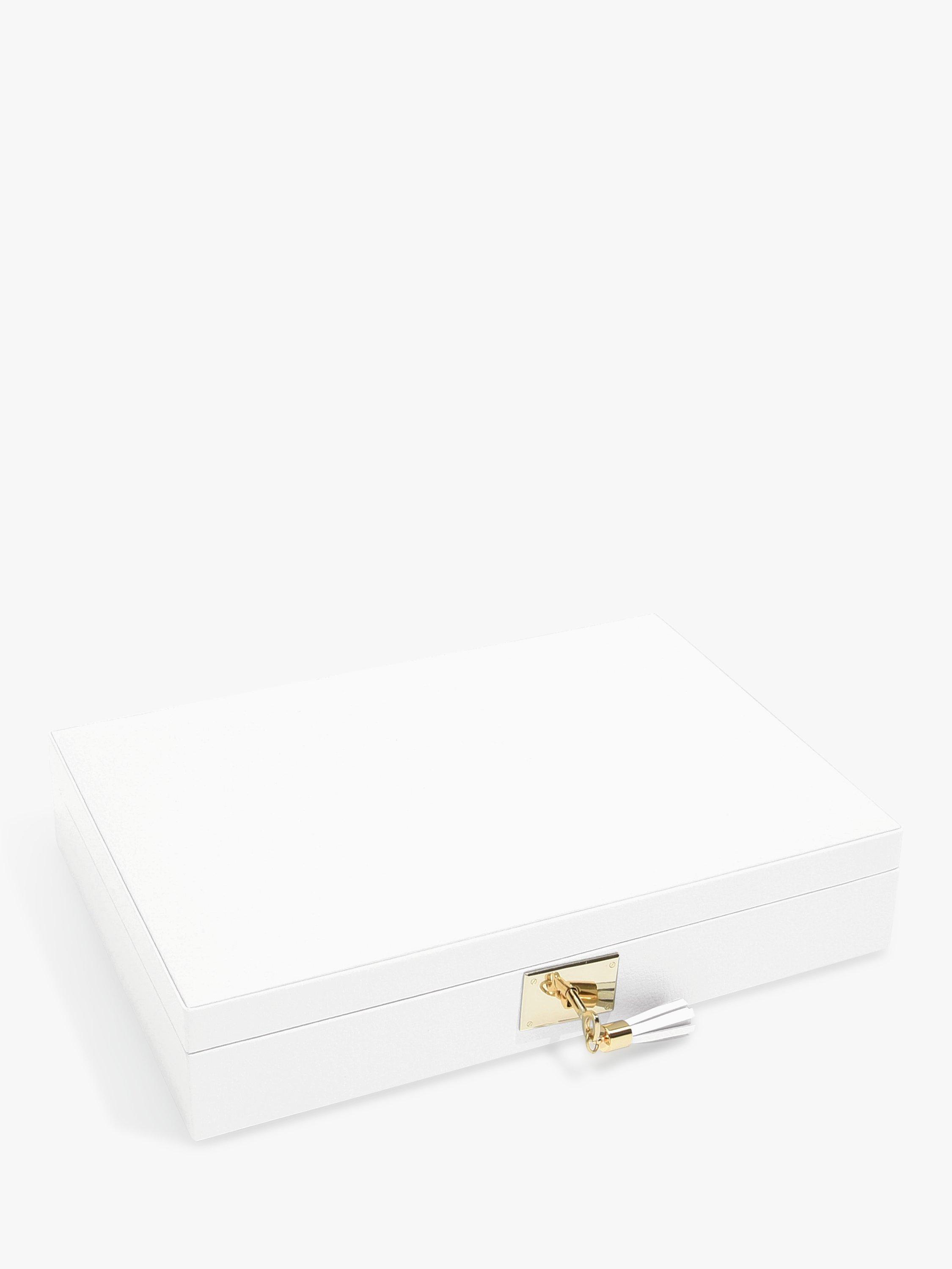 This beautifully luxurious leather jewellery box is ideal for housing your jewellery collection, from necklaces and bracelets to rings and earrings. This lid includes a fitted ring roll and 12 storage sections, with a longer compartment perfect for keeping necklaces tangle-free. Complete with an interior mirror and finished with gold detailing as well as a lock with a leather tasselled key, to keep your sentimental items safe and secure.