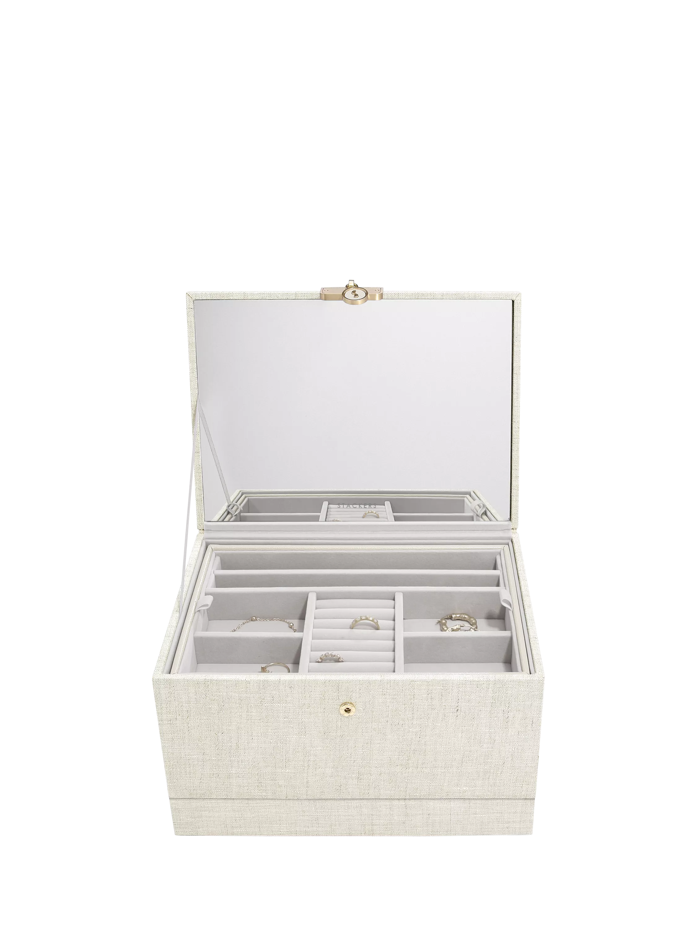 Inside there is a Stackers branded mirror and plenty of space to keep your necklaces, rings, earrings, watches and more safely organised and displayed. The top tray includes a ring roll for rings and stud earrings, long necklace sections and further sections for bracelets and statement earrings. You can add the Pendant Necklace Accessory and Earring Accessory to the tray for more storage. Underneath are larger sections for chunky jewellery and accessories, which can fit the Medium Travel Jewellery Box and Ring Roll or Watch Pad.