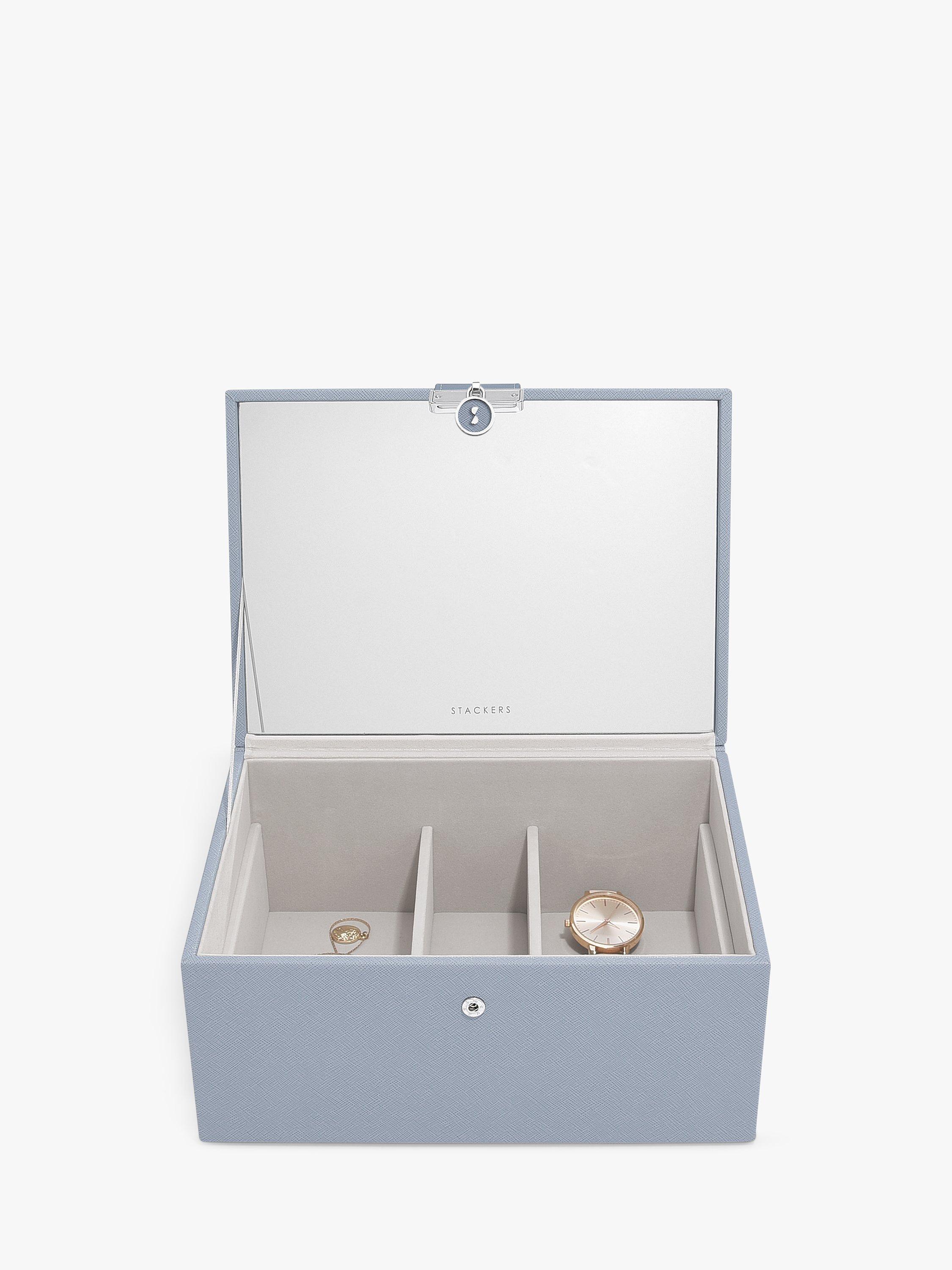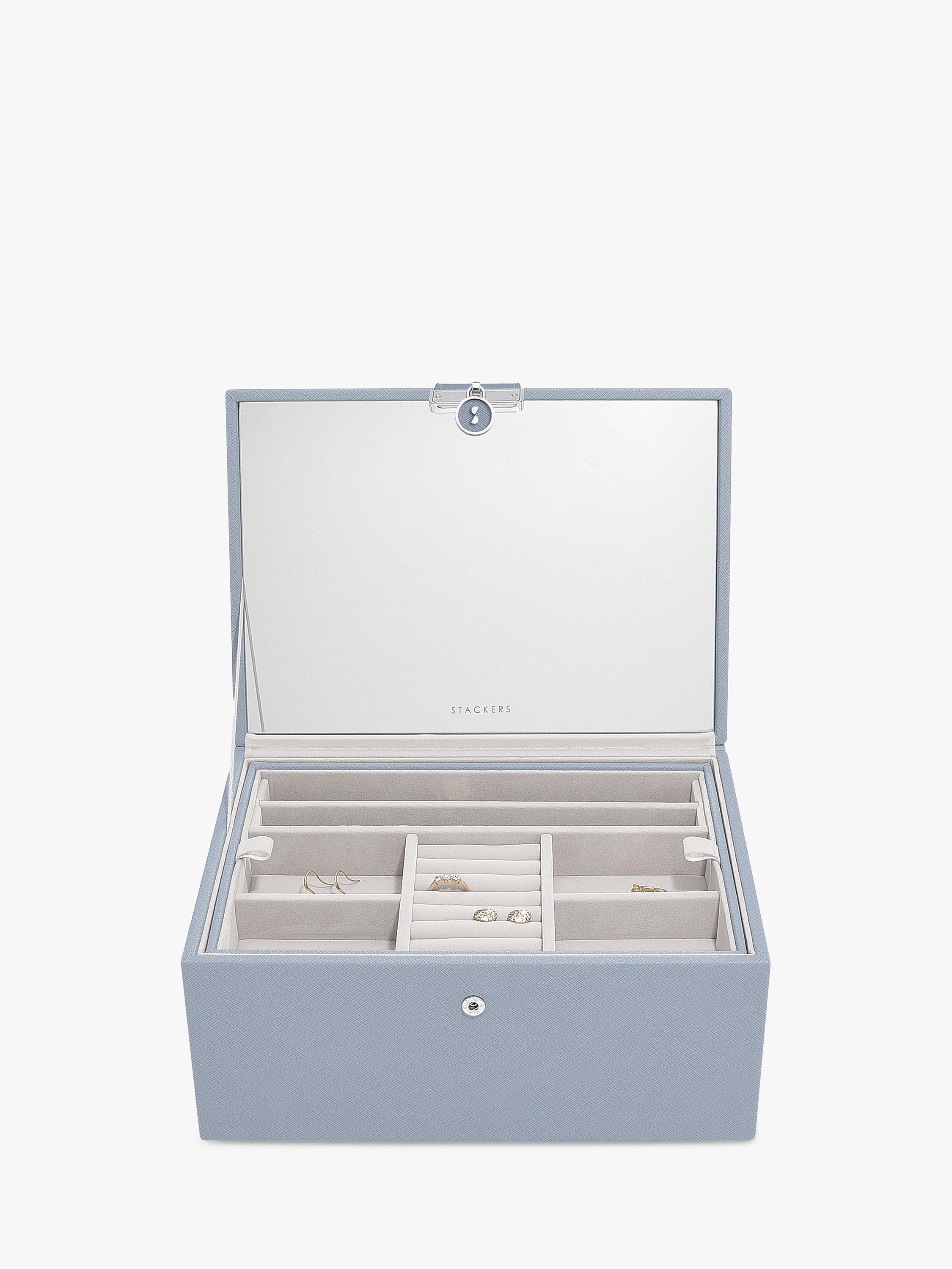 Inside there is a Stackers branded mirror and plenty of space to keep your necklaces, rings, earrings, watches and more safely organised and displayed. The top tray includes a ring roll for rings and stud earrings, long necklace sections and further sections for bracelets and statement earrings. You can add the Pendant Necklace Accessory and Earring Accessory to the tray for more storage. Underneath are larger sections for chunky jewellery and accessories, which can fit the Medium Travel Jewellery Box and Ring Roll or Watch Pad. You can also add further classic jewellery box layers as your collection grows.