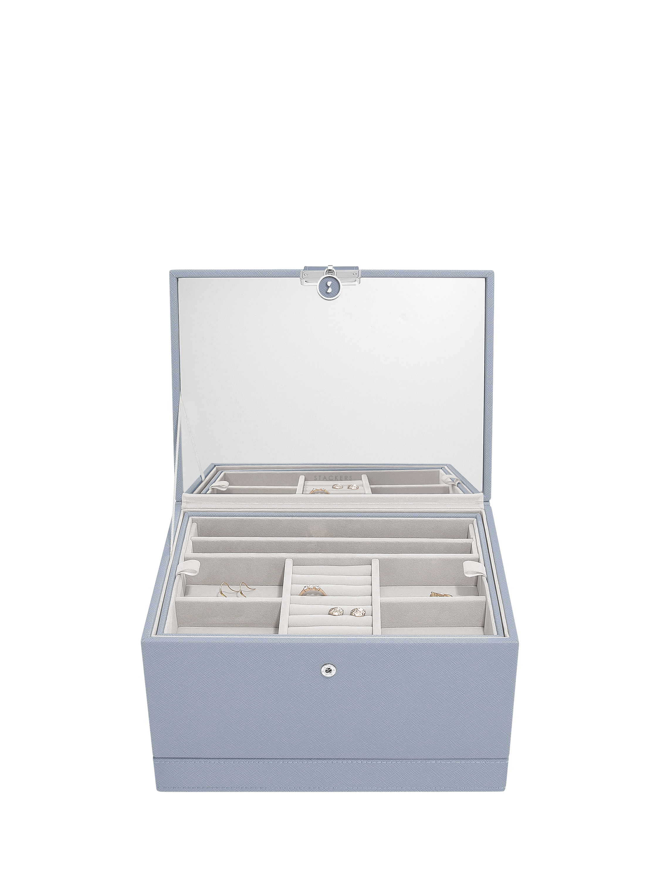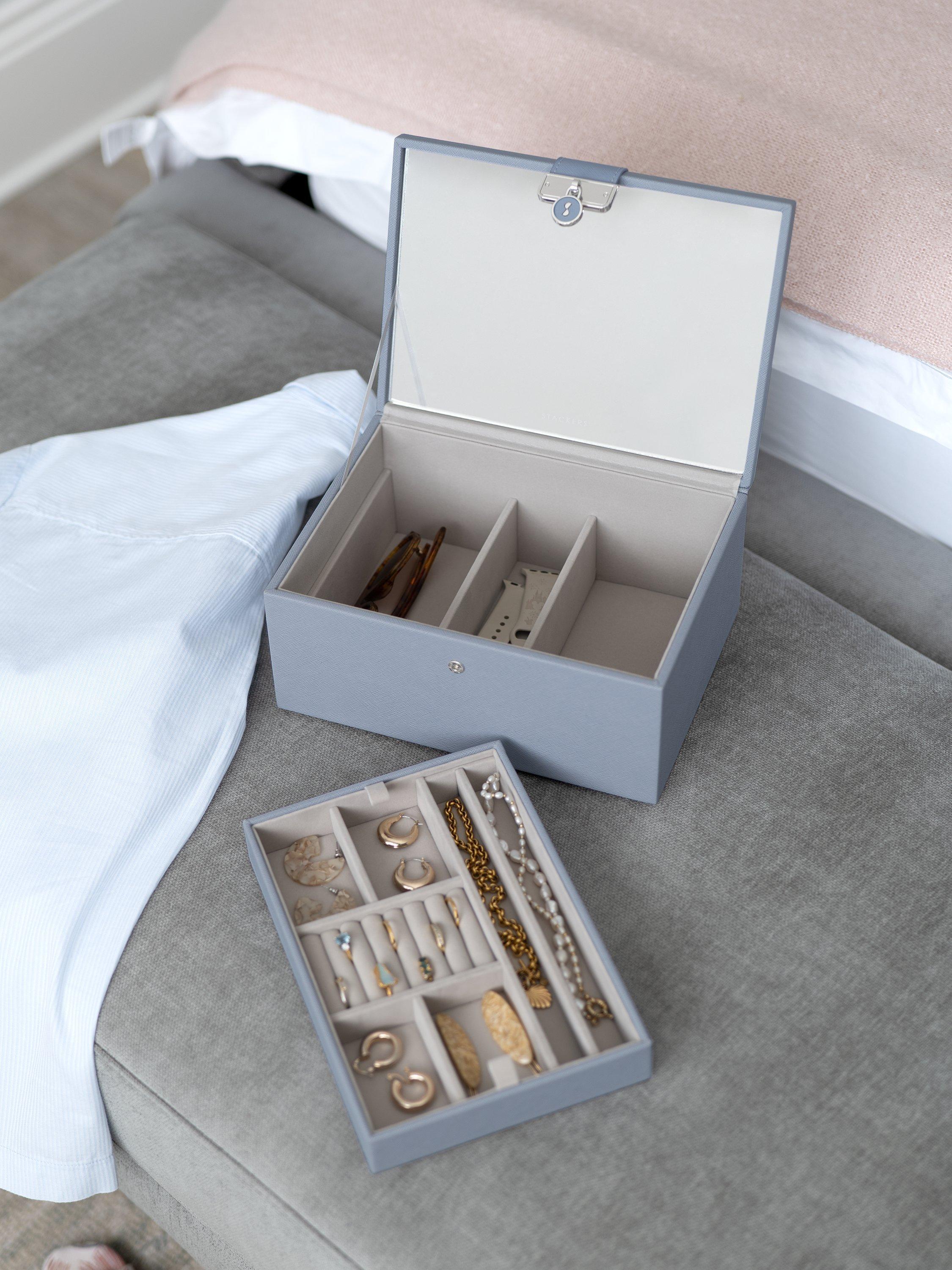 Inside there is a Stackers branded mirror and plenty of space to keep your necklaces, rings, earrings, watches and more safely organised and displayed. The top tray includes a ring roll for rings and stud earrings, long necklace sections and further sections for bracelets and statement earrings. You can add the Pendant Necklace Accessory and Earring Accessory to the tray for more storage. Underneath are larger sections for chunky jewellery and accessories, which can fit the Medium Travel Jewellery Box and Ring Roll or Watch Pad.