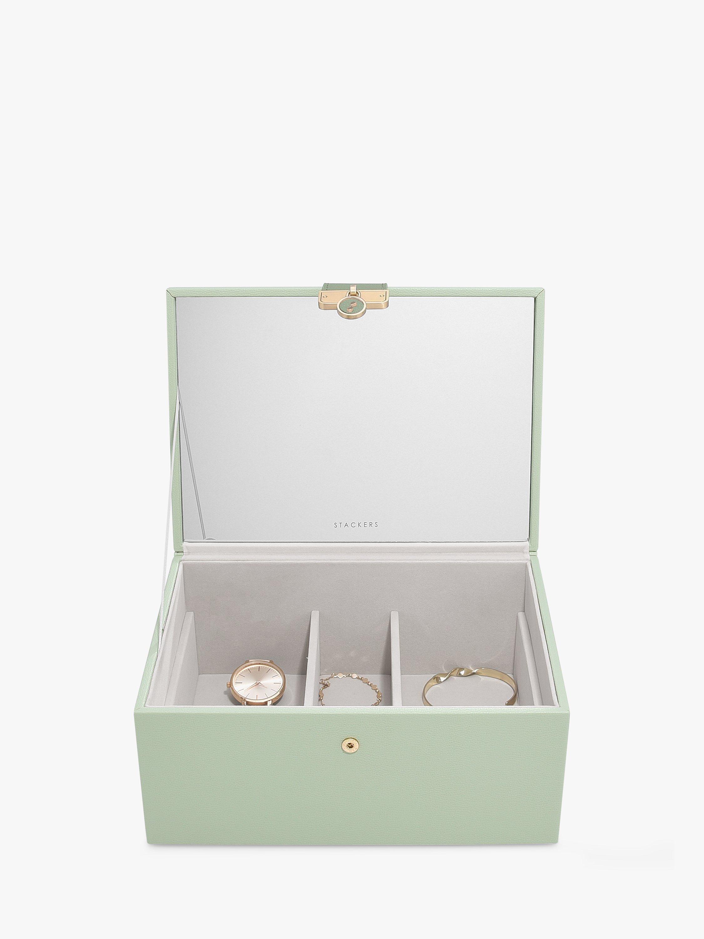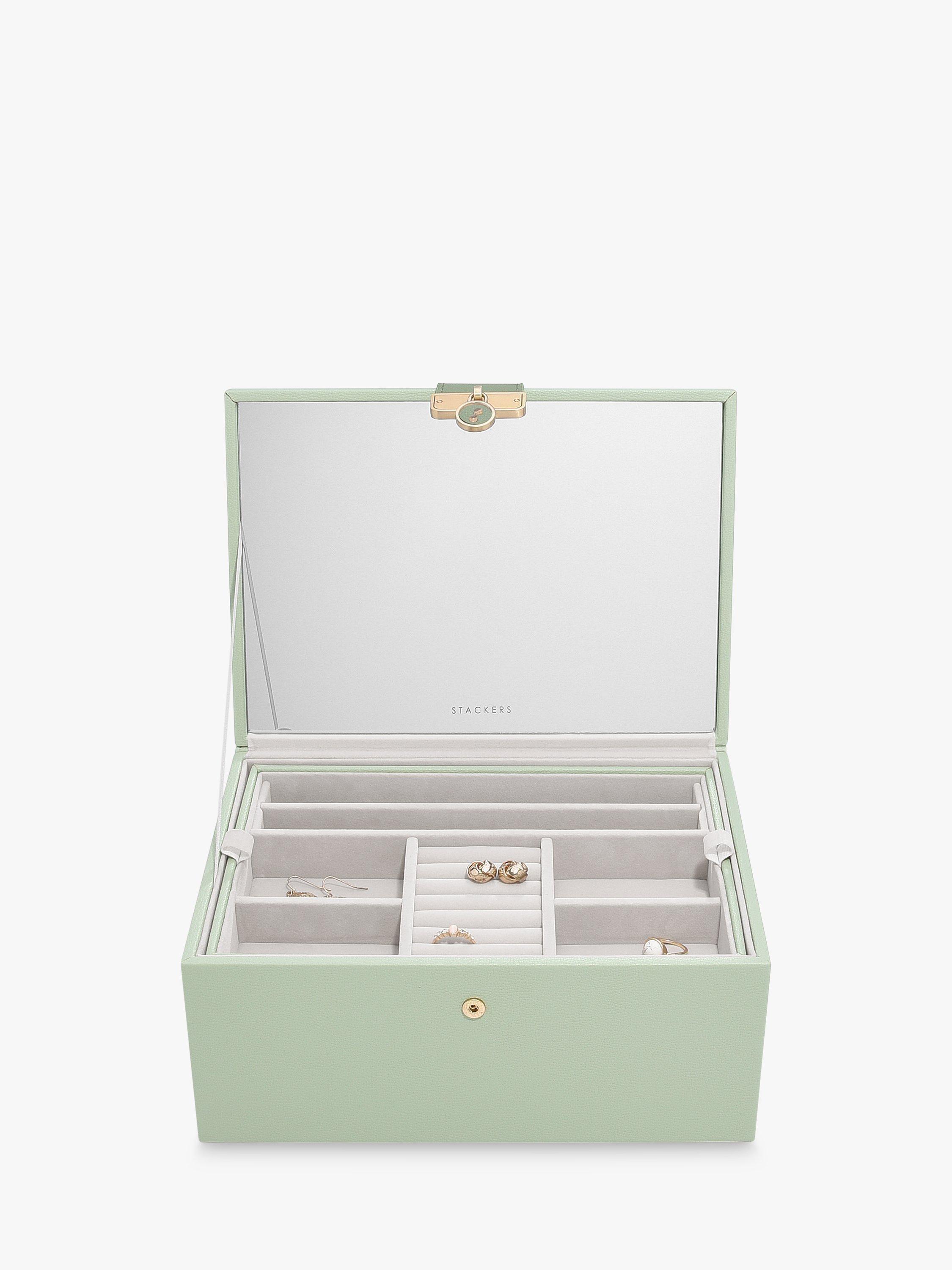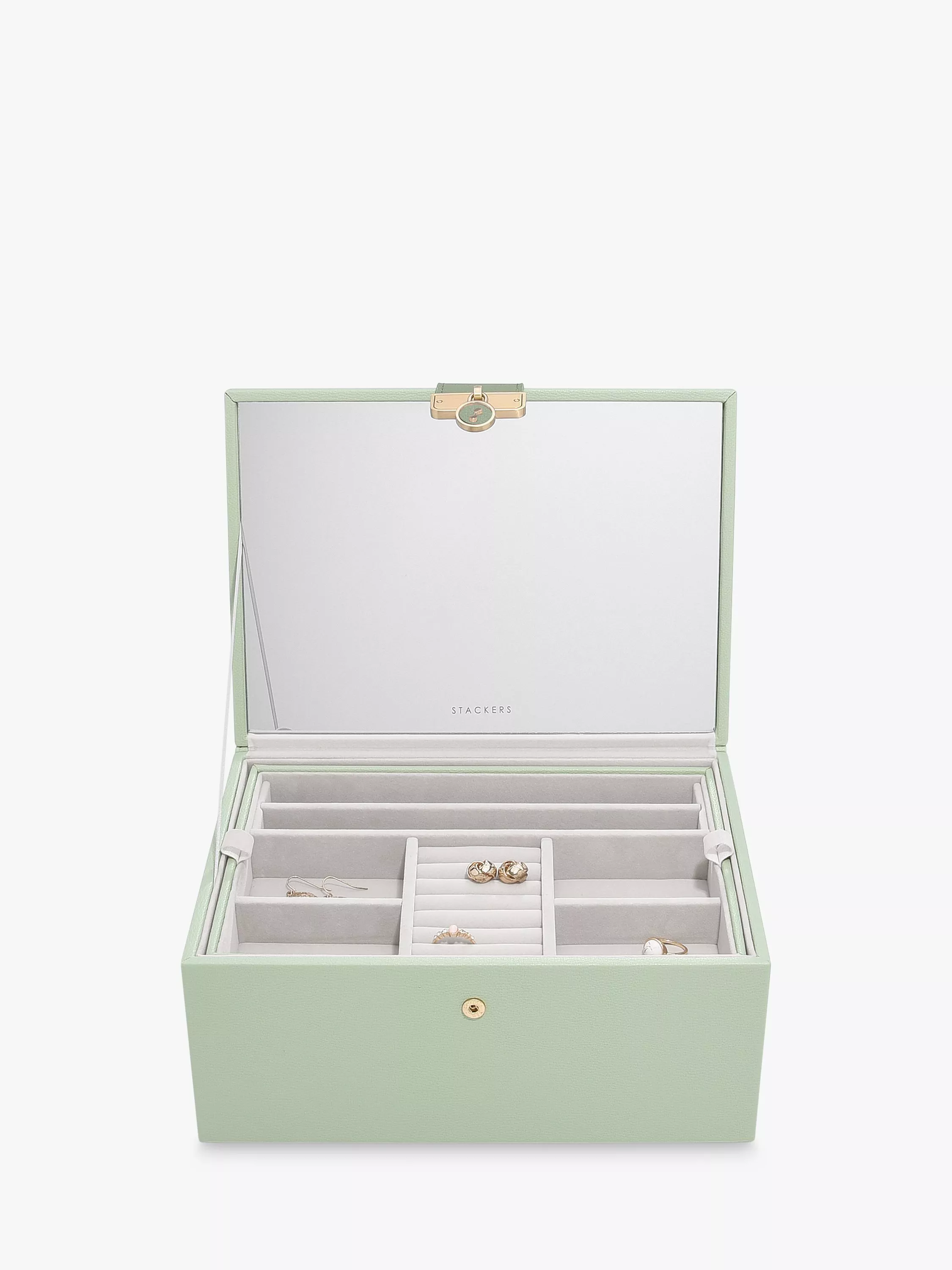 Inside there is a Stackers branded mirror and plenty of space to keep your necklaces, rings, earrings, watches and more safely organised and displayed. The top tray includes a ring roll for rings and stud earrings, long necklace sections and further sections for bracelets and statement earrings. You can add the Pendant Necklace Accessory and Earring Accessory to the tray for more storage. Underneath are larger sections for chunky jewellery and accessories, which can fit the Medium Travel Jewellery Box and Ring Roll or Watch Pad. You can also add further classic jewellery box layers as your collection grows.