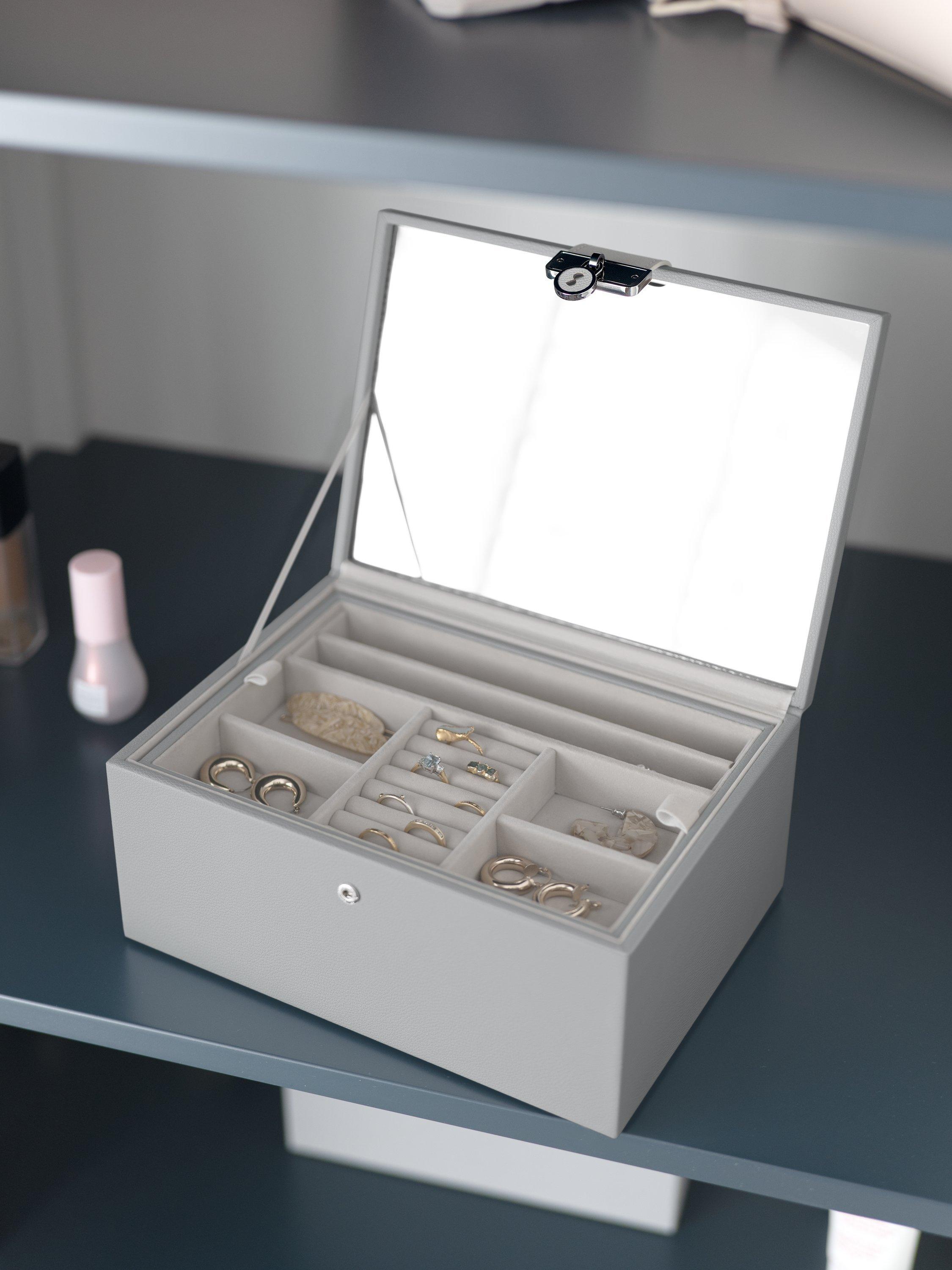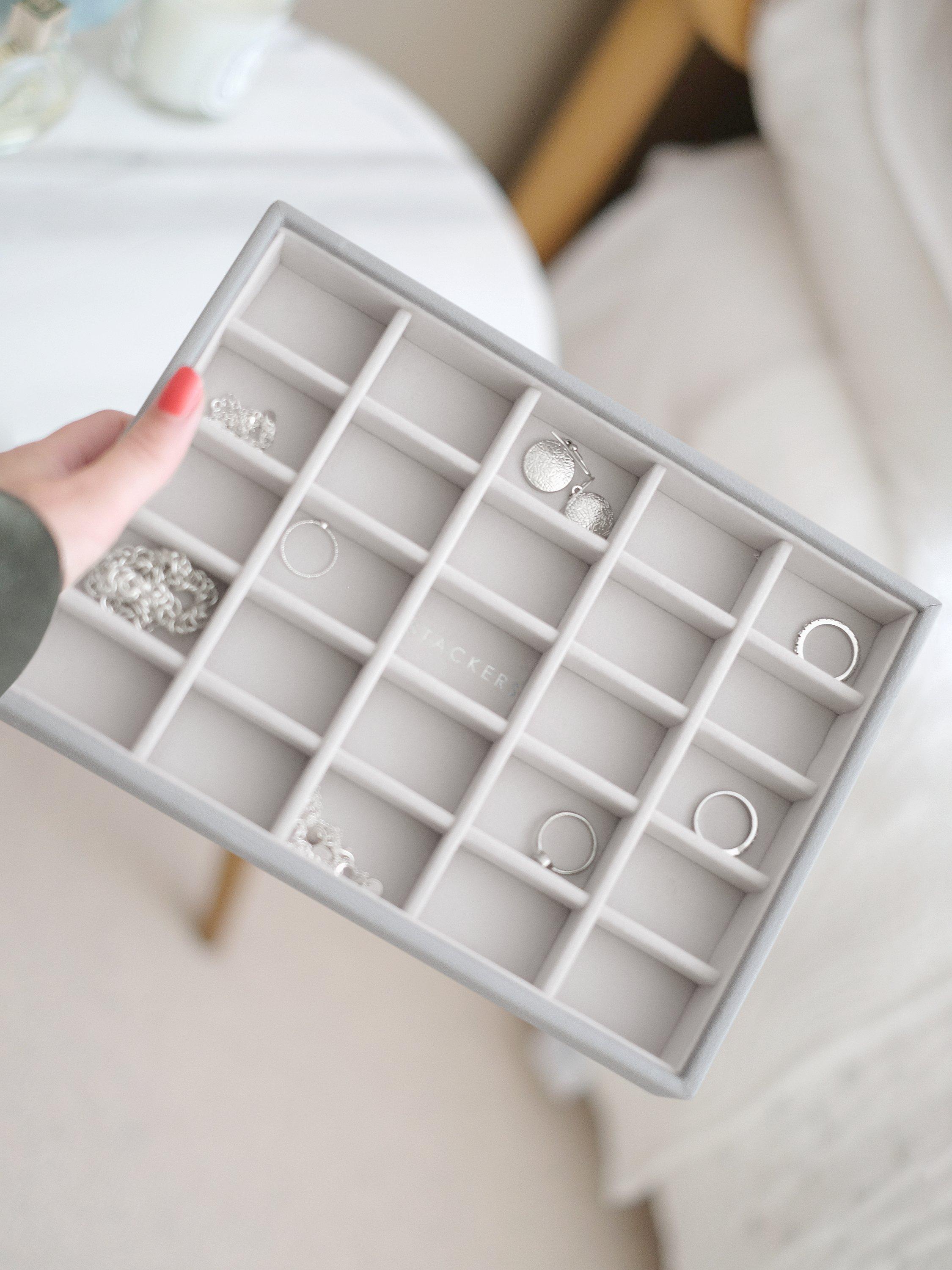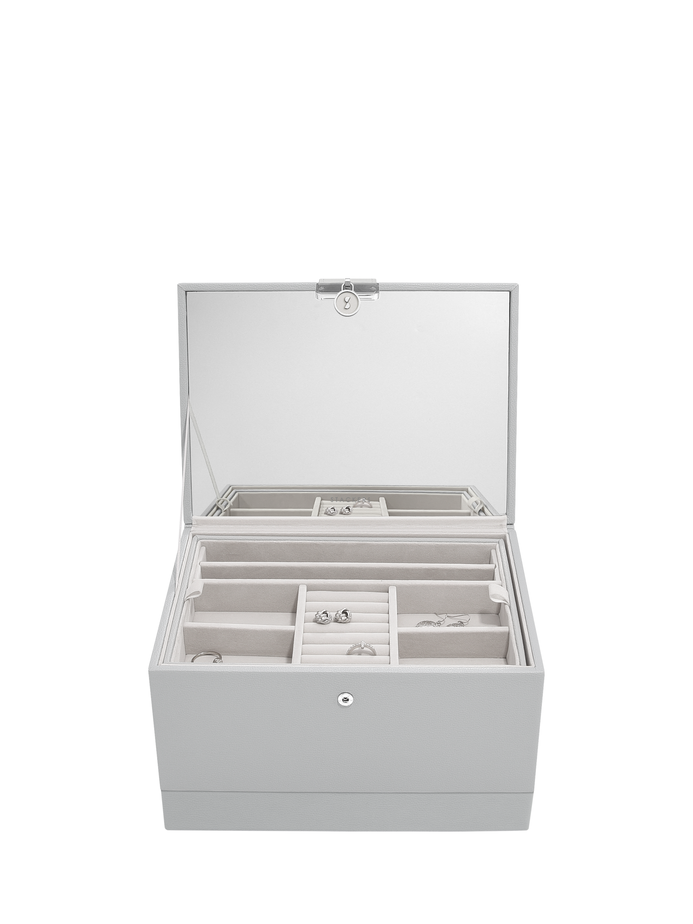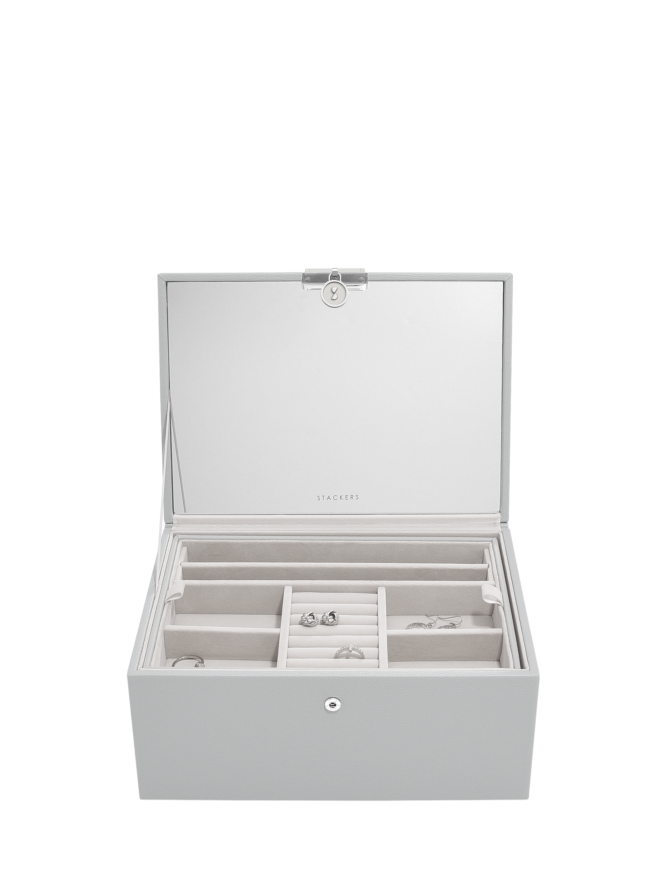 Inside there is a Stackers branded mirror and plenty of space to keep your necklaces, rings, earrings, watches and more safely organised and displayed. The top tray includes a ring roll for rings and stud earrings, long necklace sections and further sections for bracelets and statement earrings. You can add the Pendant Necklace Accessory and Earring Accessory to the tray for more storage. Underneath are larger sections for chunky jewellery and accessories, which can fit the Medium Travel Jewellery Box and Ring Roll or Watch Pad.