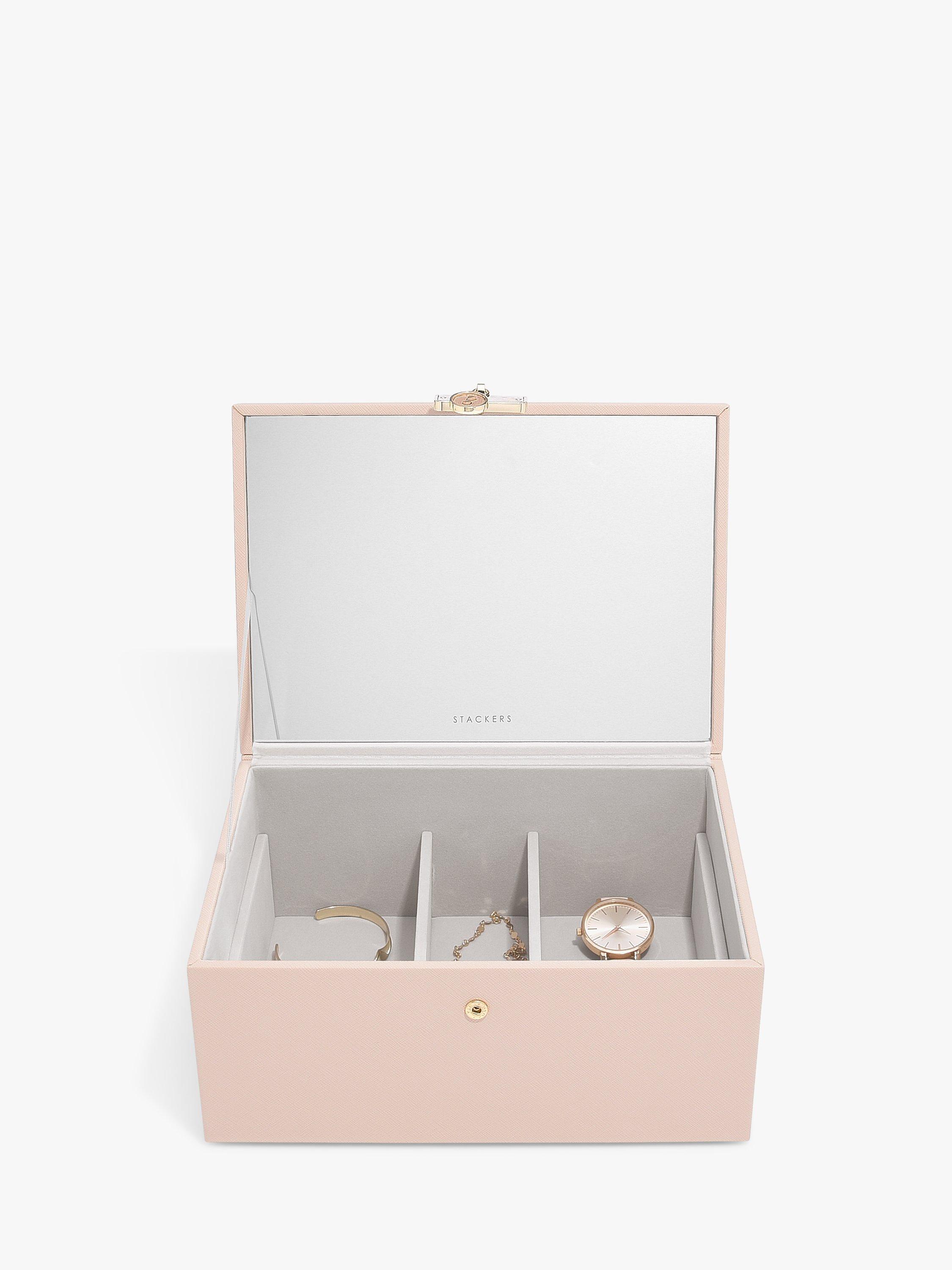Inside there is a Stackers branded mirror and plenty of space to keep your necklaces, rings, earrings, watches and more safely organised and displayed. The top tray includes a ring roll for rings and stud earrings, long necklace sections and further sections for bracelets and statement earrings. You can add the Pendant Necklace Accessory and Earring Accessory to the tray for more storage. Underneath are larger sections for chunky jewellery and accessories, which can fit the Medium Travel Jewellery Box and Ring Roll or Watch Pad. You can also add further classic jewellery box layers as your collection grows.