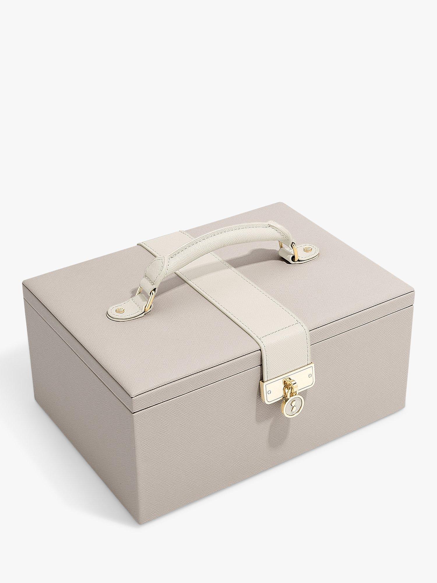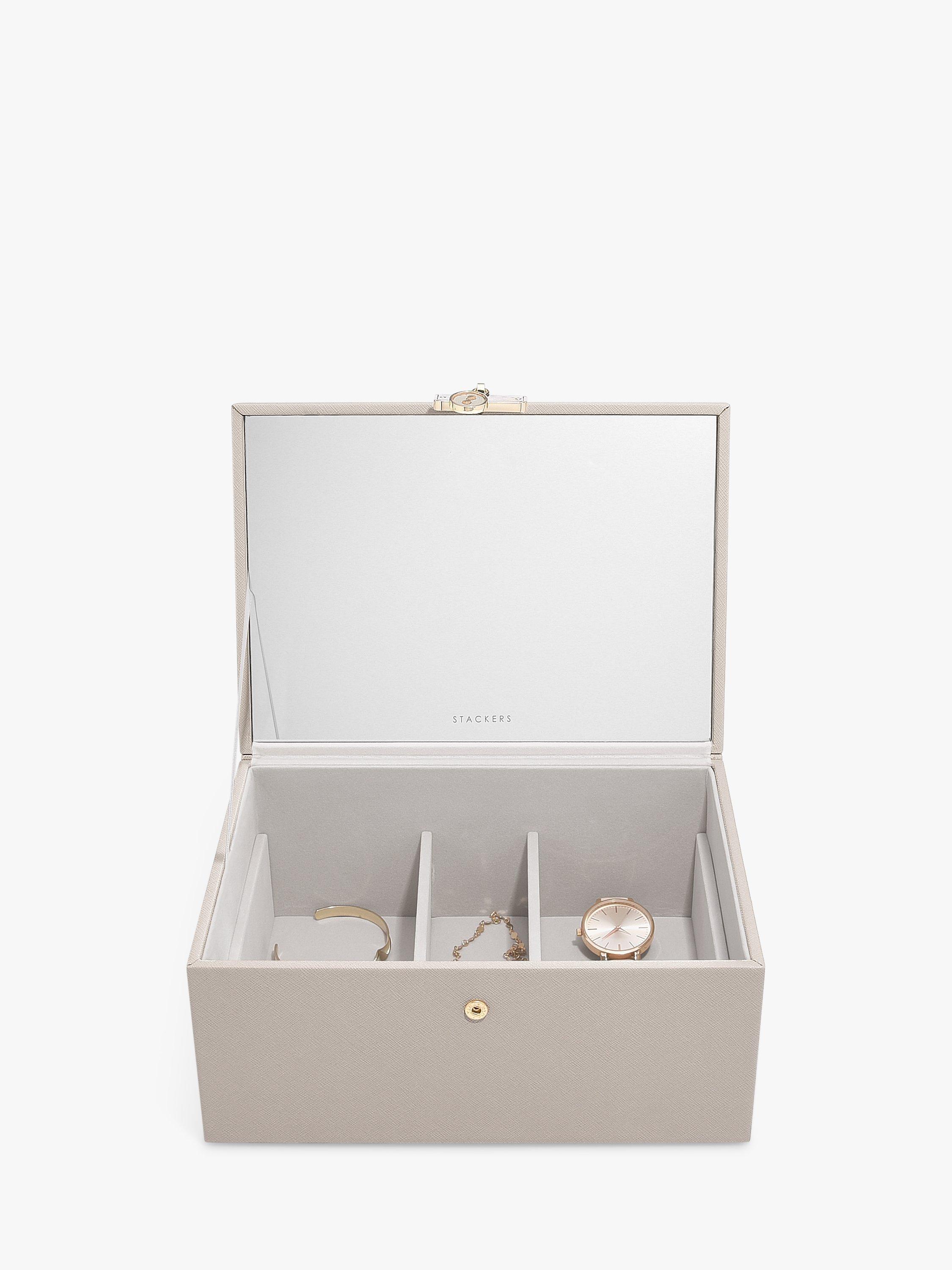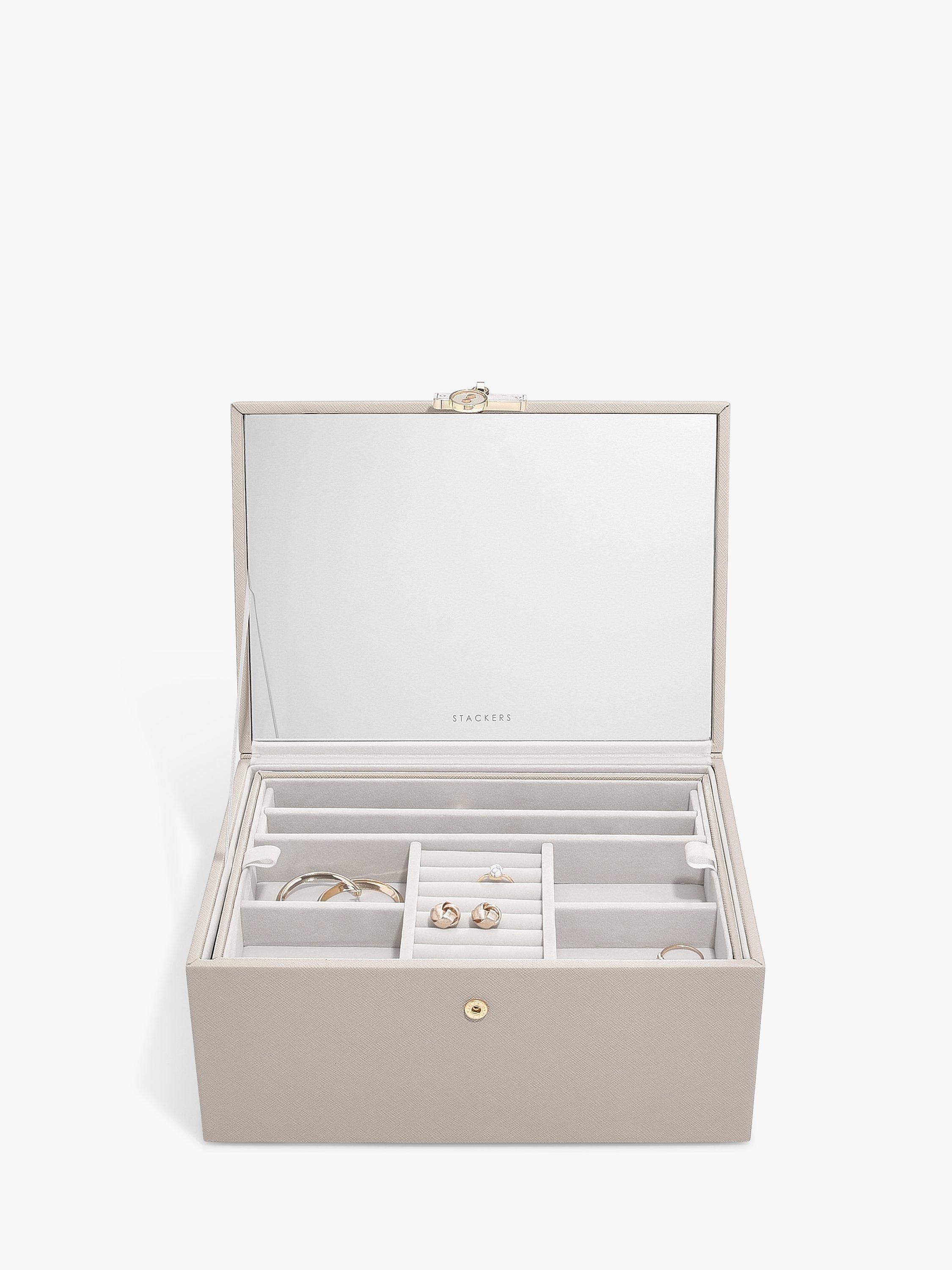 Inside there is a Stackers branded mirror and plenty of space to keep your necklaces, rings, earrings, watches and more safely organised and displayed. The top tray includes a ring roll for rings and stud earrings, long necklace sections and further sections for bracelets and statement earrings. You can add the Pendant Necklace Accessory and Earring Accessory to the tray for more storage. Underneath are larger sections for chunky jewellery and accessories, which can fit the Medium Travel Jewellery Box and Ring Roll or Watch Pad. You can also add further classic jewellery box layers as your collection grows.