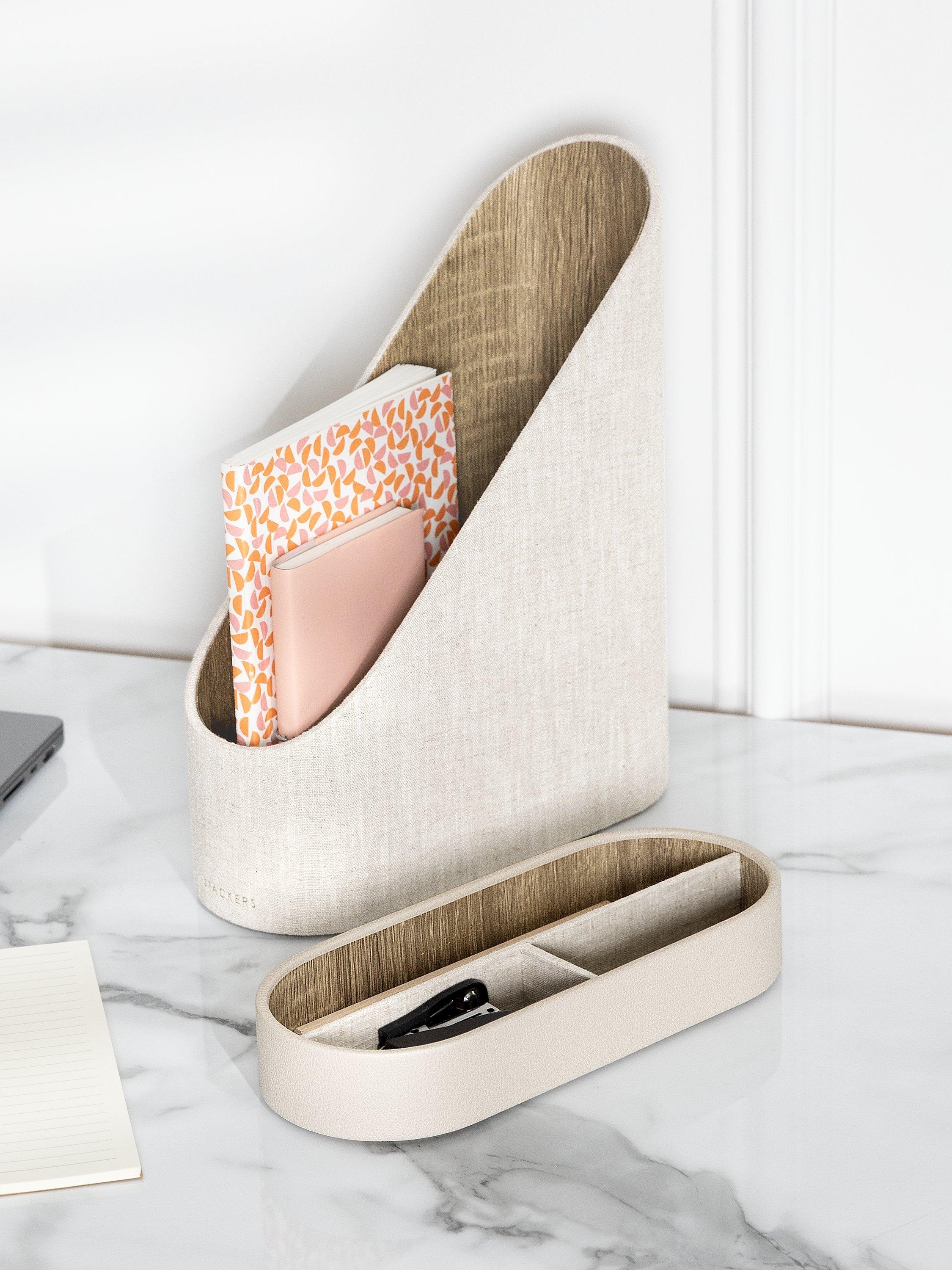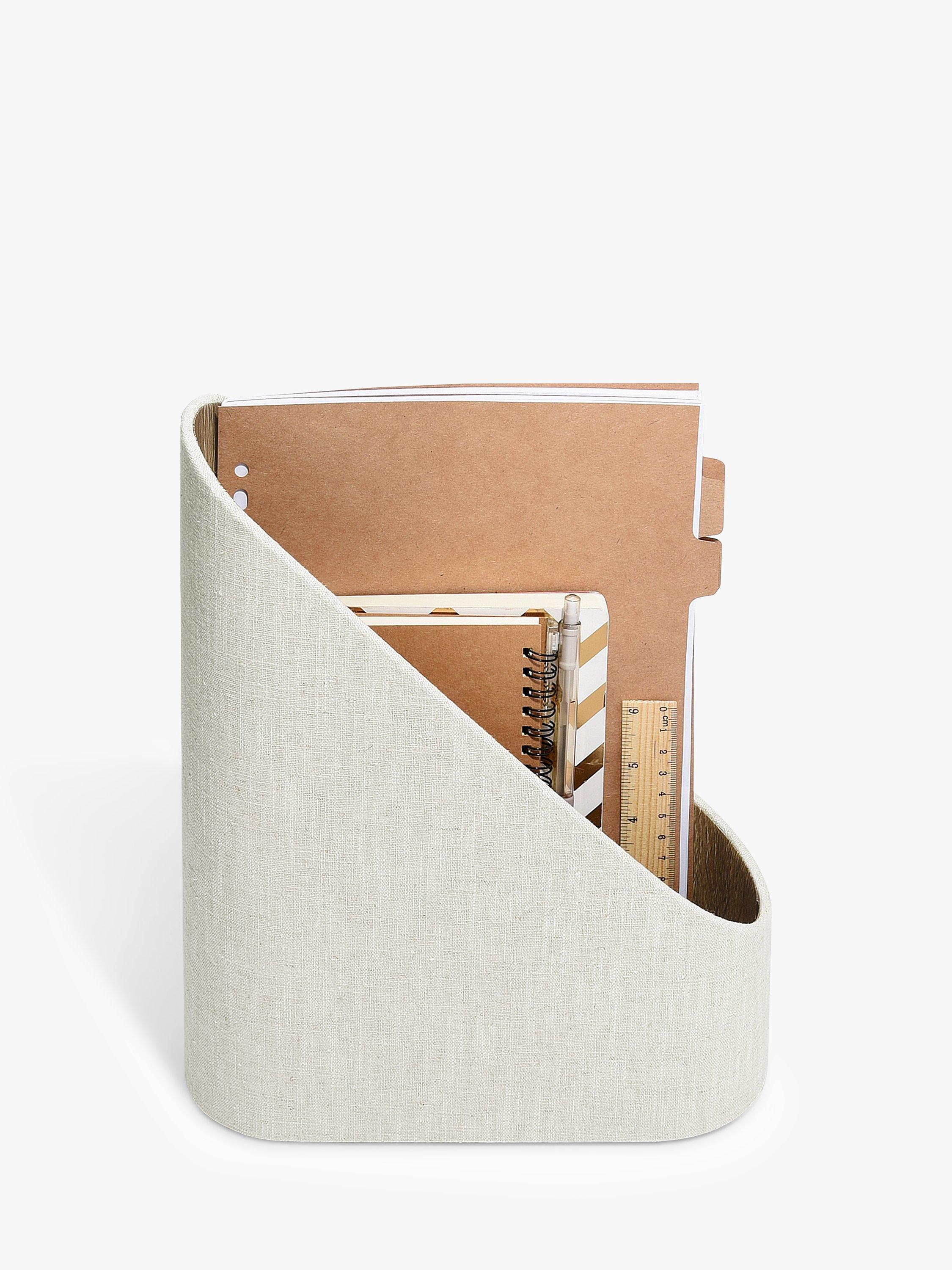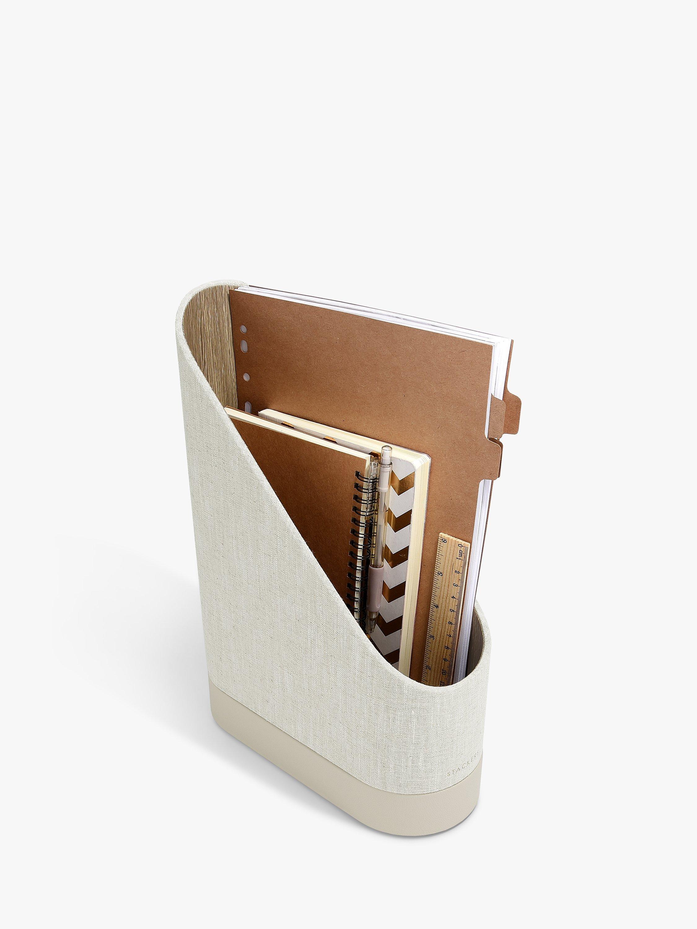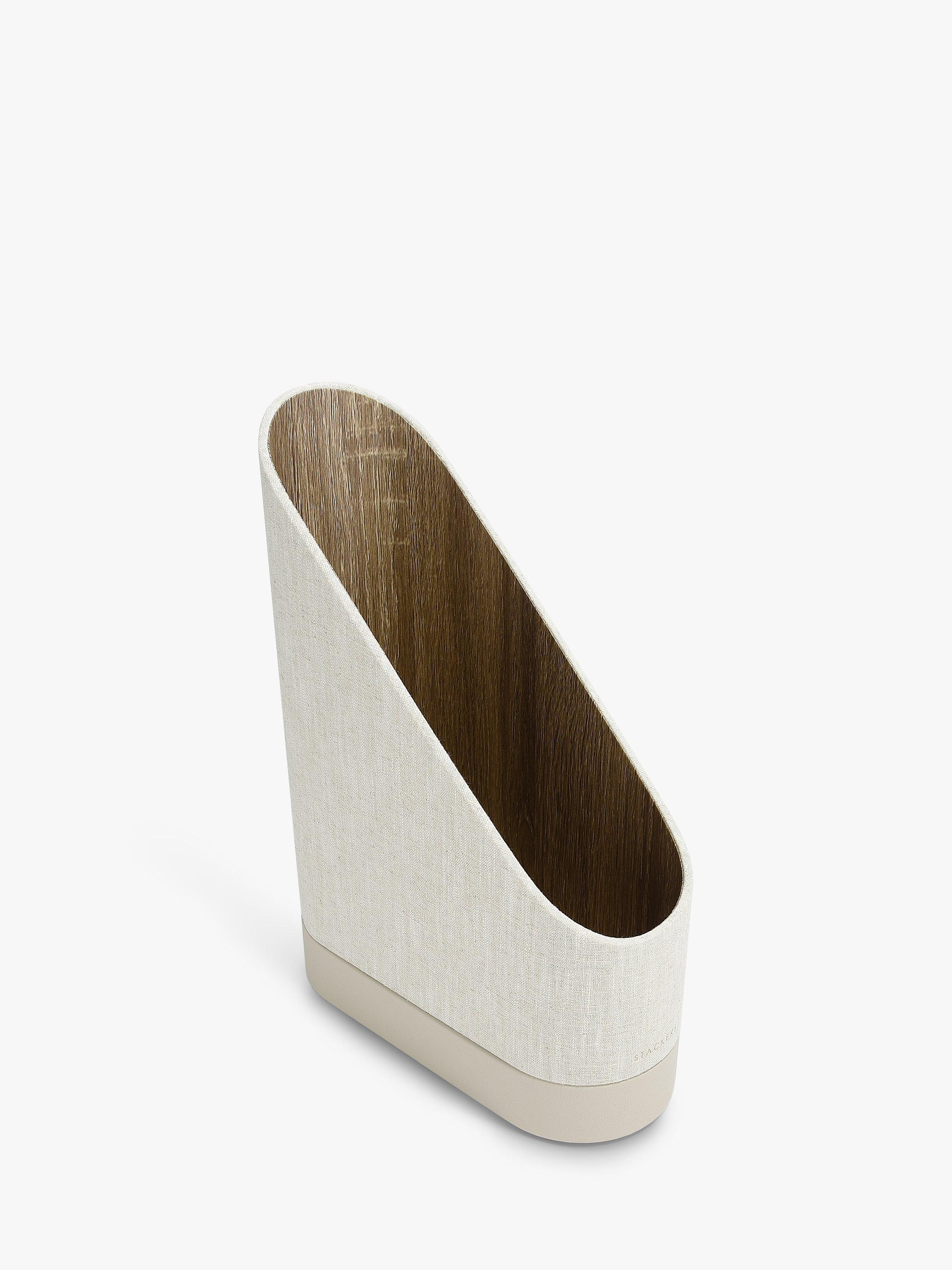 The Stackers Magazine File is a great addition to your home office or living space to tidy away magazines or documents. With a hidden tray underneath for stationery and other smaller items. Finished in a neutral Oatmeal PU and Linen mix, to complement your home aesthetic.