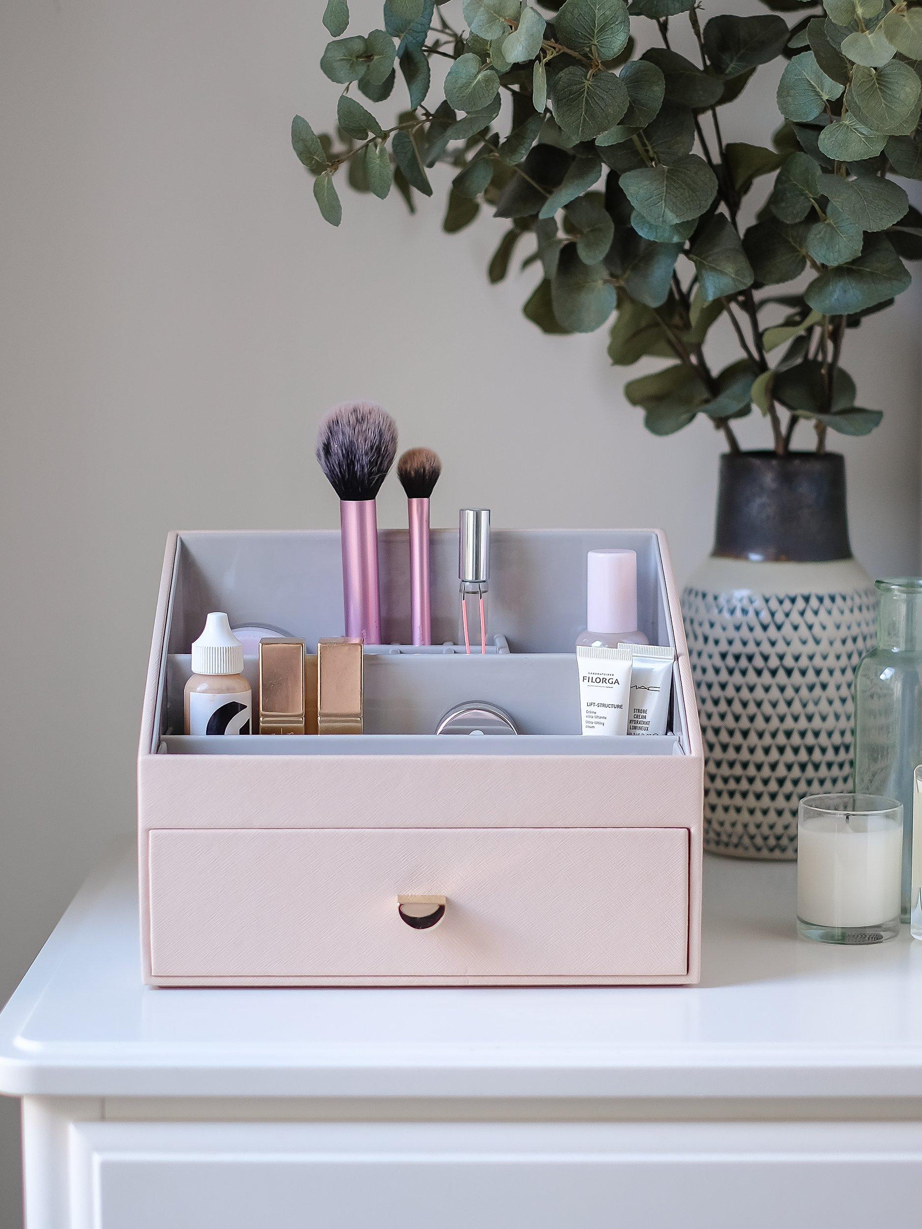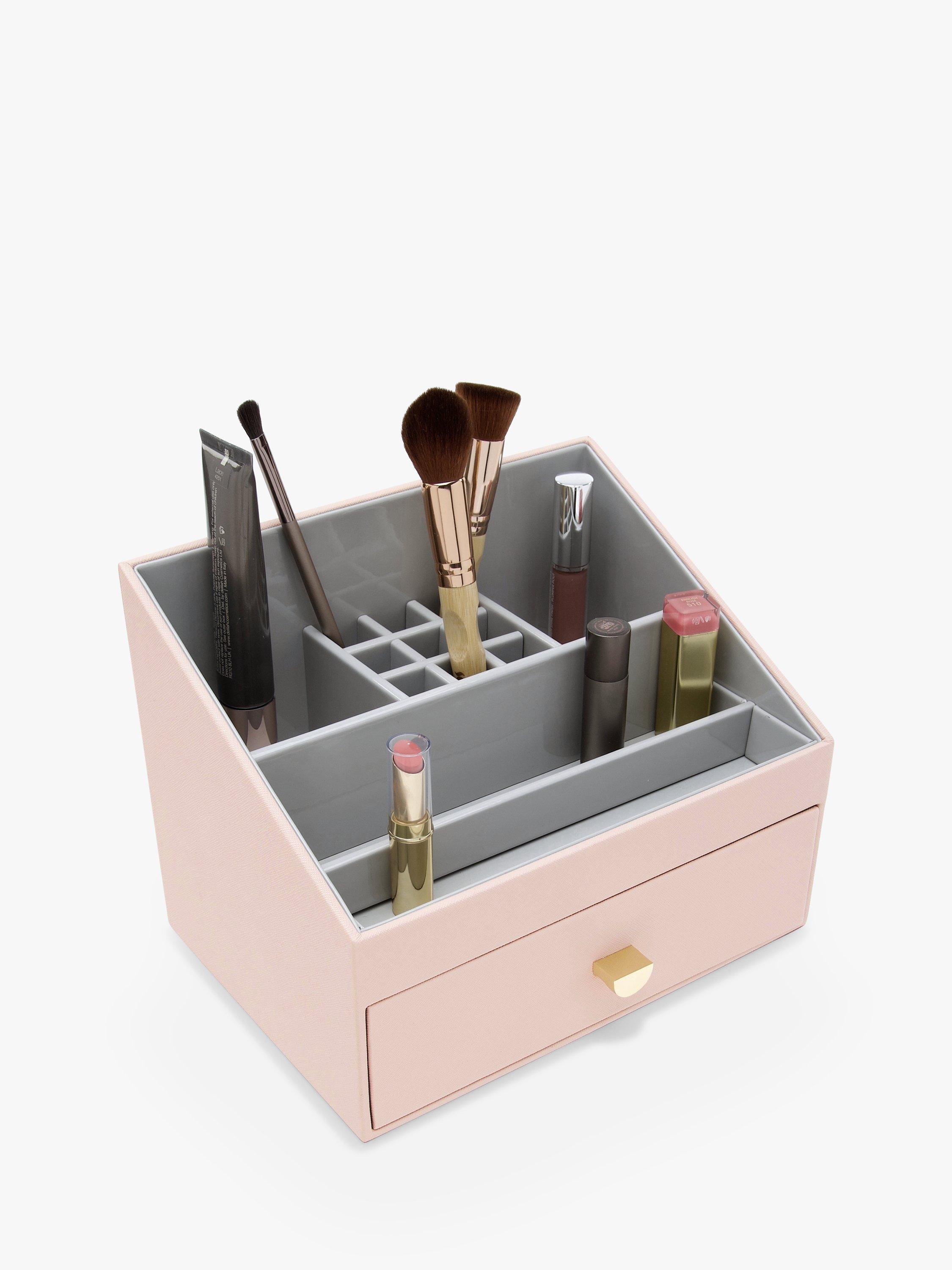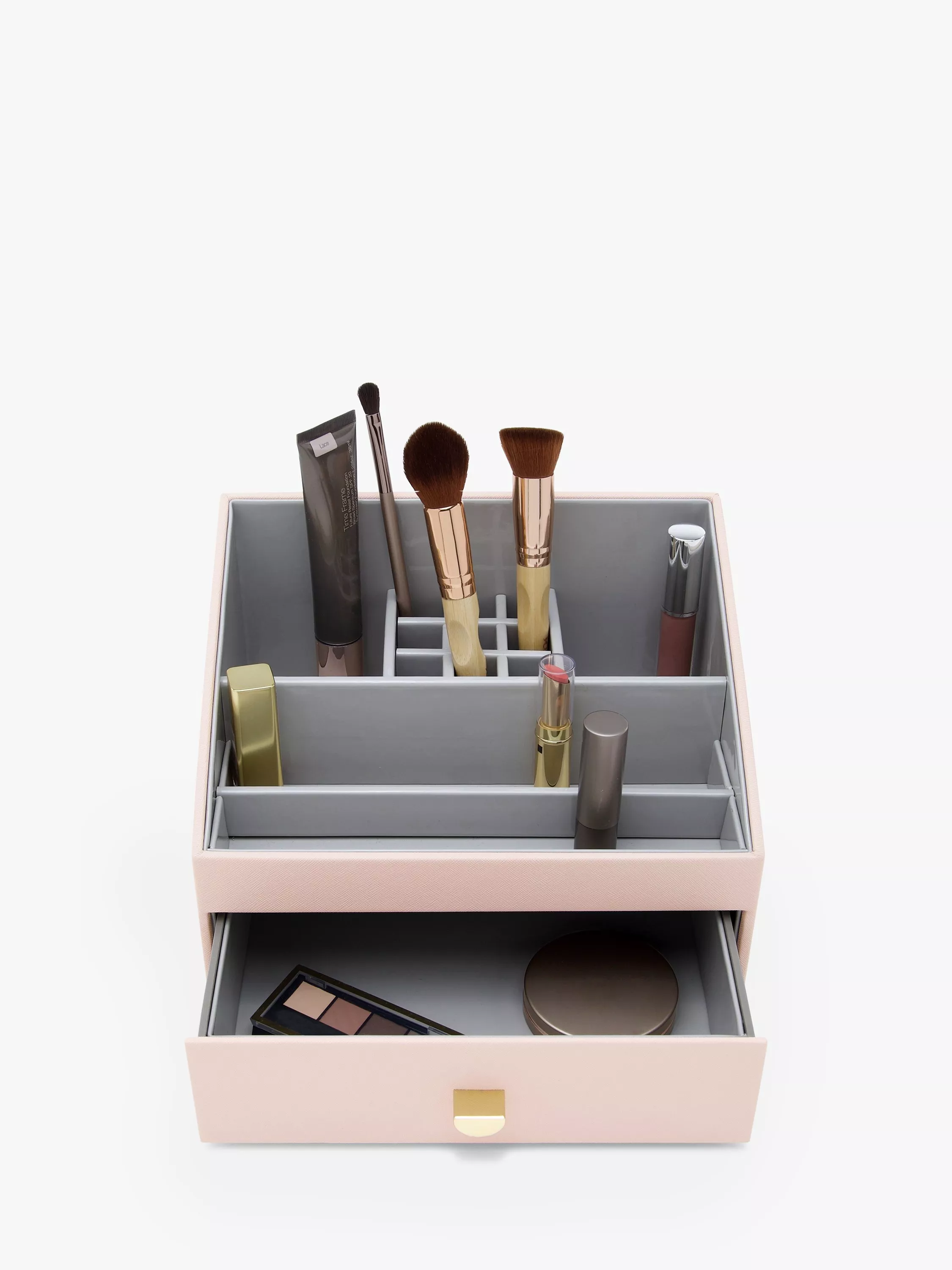 The Stackers Makeup Organiser features an open caddy with multiple compartments to hold all your everyday makeup from brushes to foundation to lipsticks. There is also a pull-out drawer ideal for your larger palettes and makeup items. The lining can be wiped clean and the organiser has been designed to fit with the Makeup Drawer allowing you to add additional drawers if and when your collection grows.