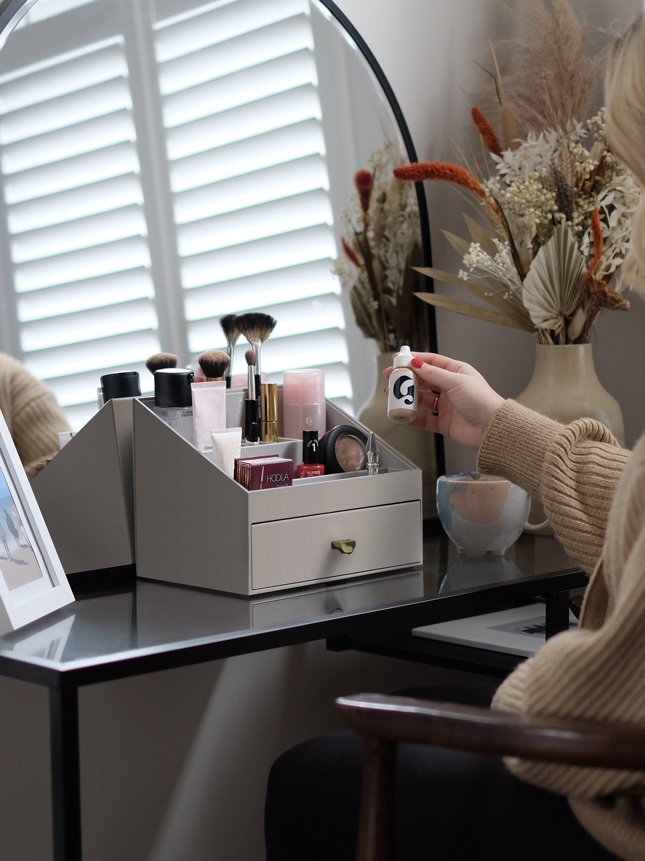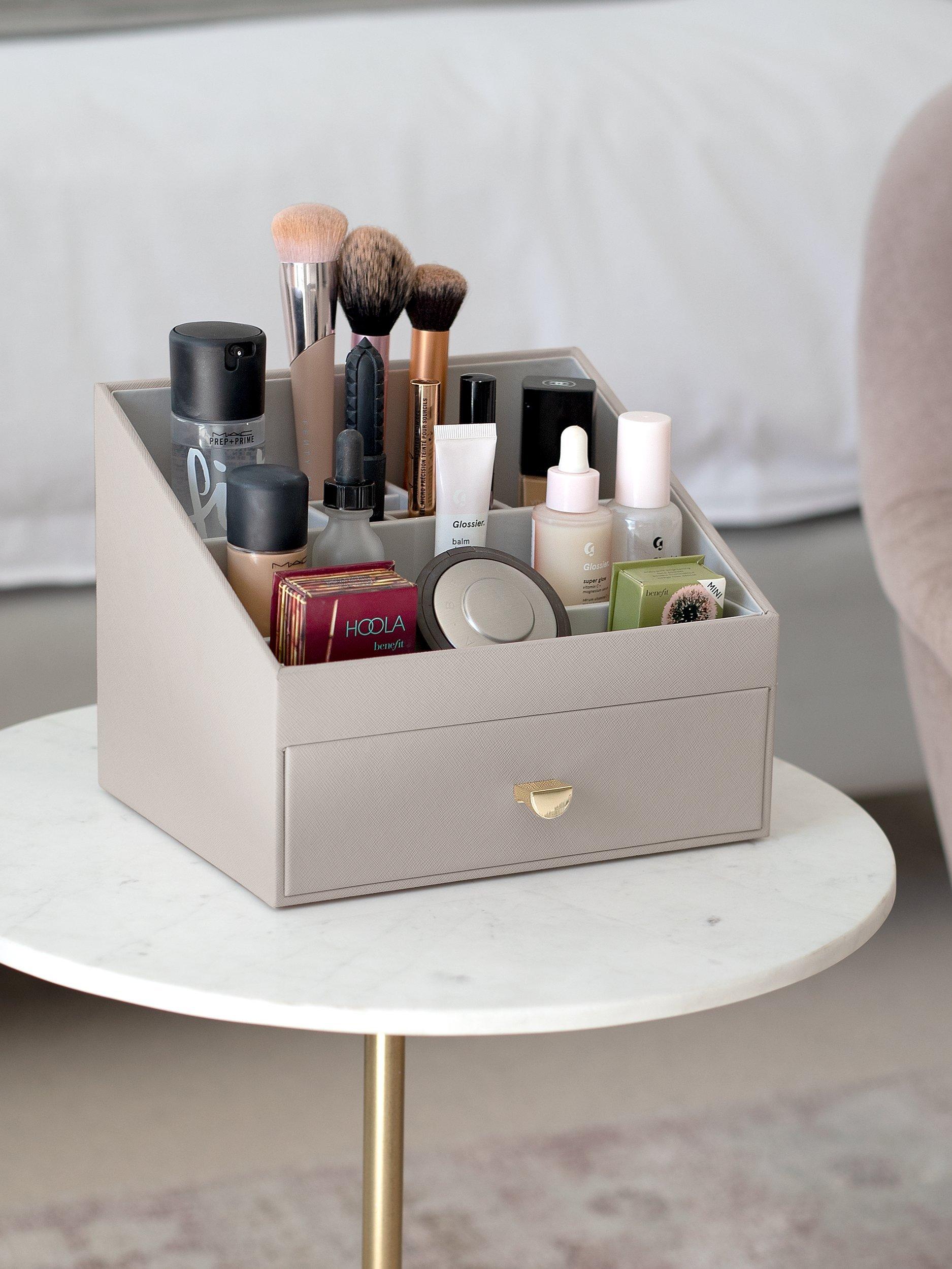 The Stackers Makeup Organiser features an open caddy with multiple compartments to hold all your everyday makeup from brushes to foundation to lipsticks. There is also a pull-out drawer ideal for your larger palettes and makeup items. The lining can be wiped clean and the organiser has been designed to fit with the Makeup Drawer allowing you to add additional drawers if and when your collection grows.
