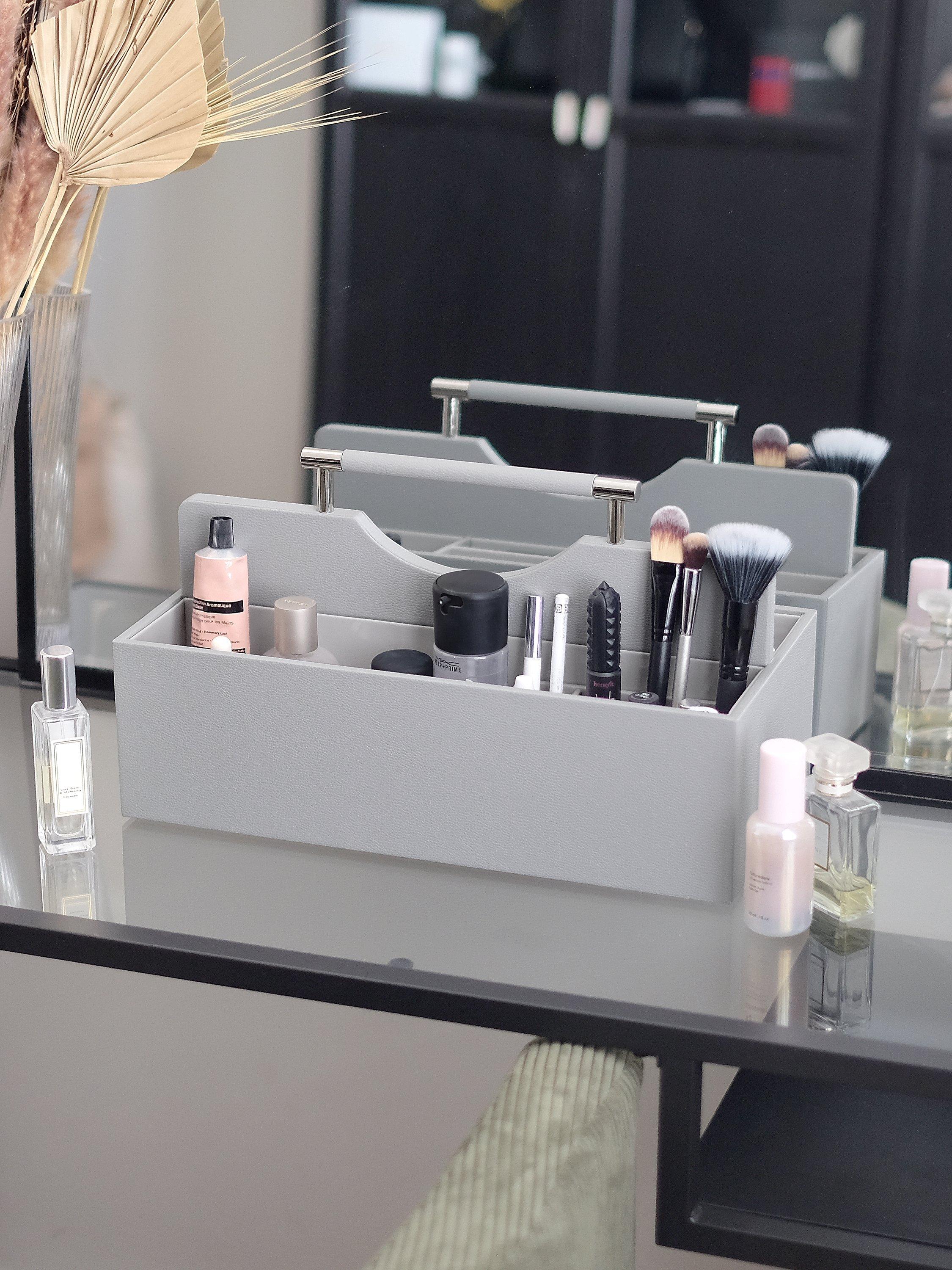 In a caddy style that's ideal for displaying or carrying around, this box has plenty of room for all your makeup essentials.
