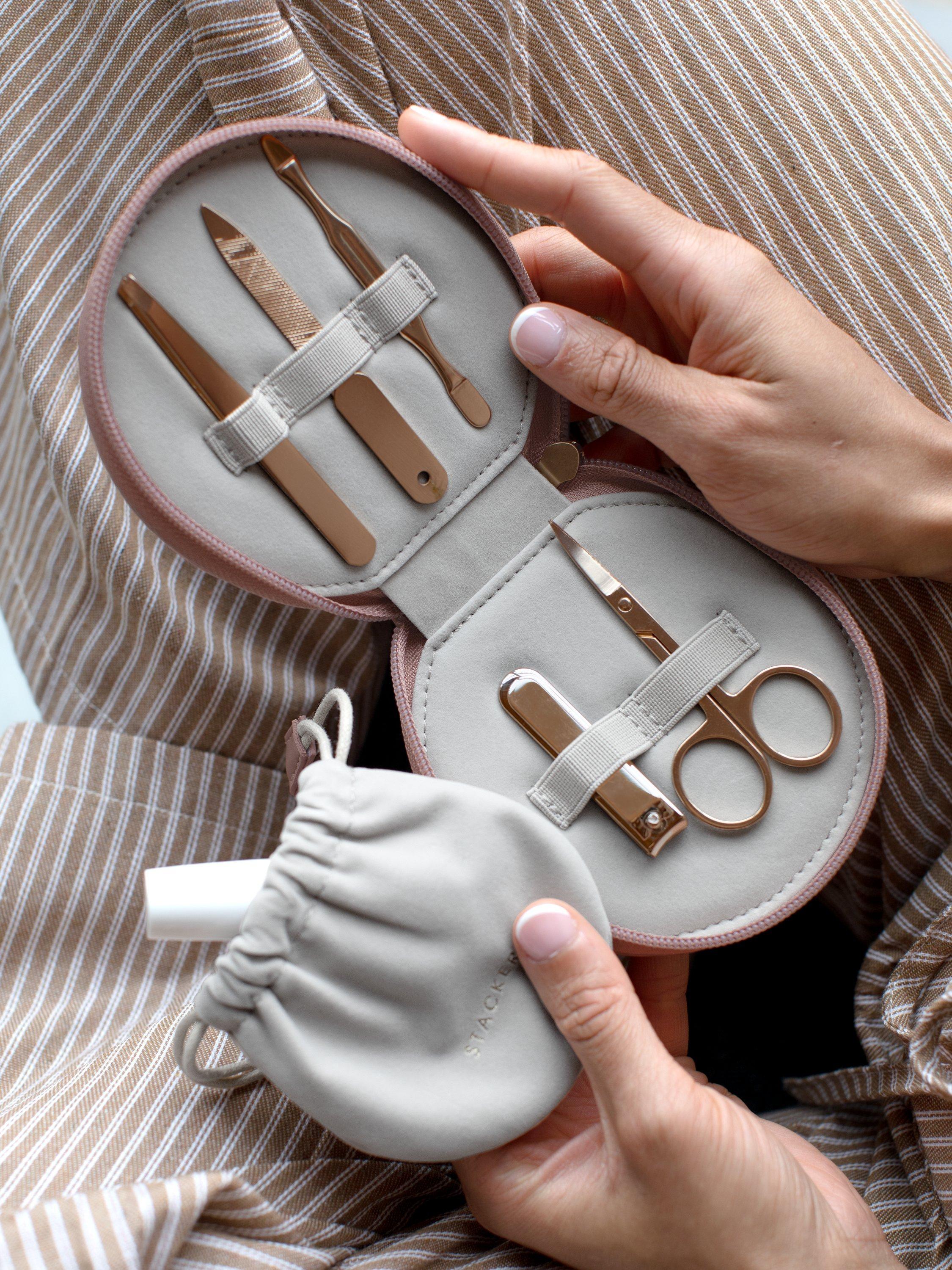 The Manicure Set contains all the essentials to keep your nails perfectly manicured on-the-go. The 5 piece set consists of scissors, nail clippers, tweezers, a cuticle pusher and nail file, as well as an additional separate draw-string pouch. The elasticated loops keep tools in place, whilst the velvet lining and faux-leather exterior give it a luxurious feel. The compact size and zip fastening make it a perfect beauty gift and is ideal for travel or keeping in a washbag or handbag.