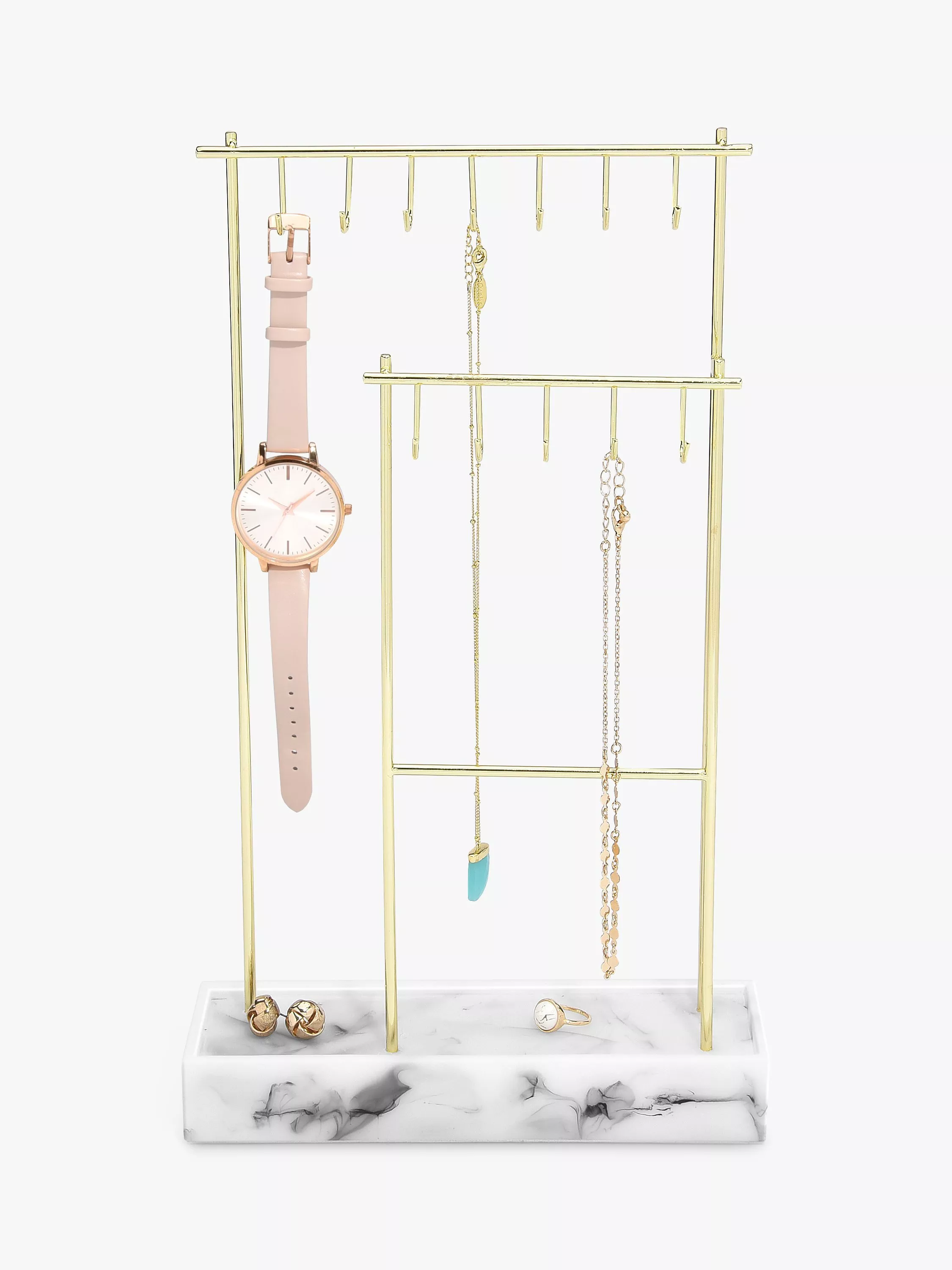 This large rose gold-finish 12 hook hanger with a marble effect base is the perfect place to store and display all of your small jewellery items. It is great for hanging statement earrings, rings, necklaces or bracelets. There is also a hidden compartment in the base of the stand, which can be used for additional storage.